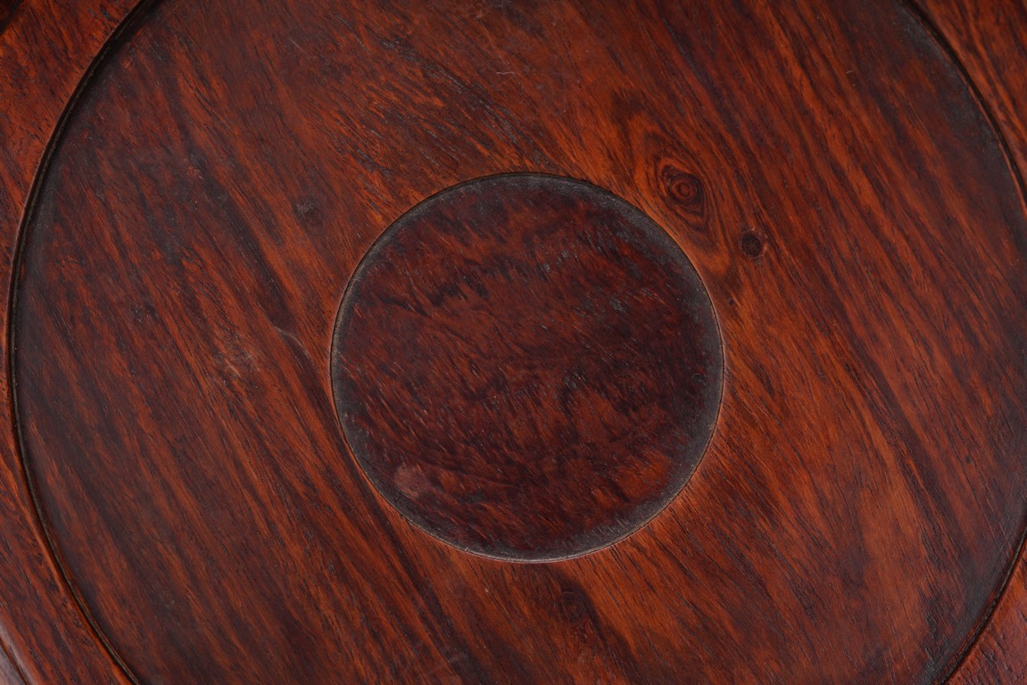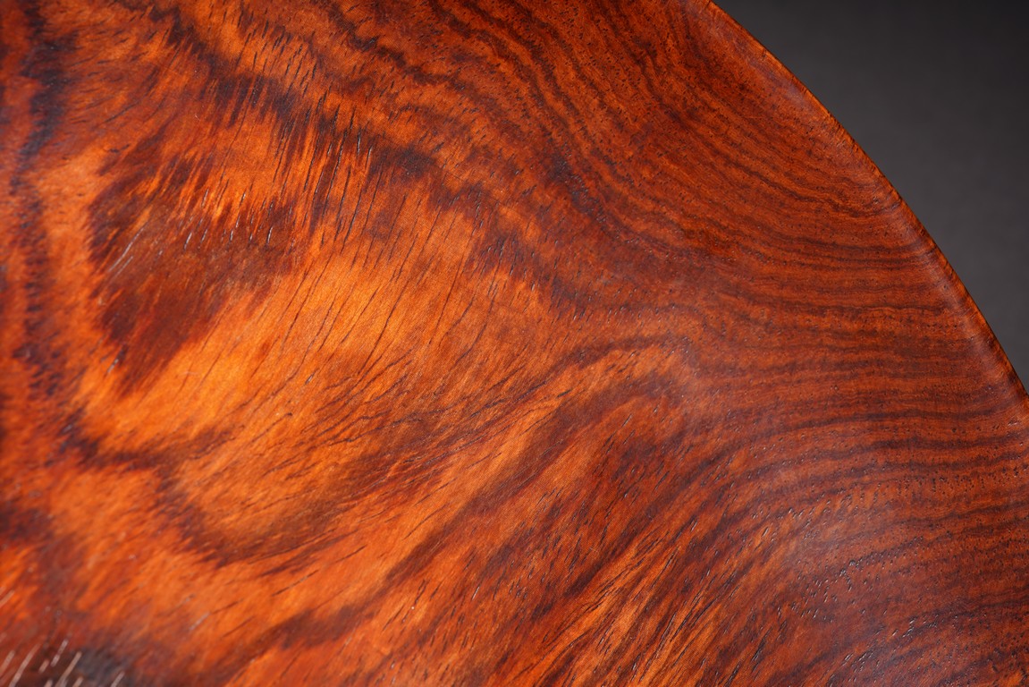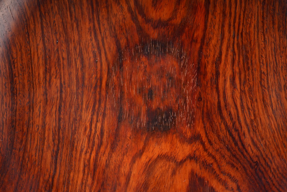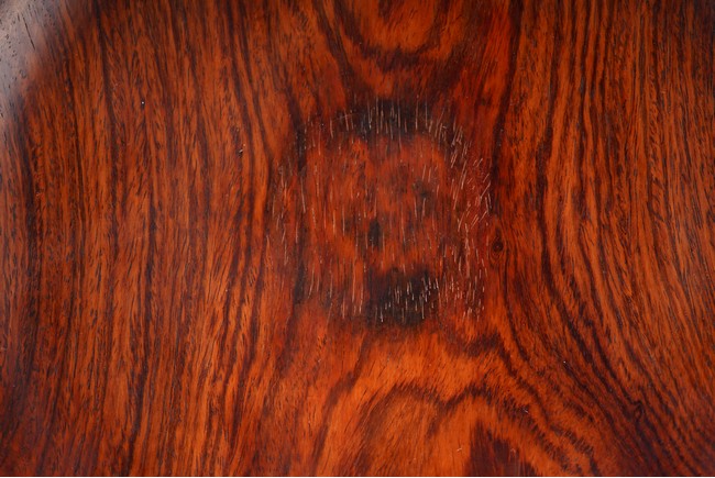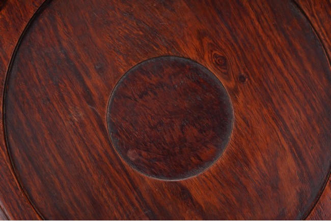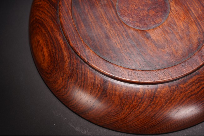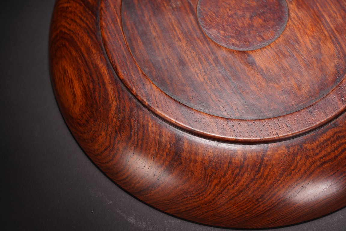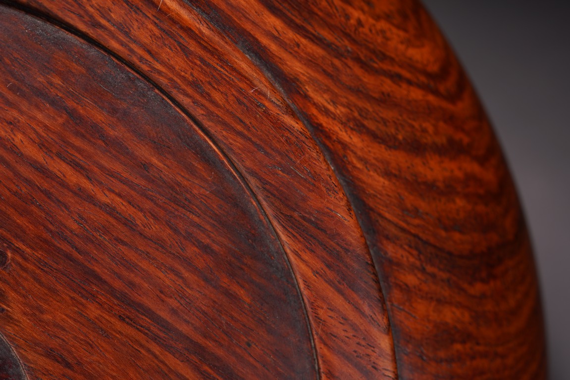 此盤用珍貴的黃花梨木整挖而成,仿傳統瓷盤形制,敞口、淺弧腹、圈足。製作精良,一氣呵成,光素無紋,唯見木頭的自然紋理,精緻美觀。整體製作工藝精湛,形制規整,黃花梨紋理清晰自然,包漿瑩潤。