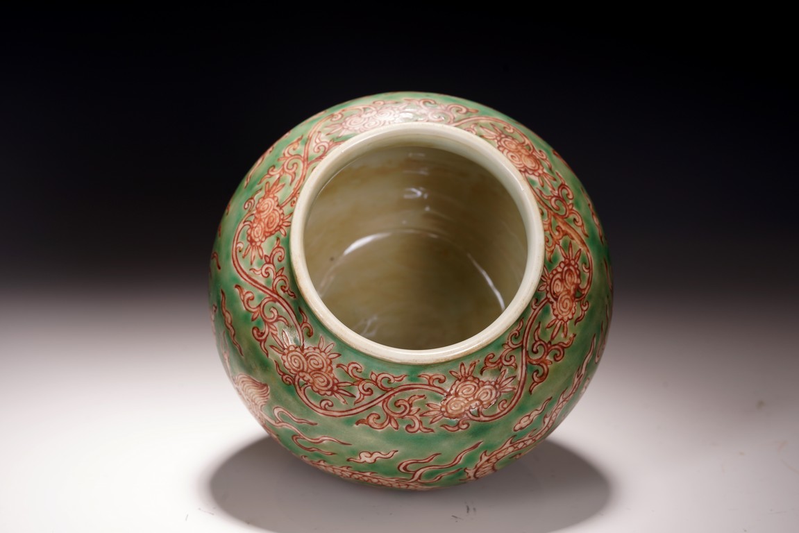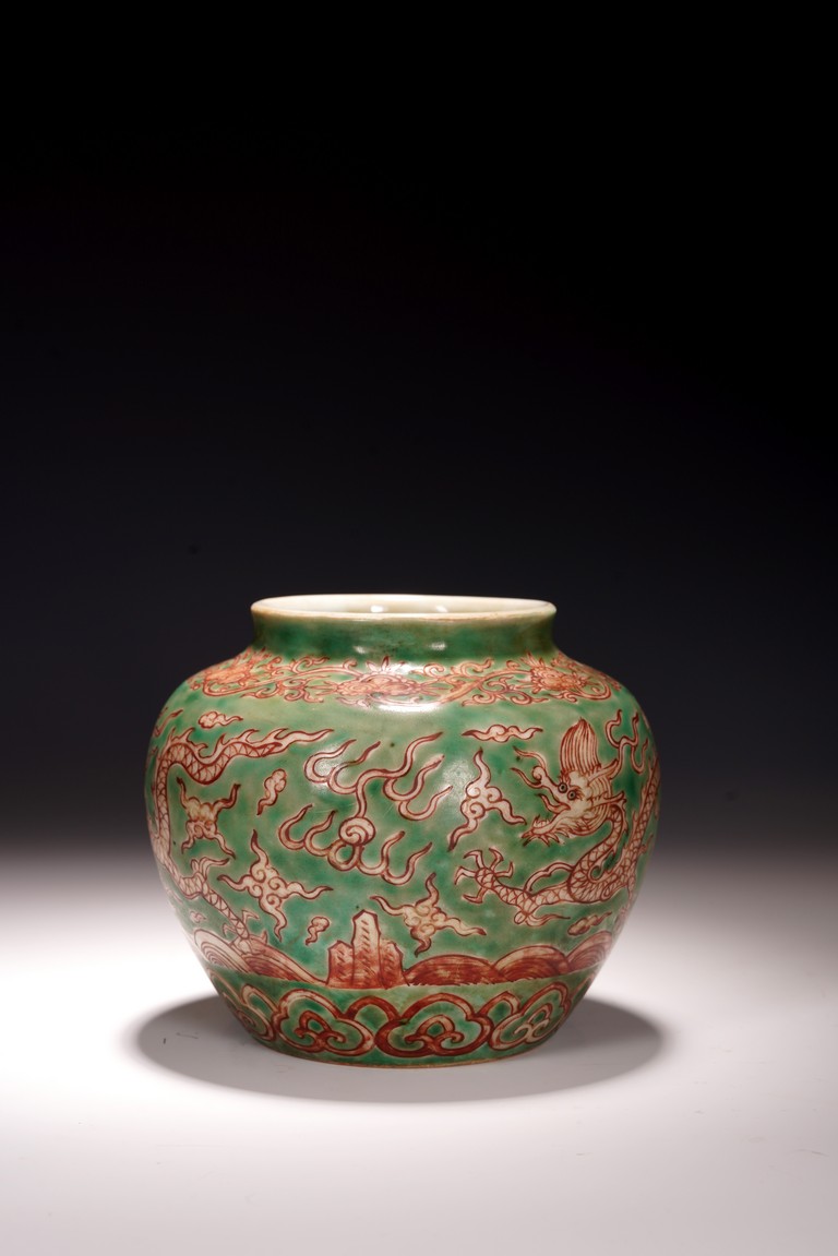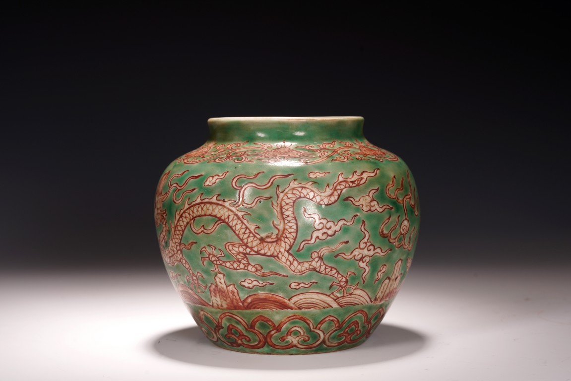 此罐圓口外撇、短束頸、豐肩、弧腹、圈足。通體以綠釉為地,上施礬紅彩。肩部繪纏枝花紋一周,足脛部繪如意云頭紋一周,腹部下方繪海水江崖紋,上繪五爪龍紋。繪製精細,構圖疏密有致,層次分明。整體胎質堅實細膩,釉面潔淨,包漿自然,形制規整,器形飽滿,施彩素雅有韻味,保存完好,值得收藏。