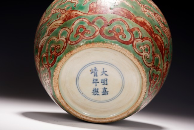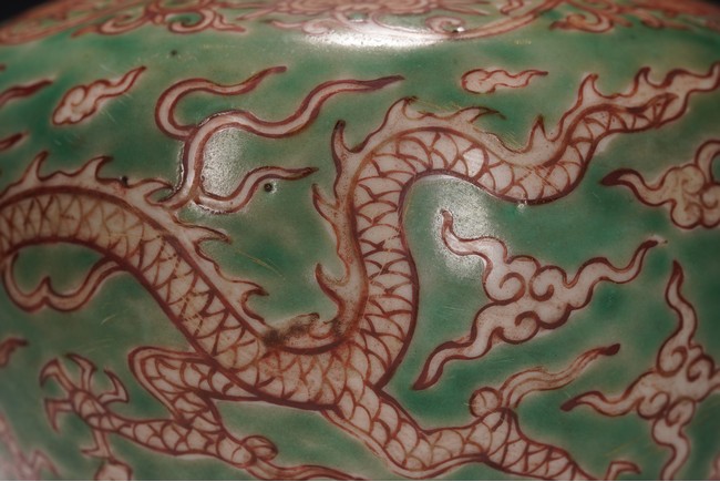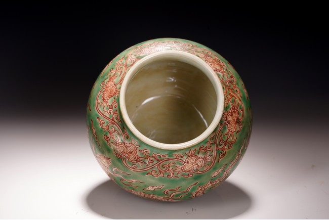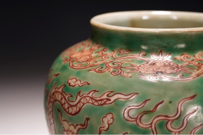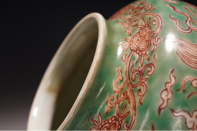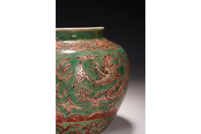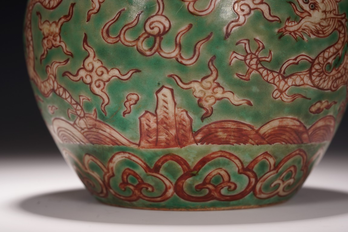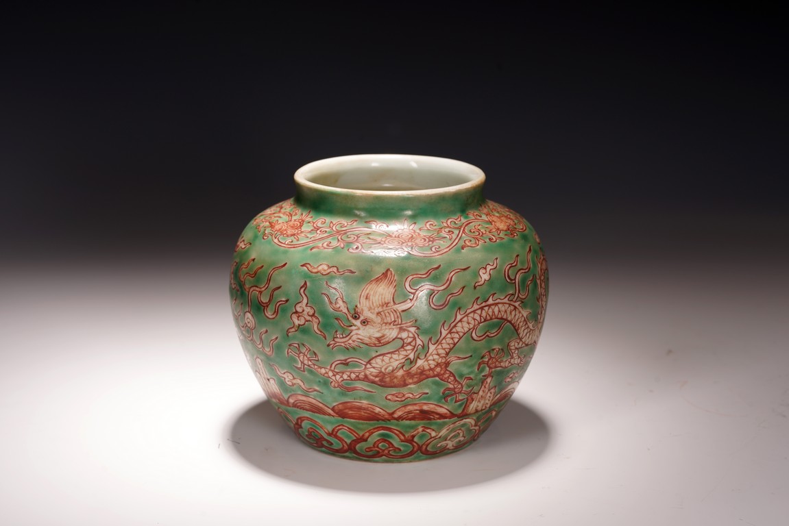 此罐圓口外撇、短束頸、豐肩、弧腹、圈足。通體以綠釉為地,上施礬紅彩。肩部繪纏枝花紋一周,足脛部繪如意云頭紋一周,腹部下方繪海水江崖紋,上繪五爪龍紋。繪製精細,構圖疏密有致,層次分明。整體胎質堅實細膩,釉面潔淨,包漿自然,形制規整,器形飽滿,施彩素雅有韻味,保存完好,值得收藏。