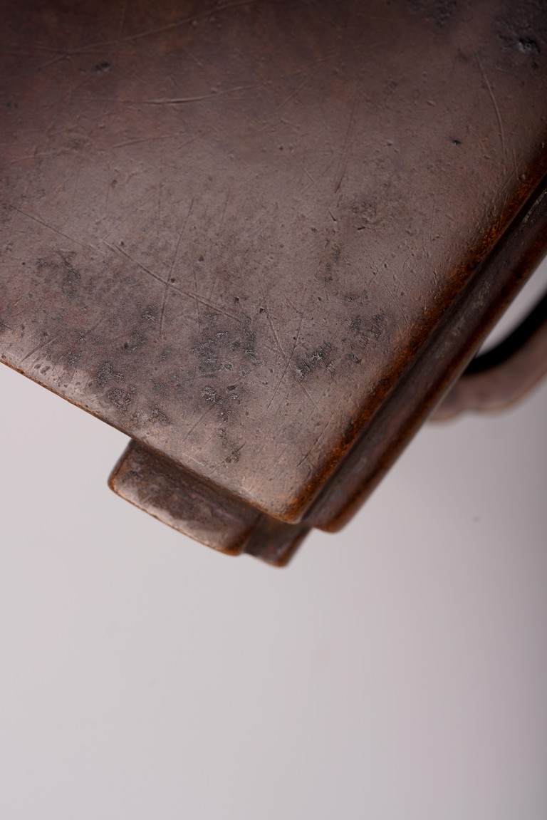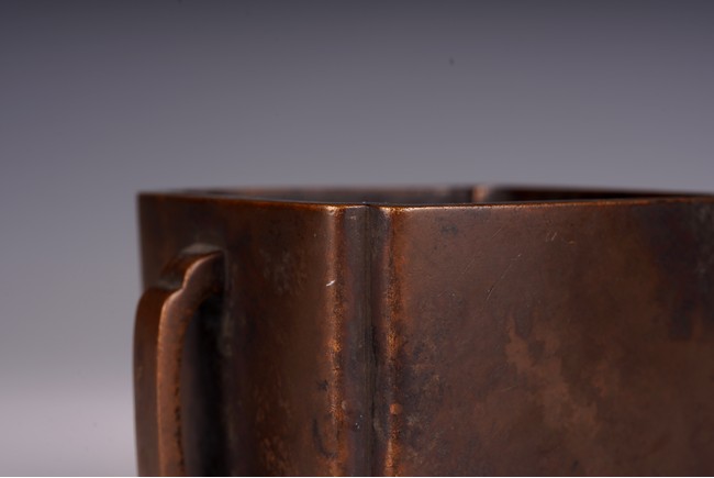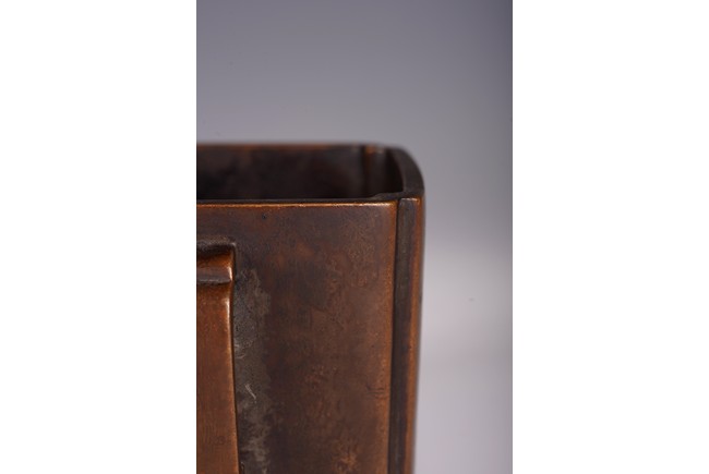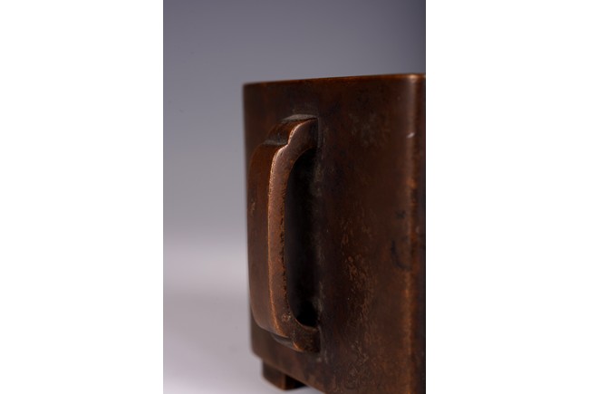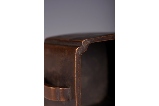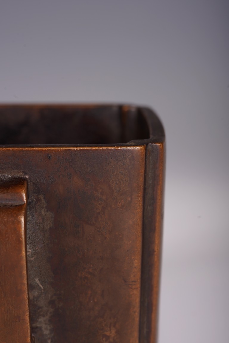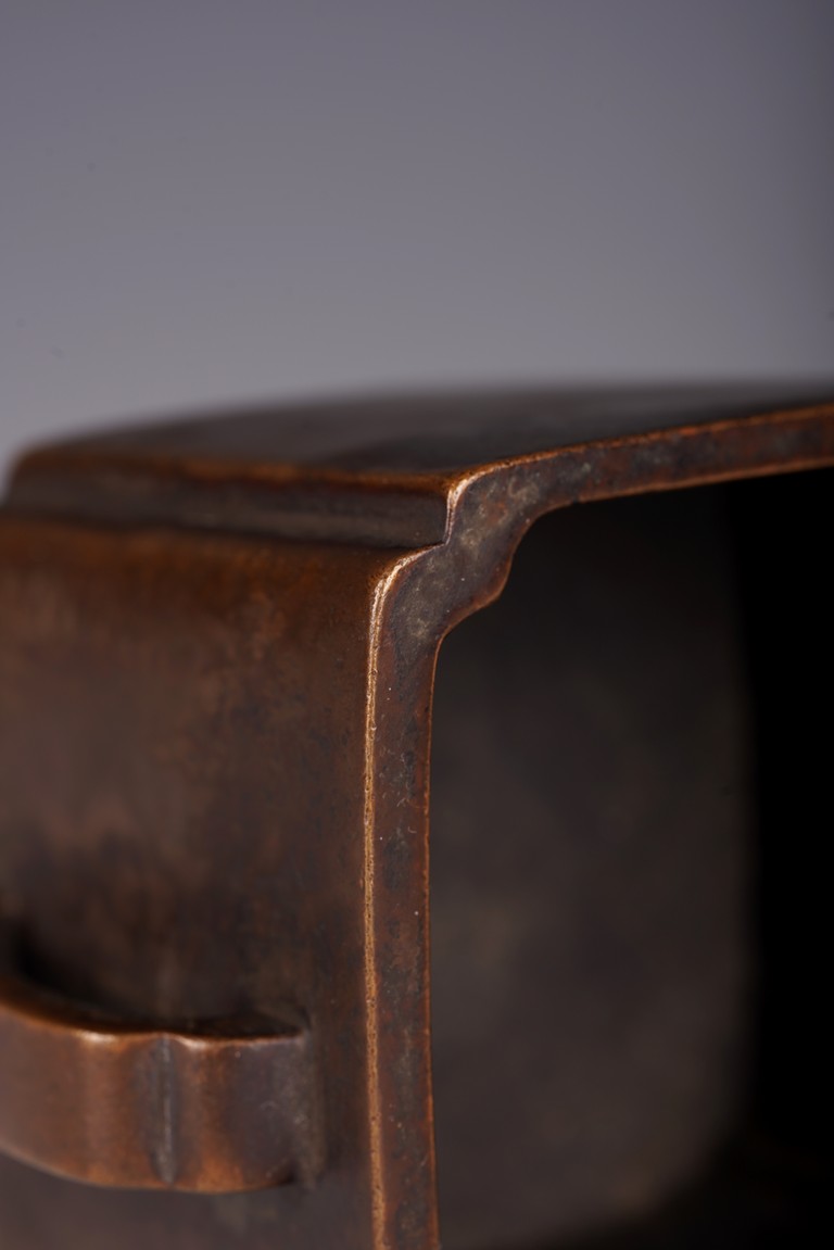 此爐以精銅為材,呈四方倭角形,底承四足,雙面飾如意耳,光素無紋。器形飽滿,周正端莊,包漿瑩潤,底落“李曲江制”款,為供奉收藏佳器。