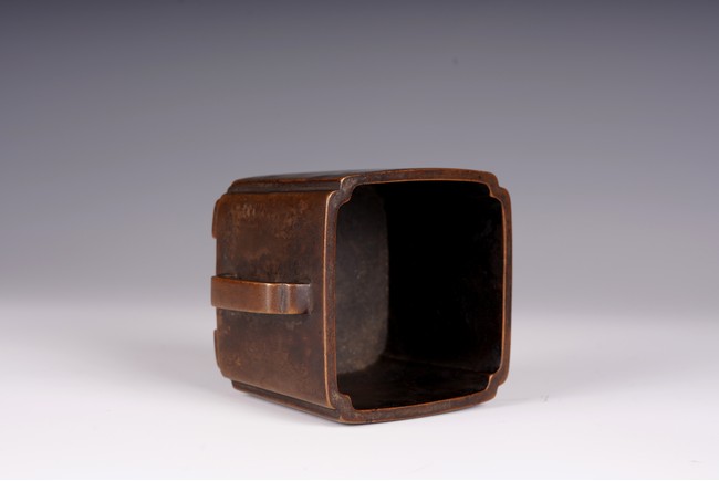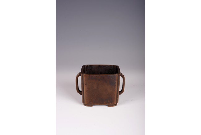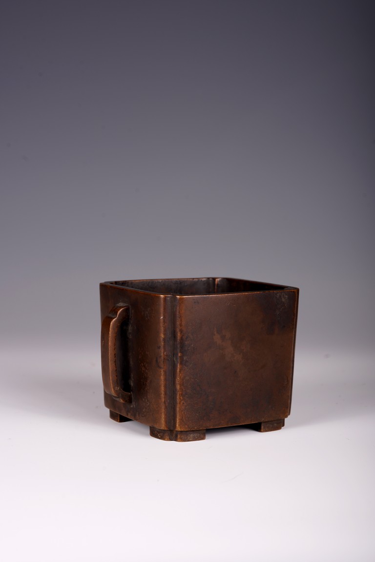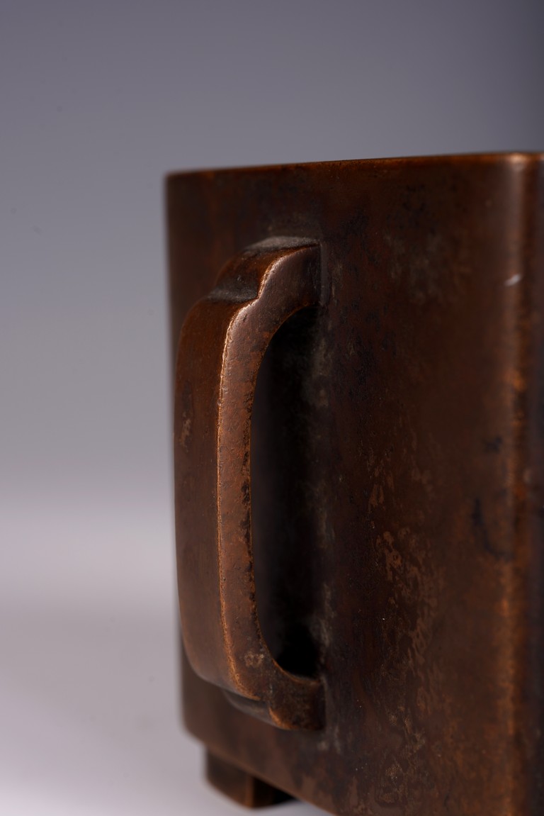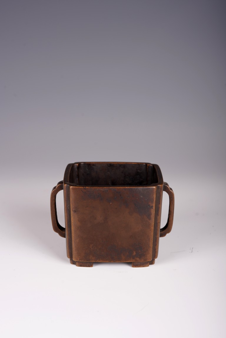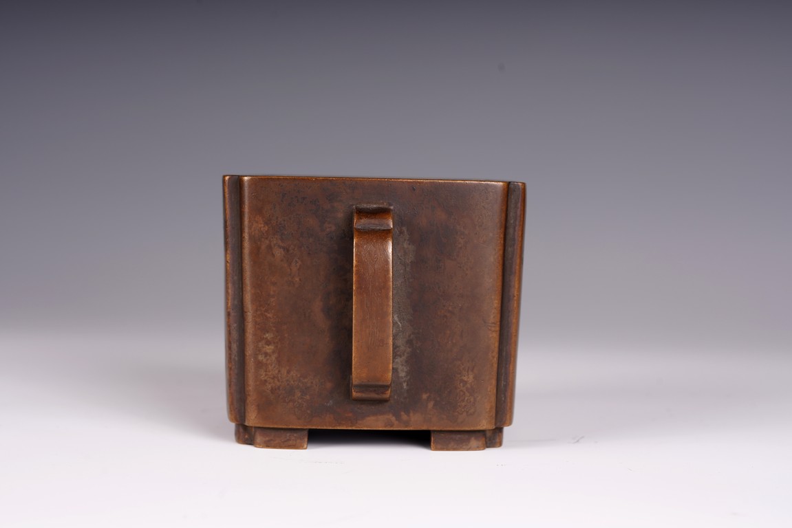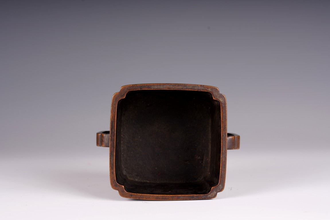 Qing Dynasty period. The square censer flanked by two arched handles, the base bearing four character mark.