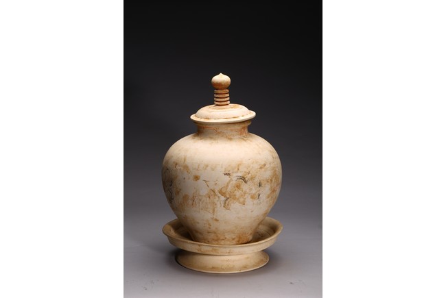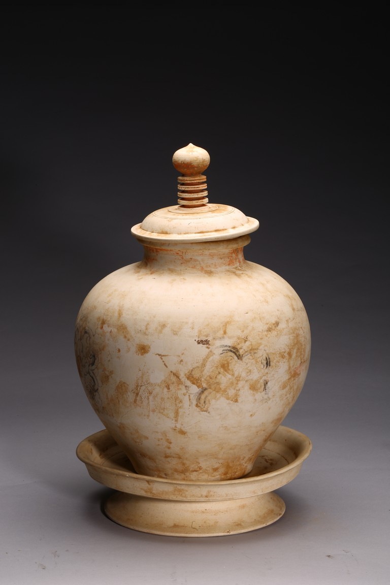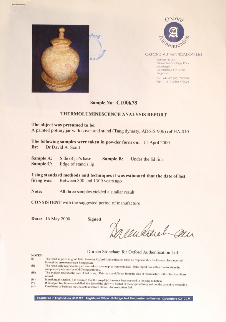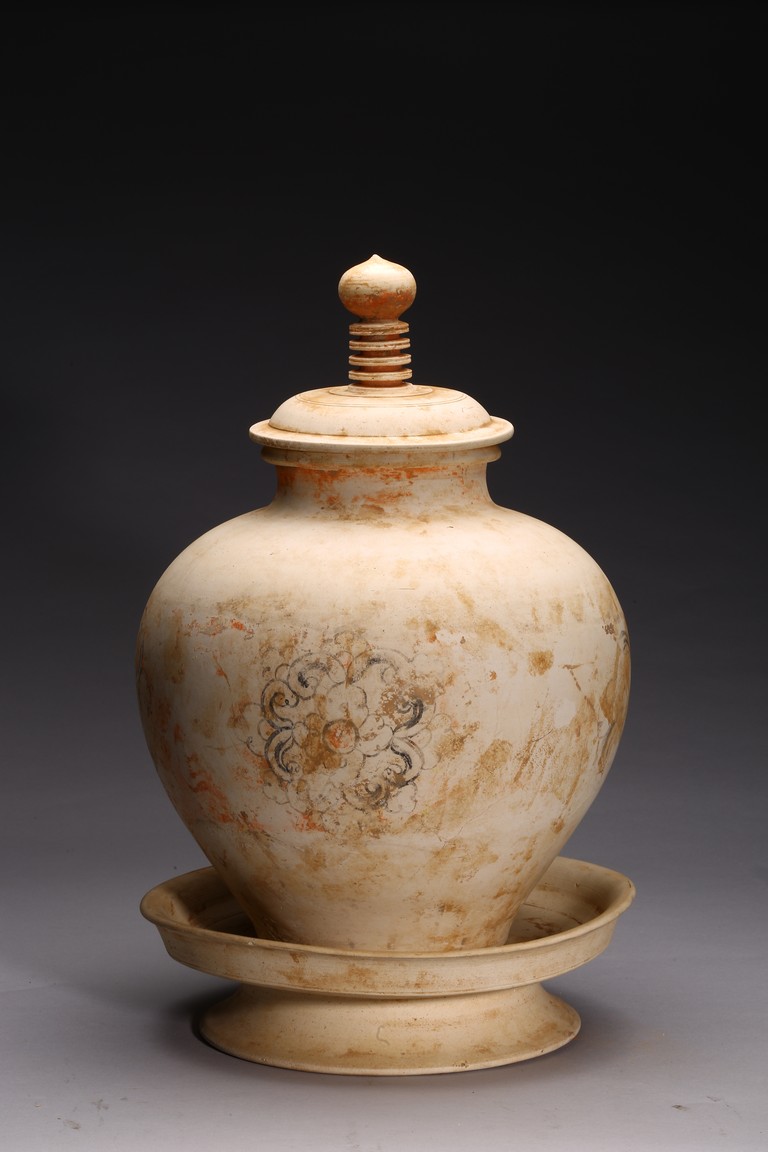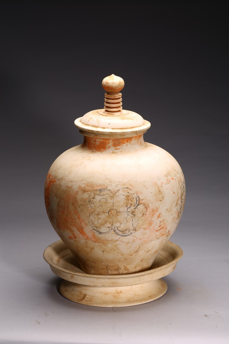 Of ovoid form, with a slightly curved foot, below a waisted neck, the conforming domed cover set with cylindrical bud knob, body painted with lobed flowers, all supported on a pottery stand, with traces of pigments. Tang Dynasty period.