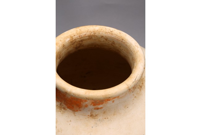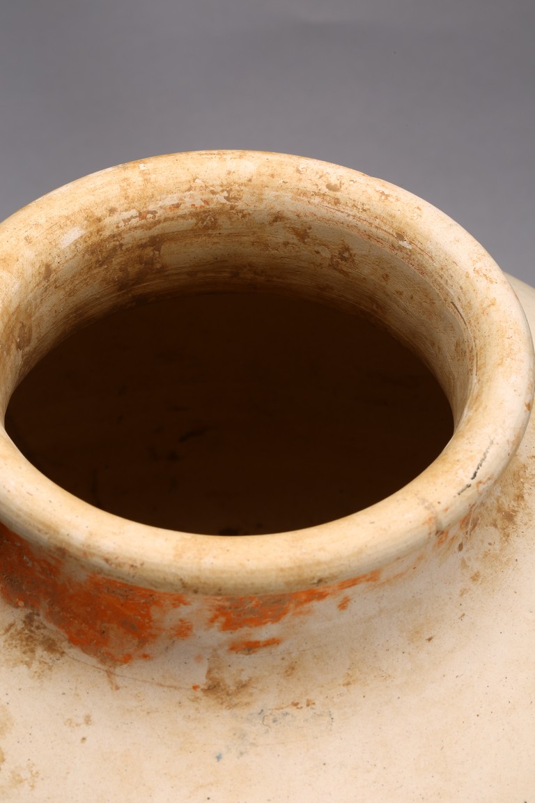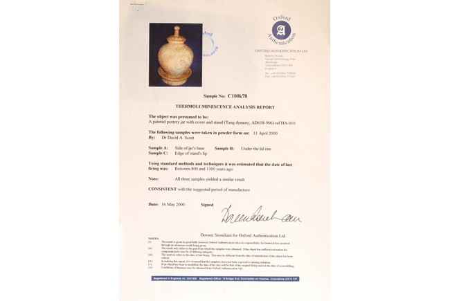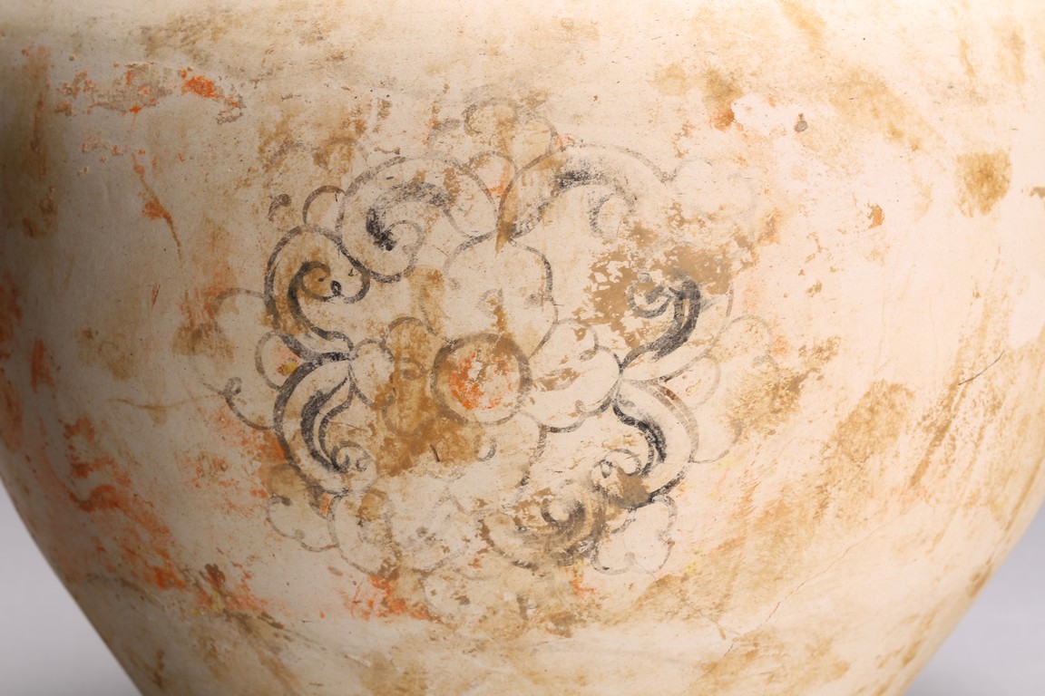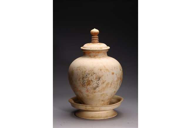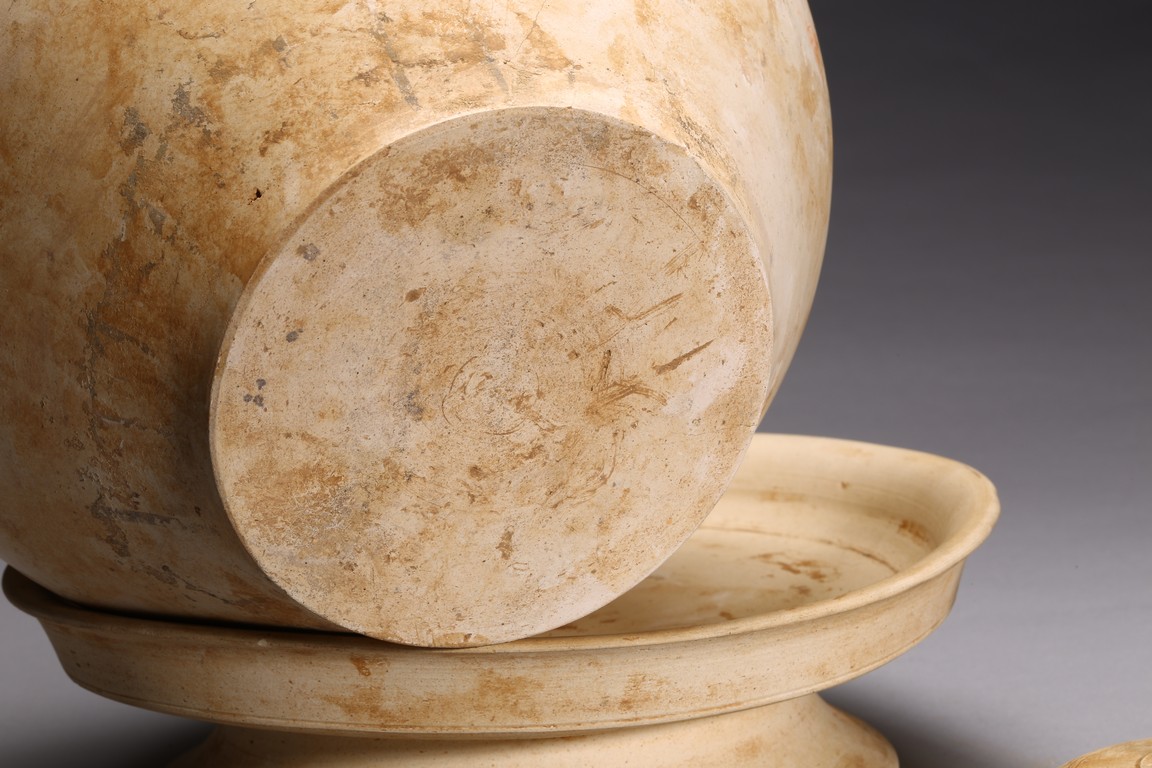 Of ovoid form, with a slightly curved foot, below a waisted neck, the conforming domed cover set with cylindrical bud knob, body painted with lobed flowers, all supported on a pottery stand, with traces of pigments. Tang Dynasty period.