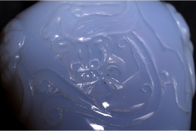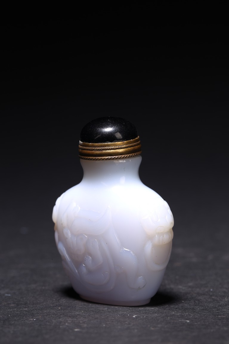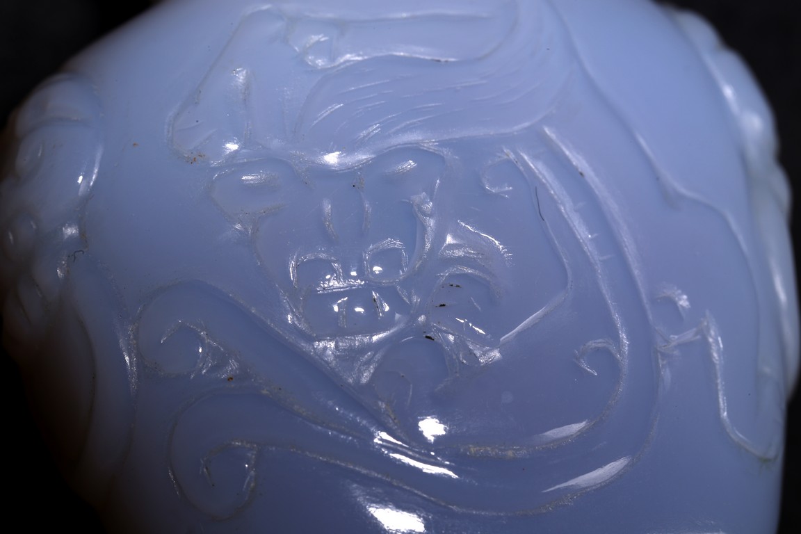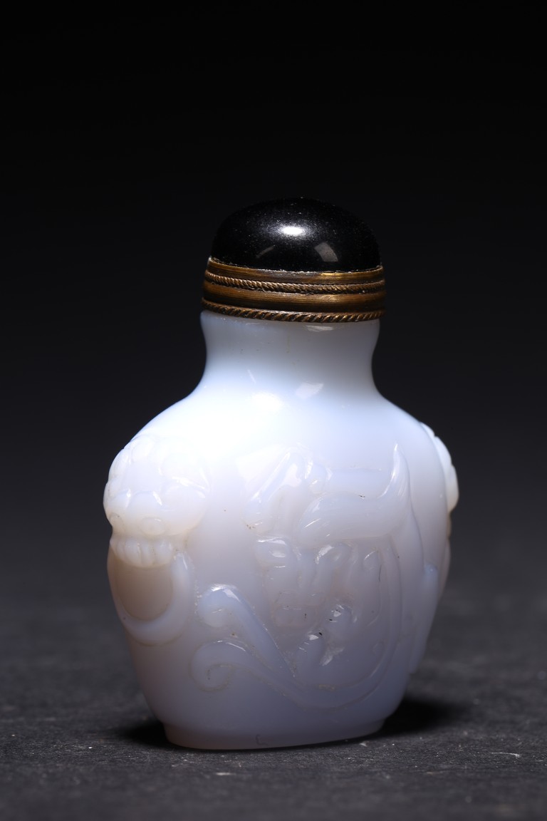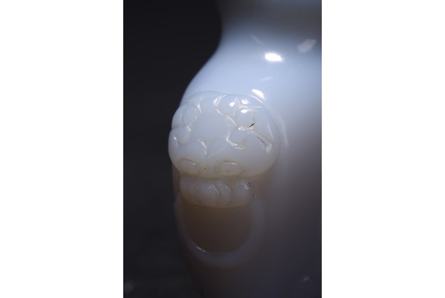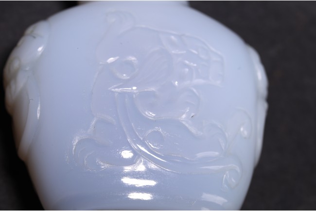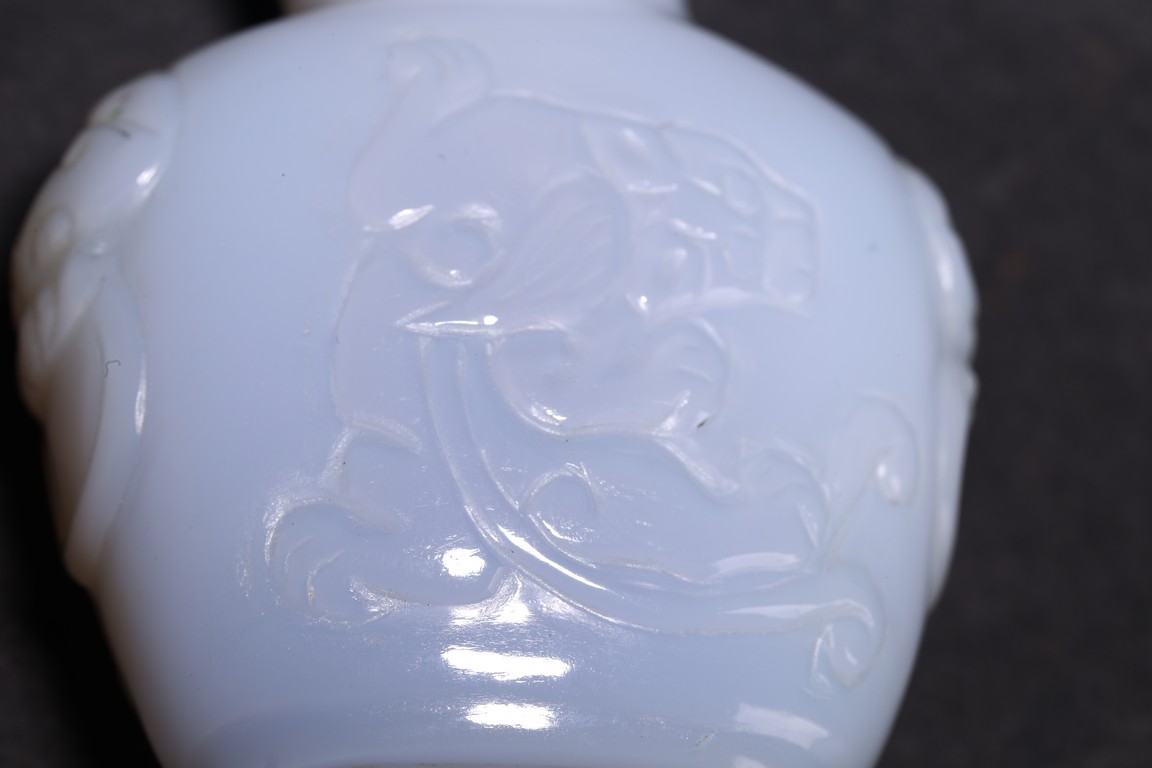 Qing Dynasty period. Carved in shallow relief with sinuous chilong and flanked by mythical beast heads, with stopper