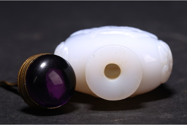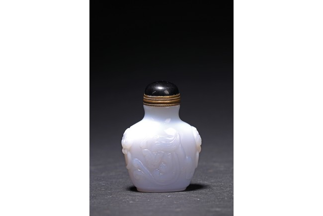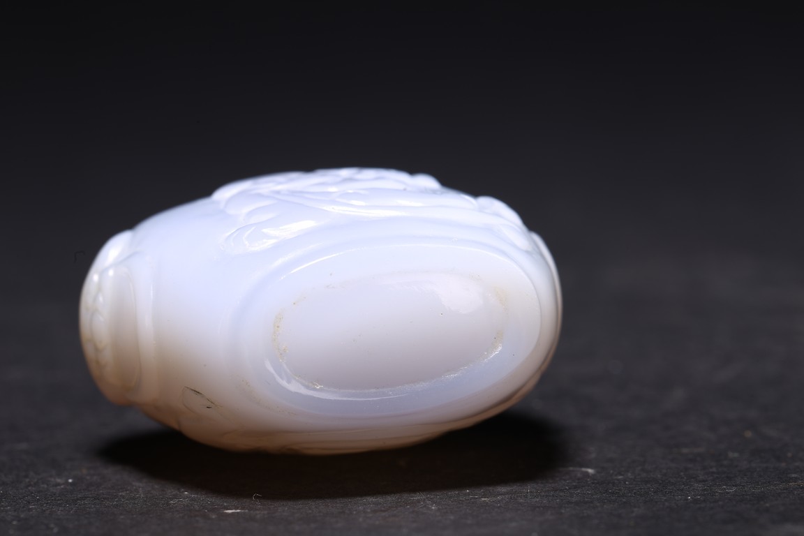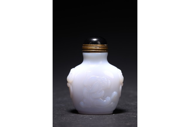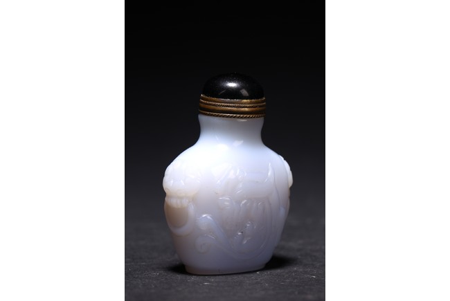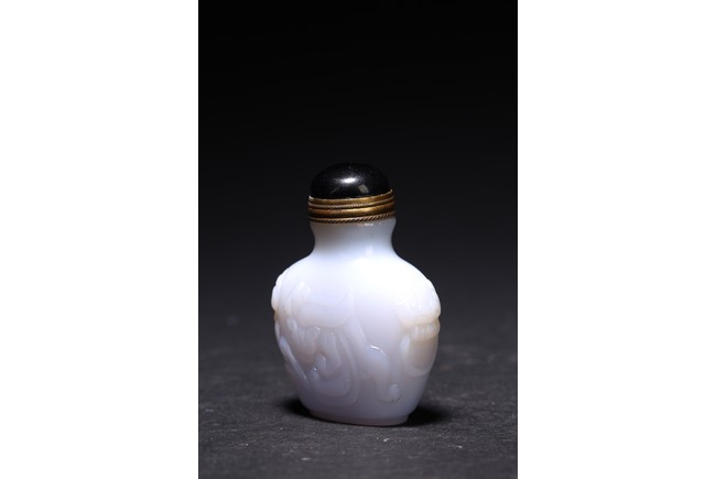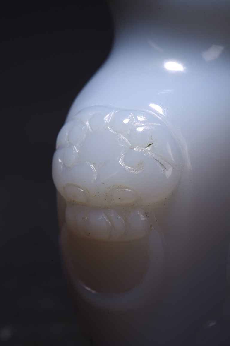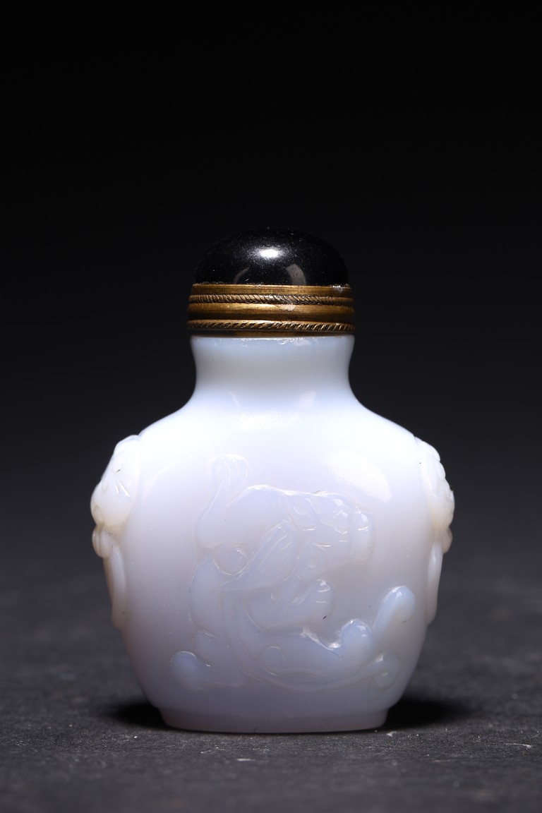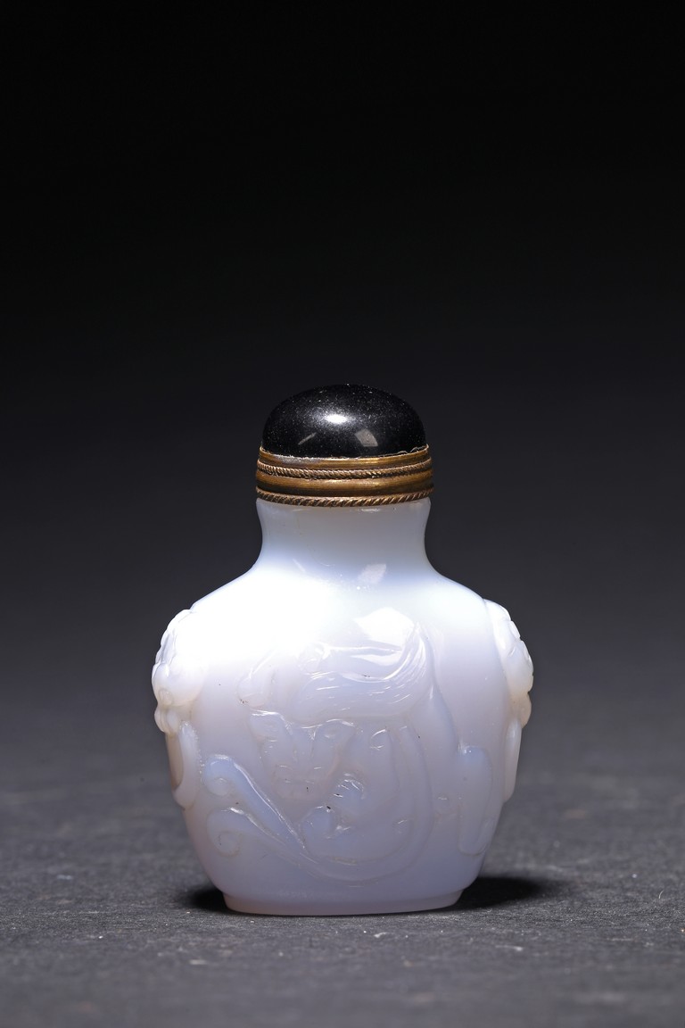 Qing Dynasty period. Carved in shallow relief with sinuous chilong and flanked by mythical beast heads, with stopper