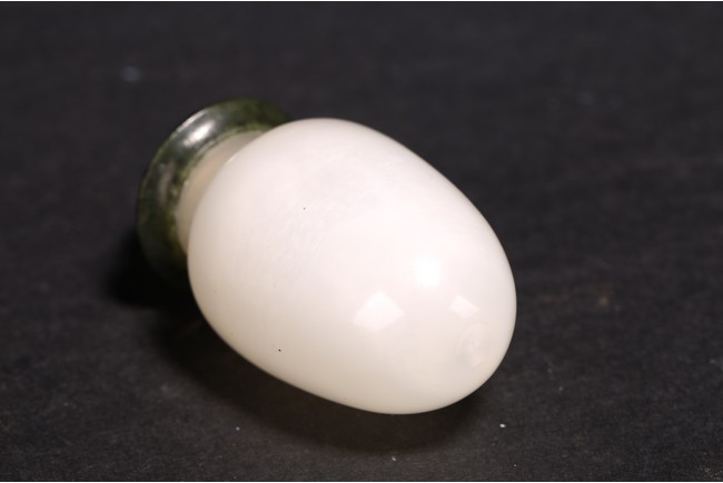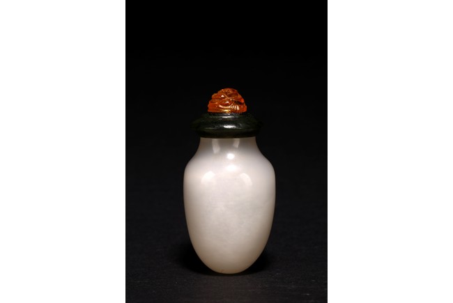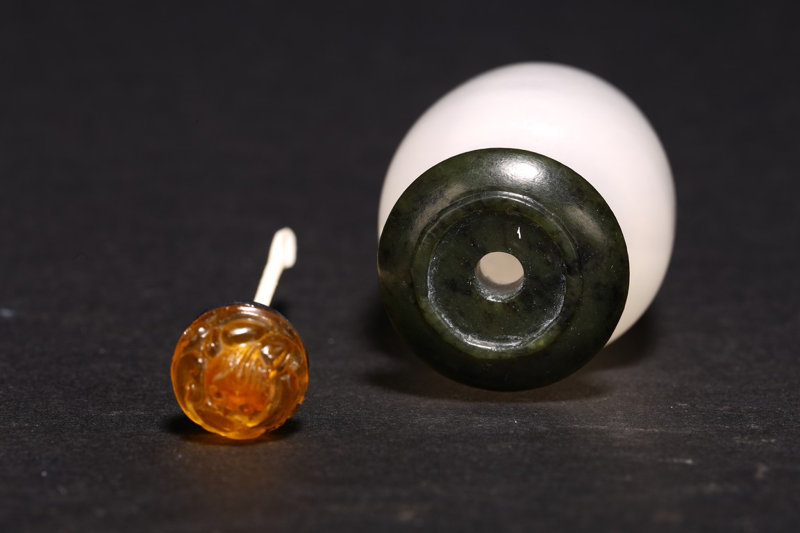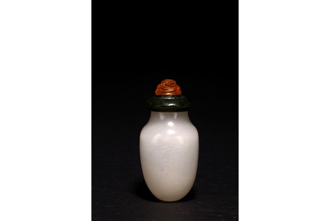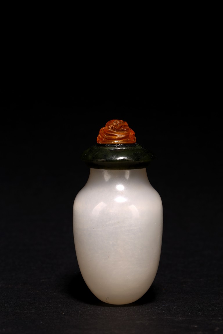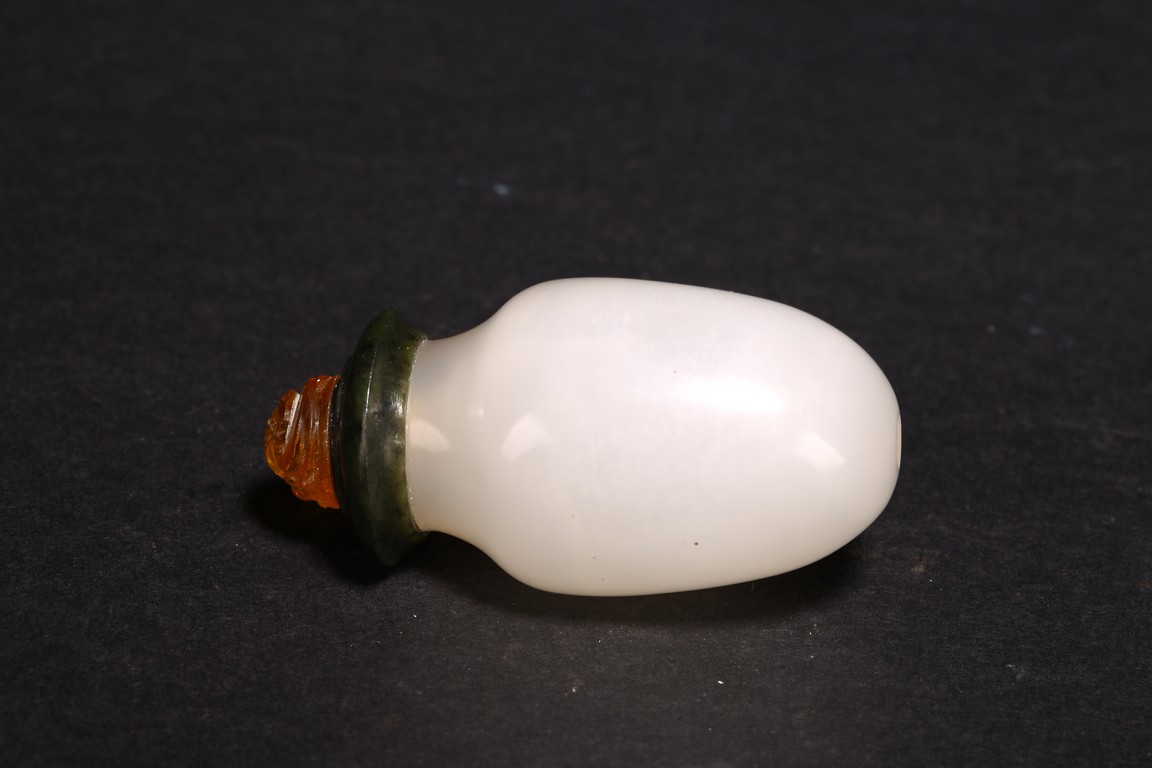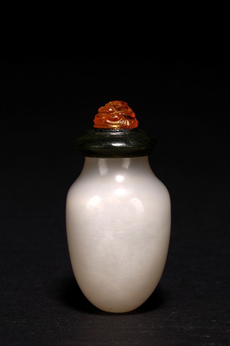 Qing Dynasty period. Of ovoid form, with green jade mouth lip and amber stopper, the stone is of even white tone.