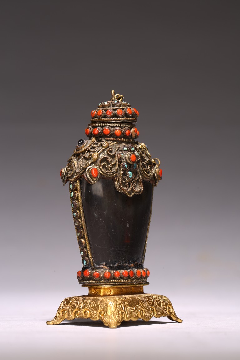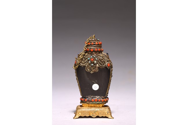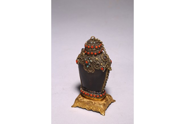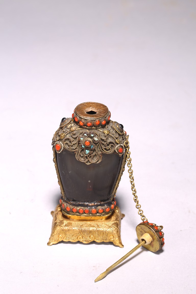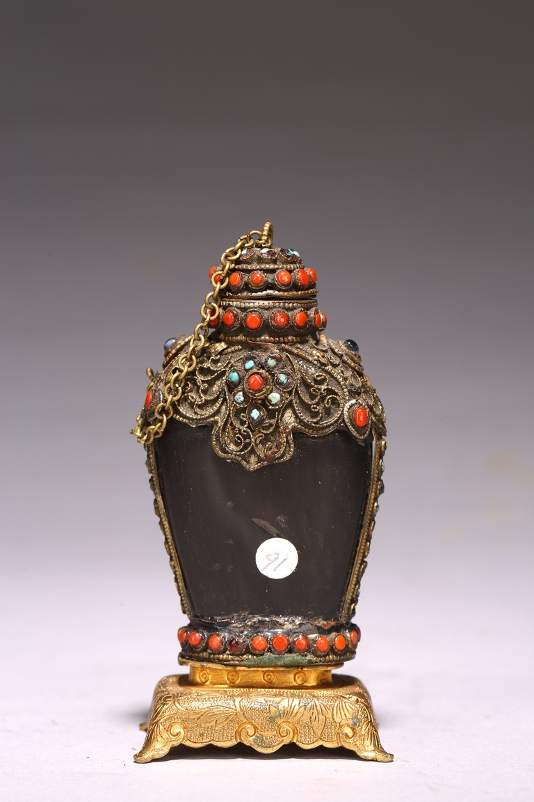 19th Century. The snuff bottle embellished with silver filigree and inlaid with coral red beads and with gilt bronze stand.