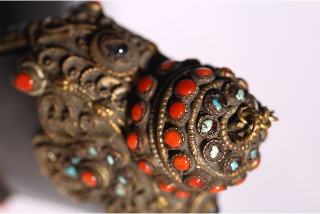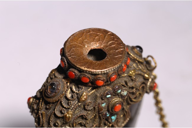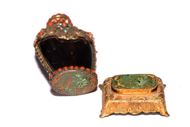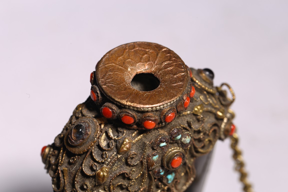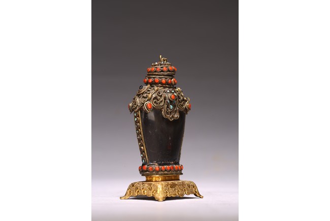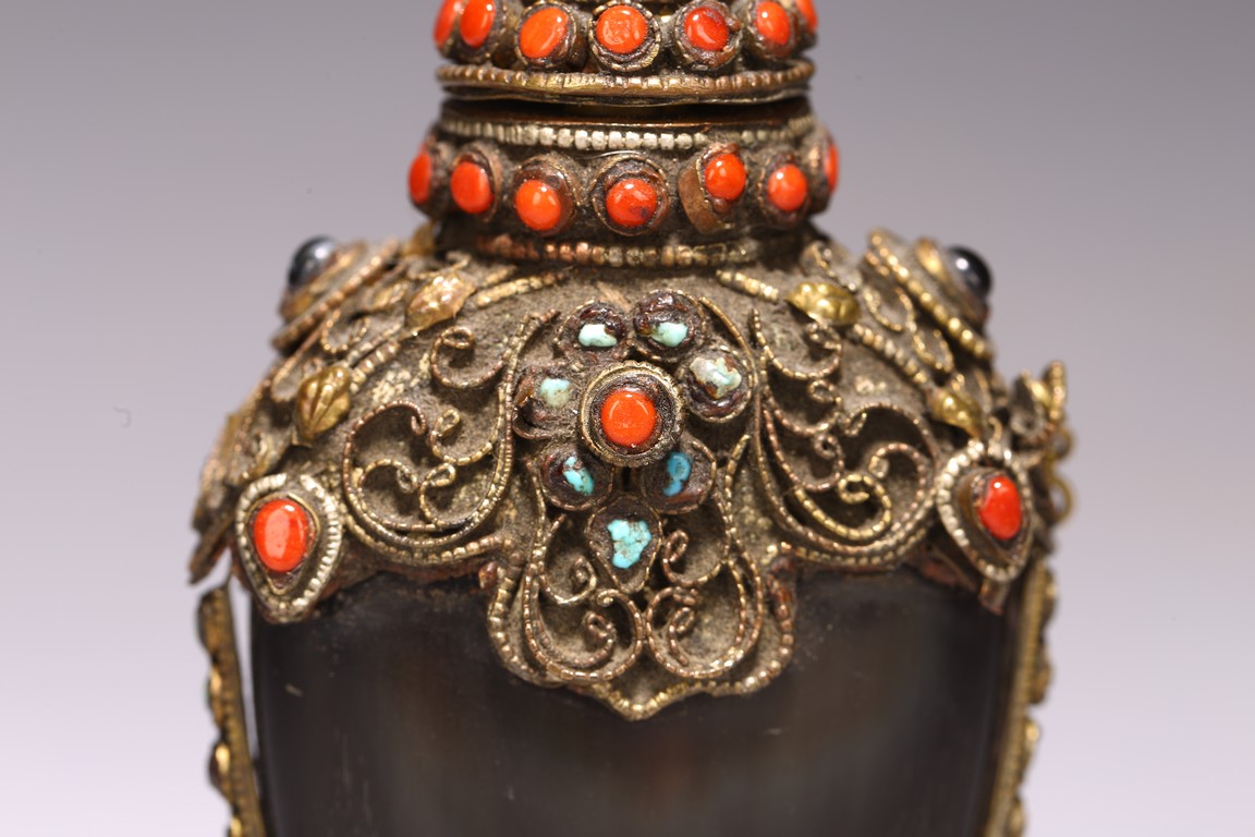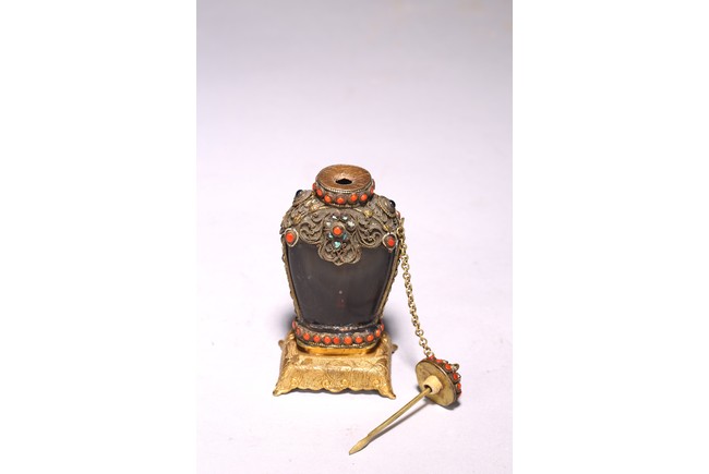 19th Century. The snuff bottle embellished with silver filigree and inlaid with coral red beads and with gilt bronze stand.
