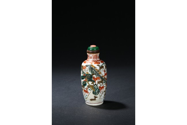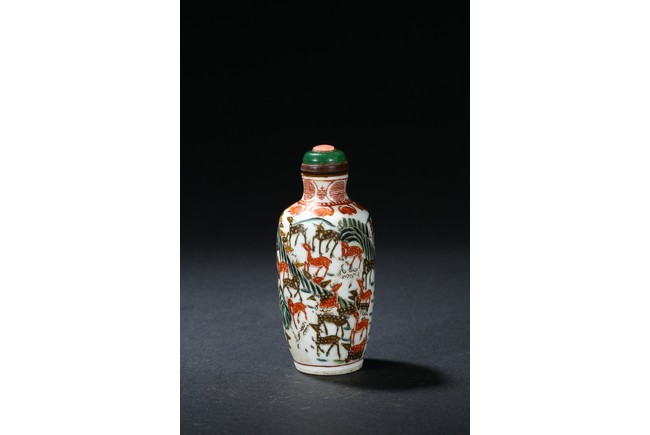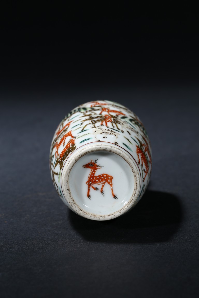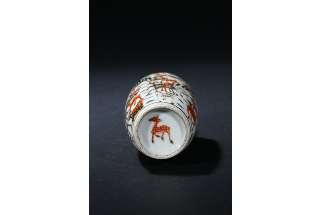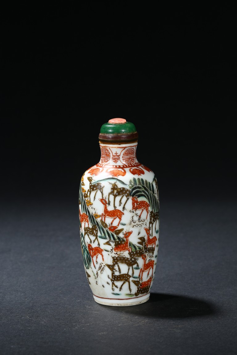 The body painted with numerous deer in a garden scene, the neck decorated with a band of auspicious bats and shou medallions. The base decorated with a single deer. Qing Dynasty period.