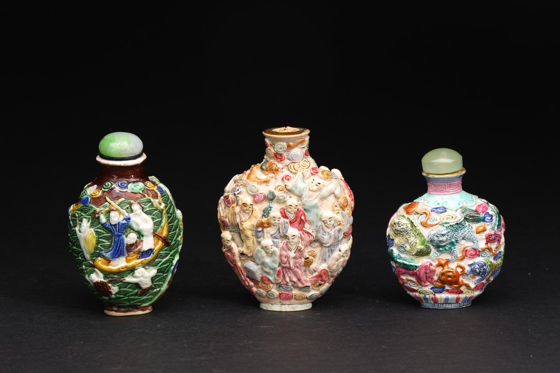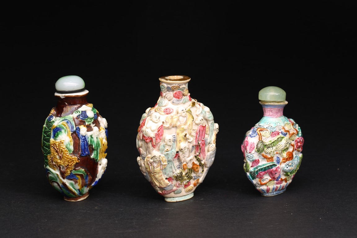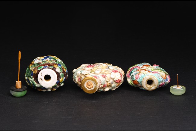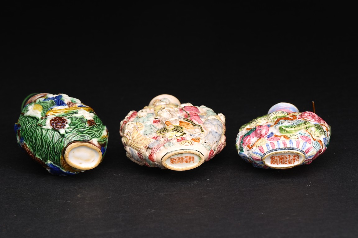 Qing Dynasty period. A group of three carved famille rose snuff bottles, with marks at base.