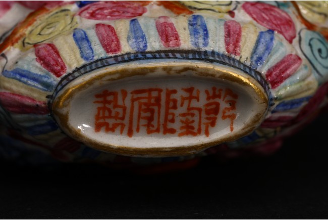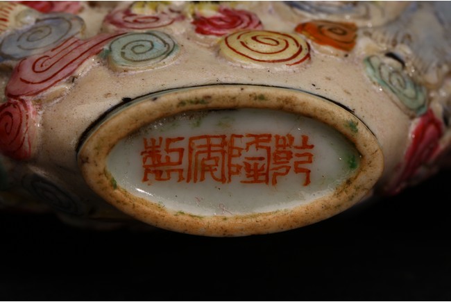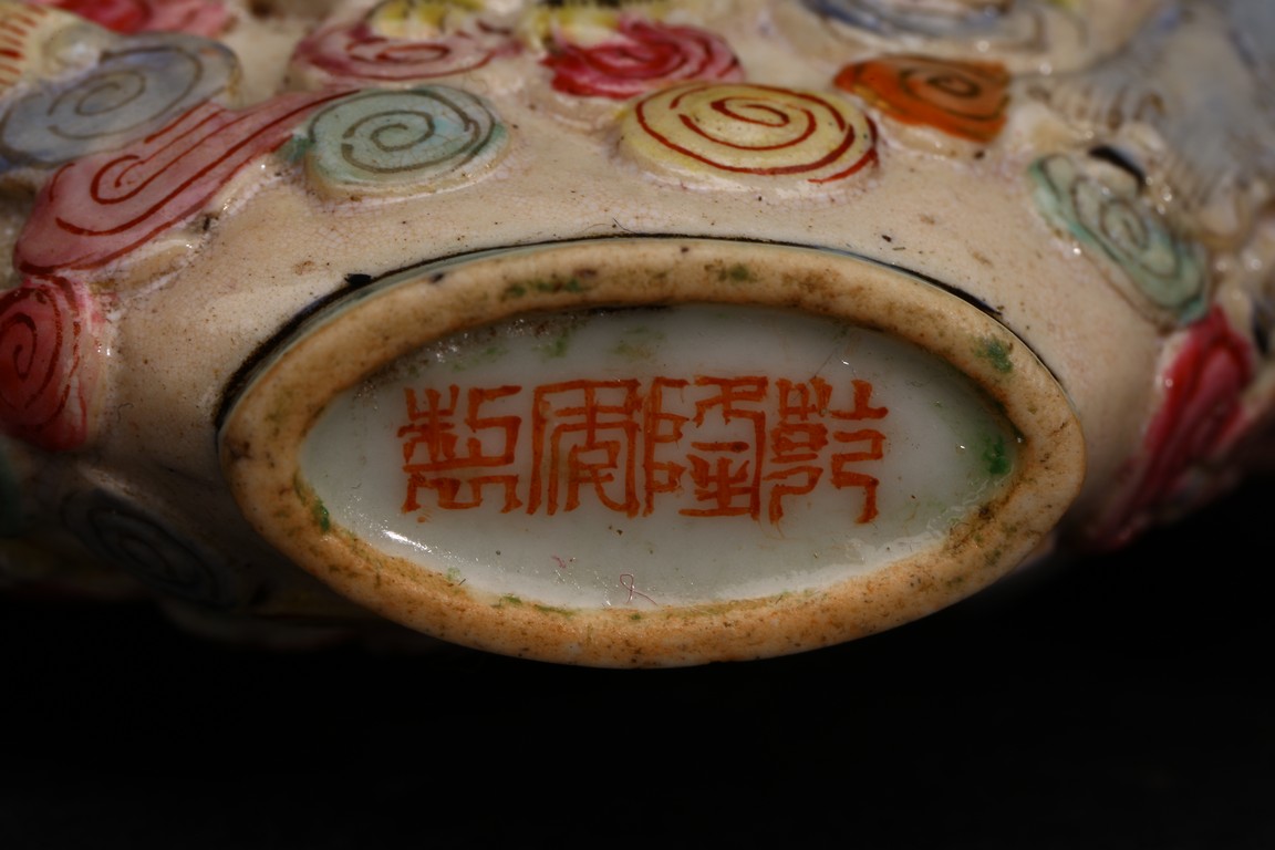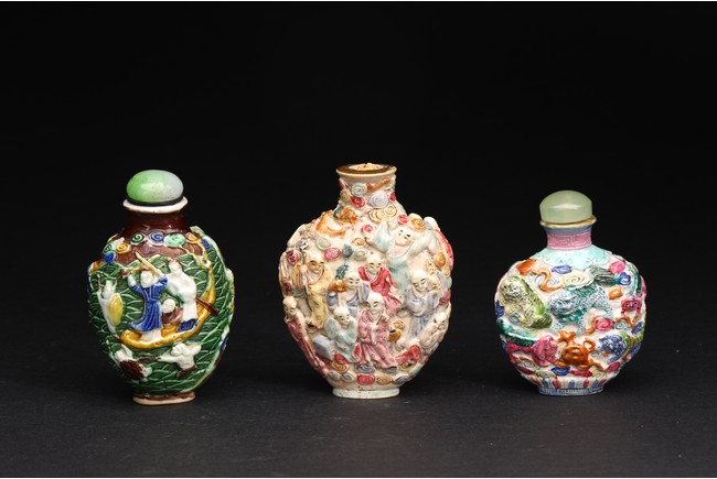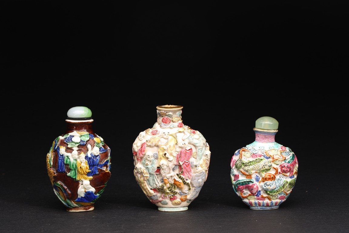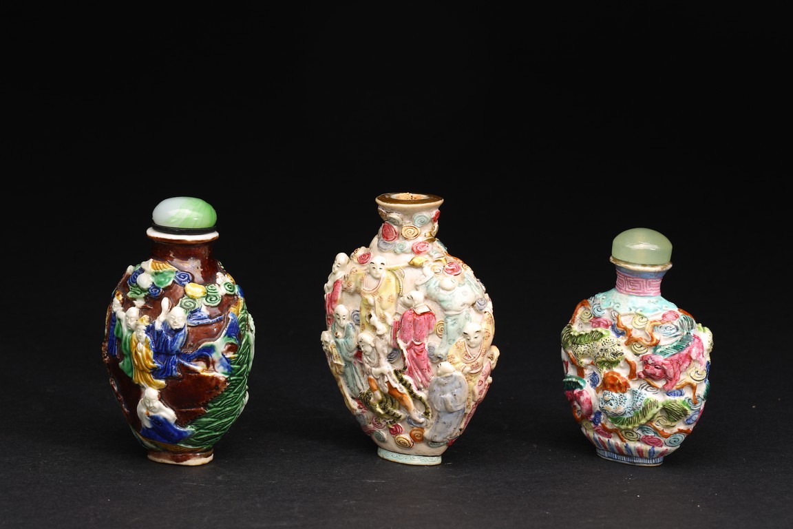 Qing Dynasty period. A group of three carved famille rose snuff bottles, with marks at base.