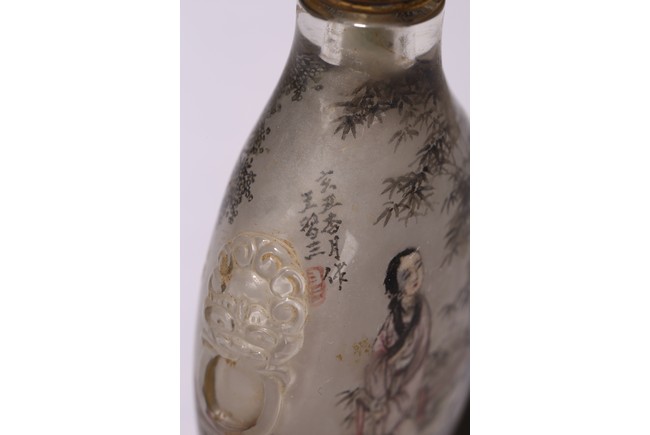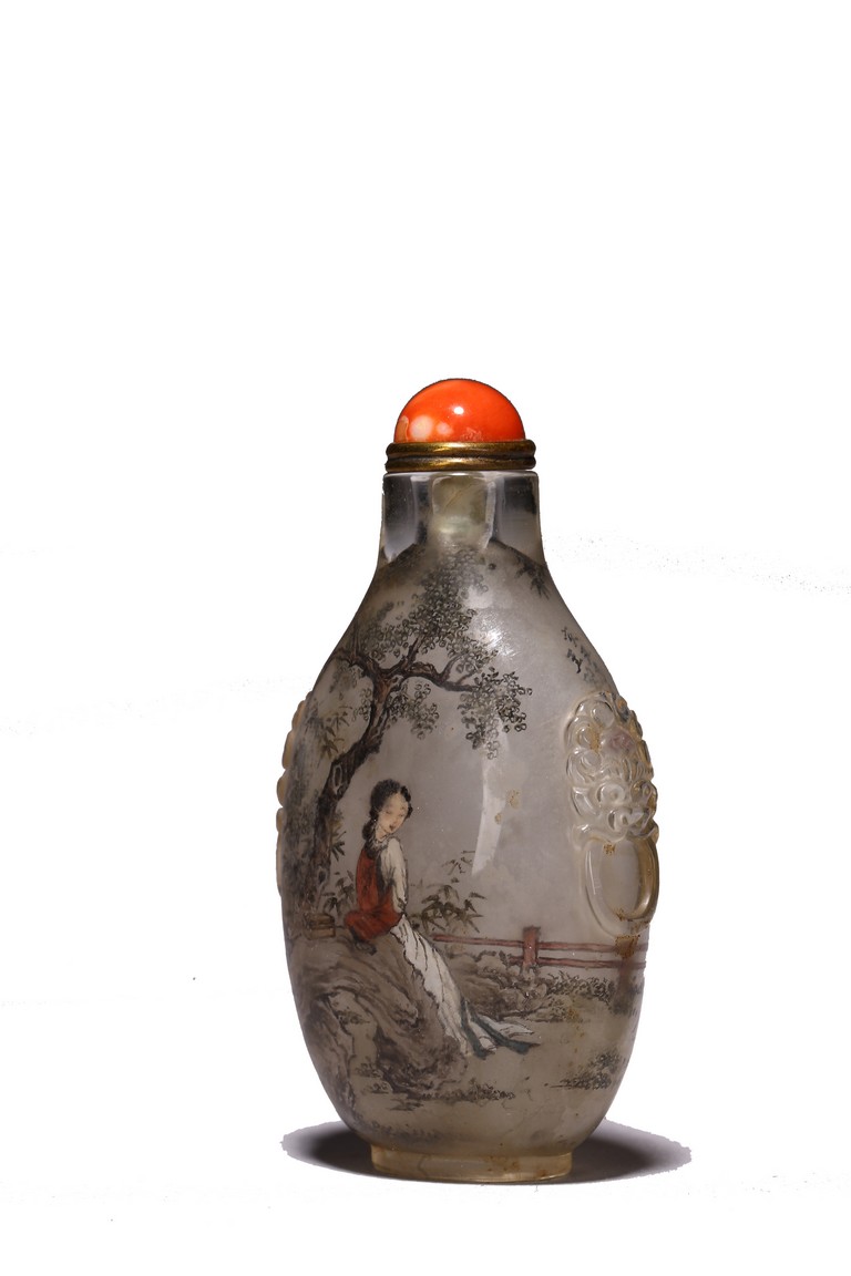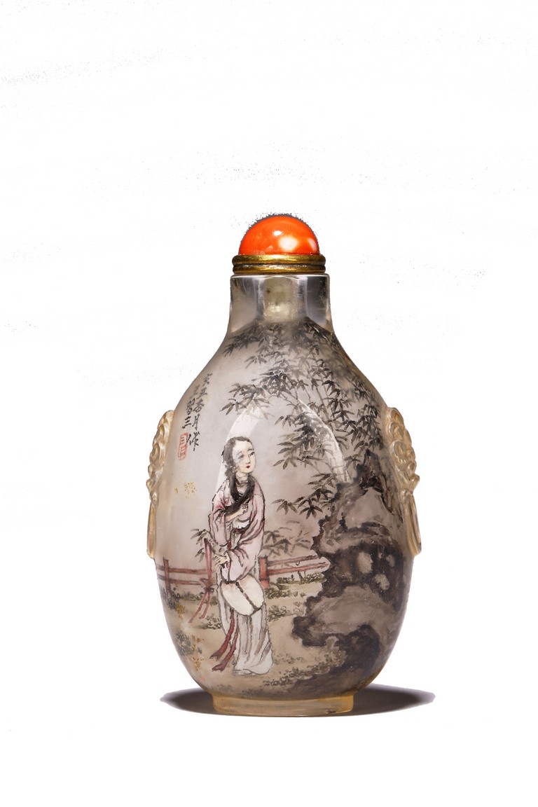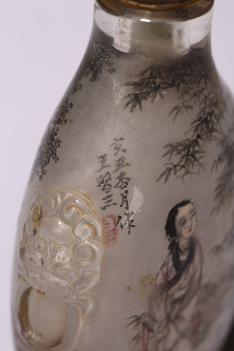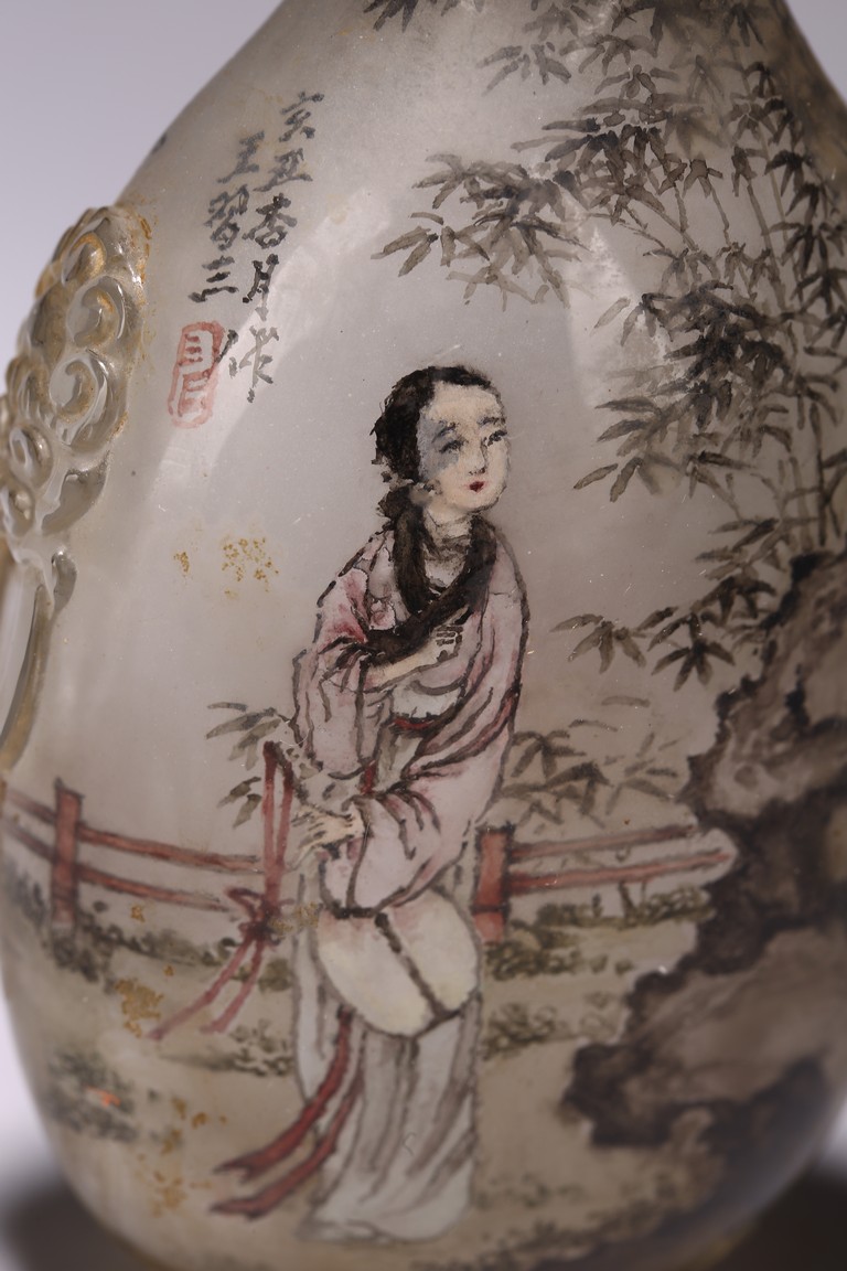20th Century. The crystal bottle is finely painted to one side depicting a beauty standing against rockwork in a garden setting, the reverse painted with a beauty holding a fan appreciating the bamboo and rocks, inscribed and signed Wang Xisan with a seal mark.