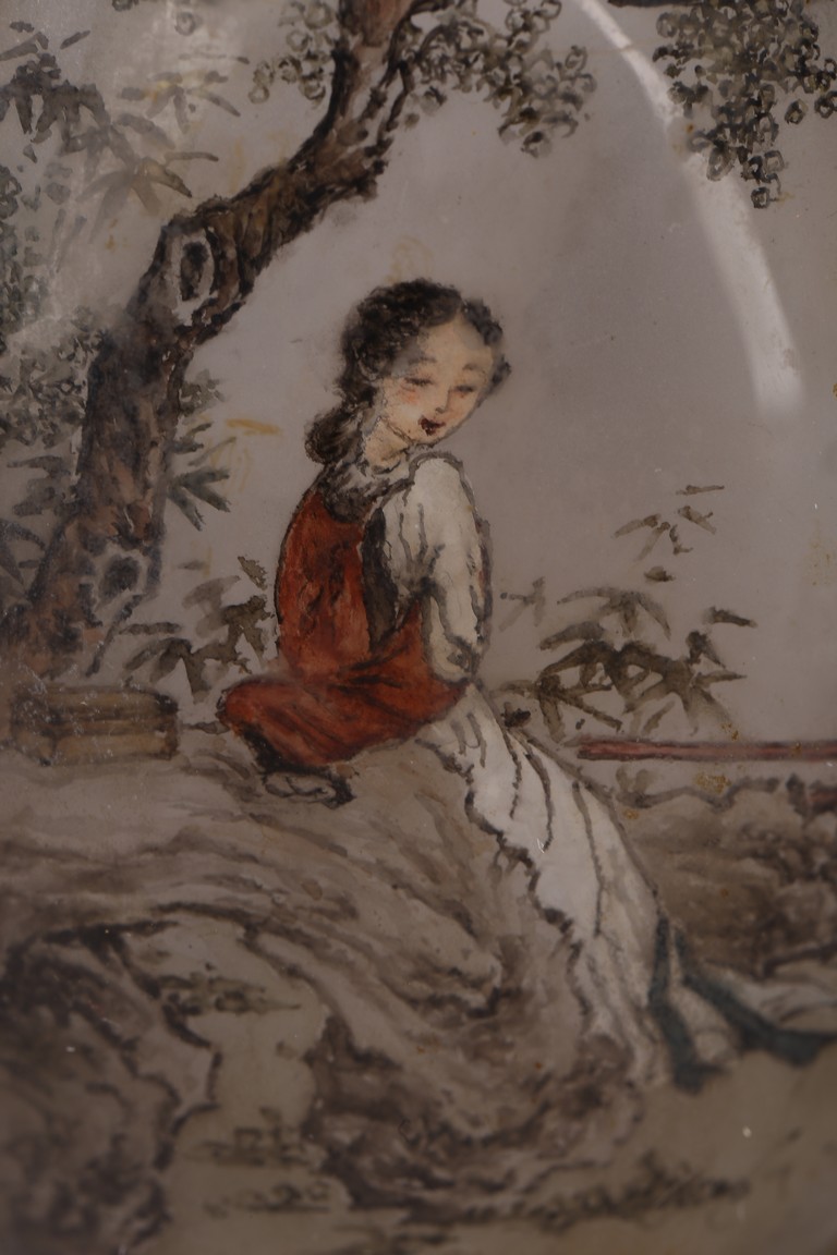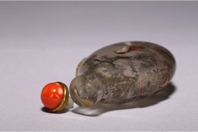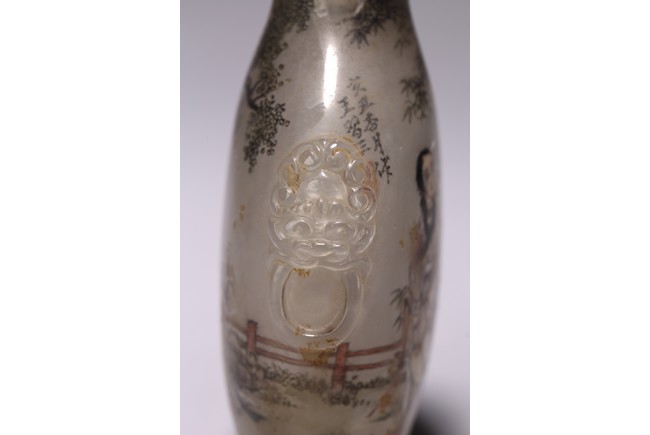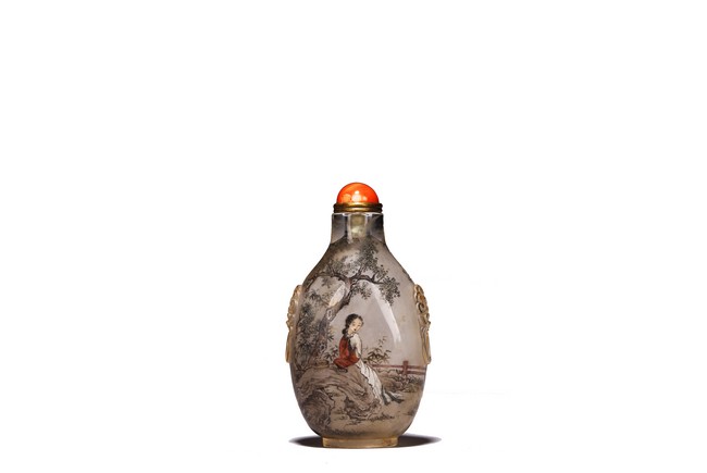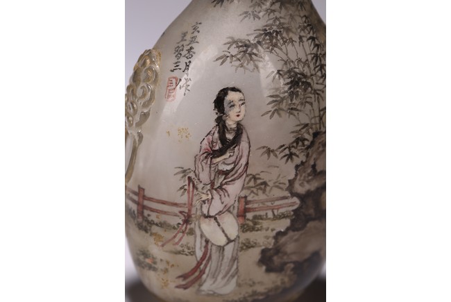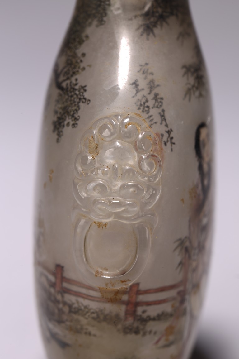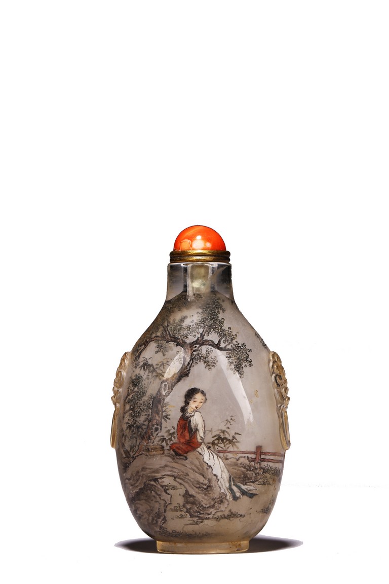 20th Century. The crystal bottle is finely painted to one side depicting a beauty standing against rockwork in a garden setting, the reverse painted with a beauty holding a fan appreciating the bamboo and rocks, inscribed and signed Wang Xisan with a seal mark.