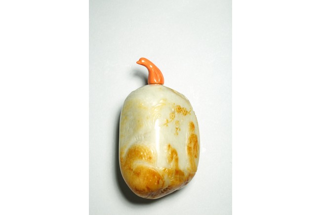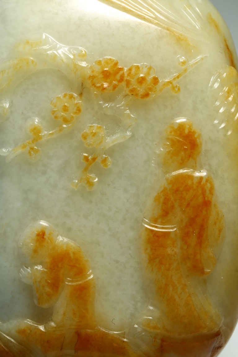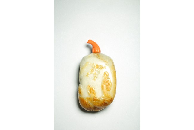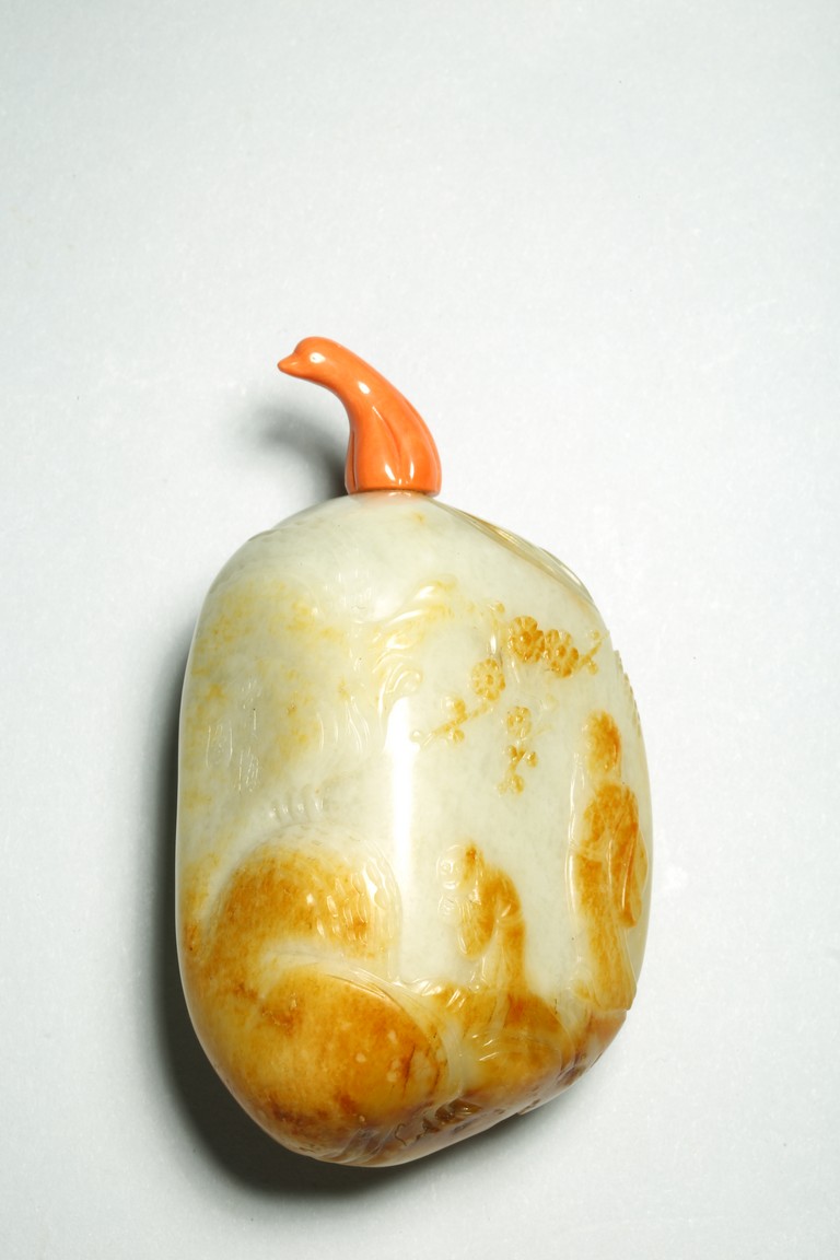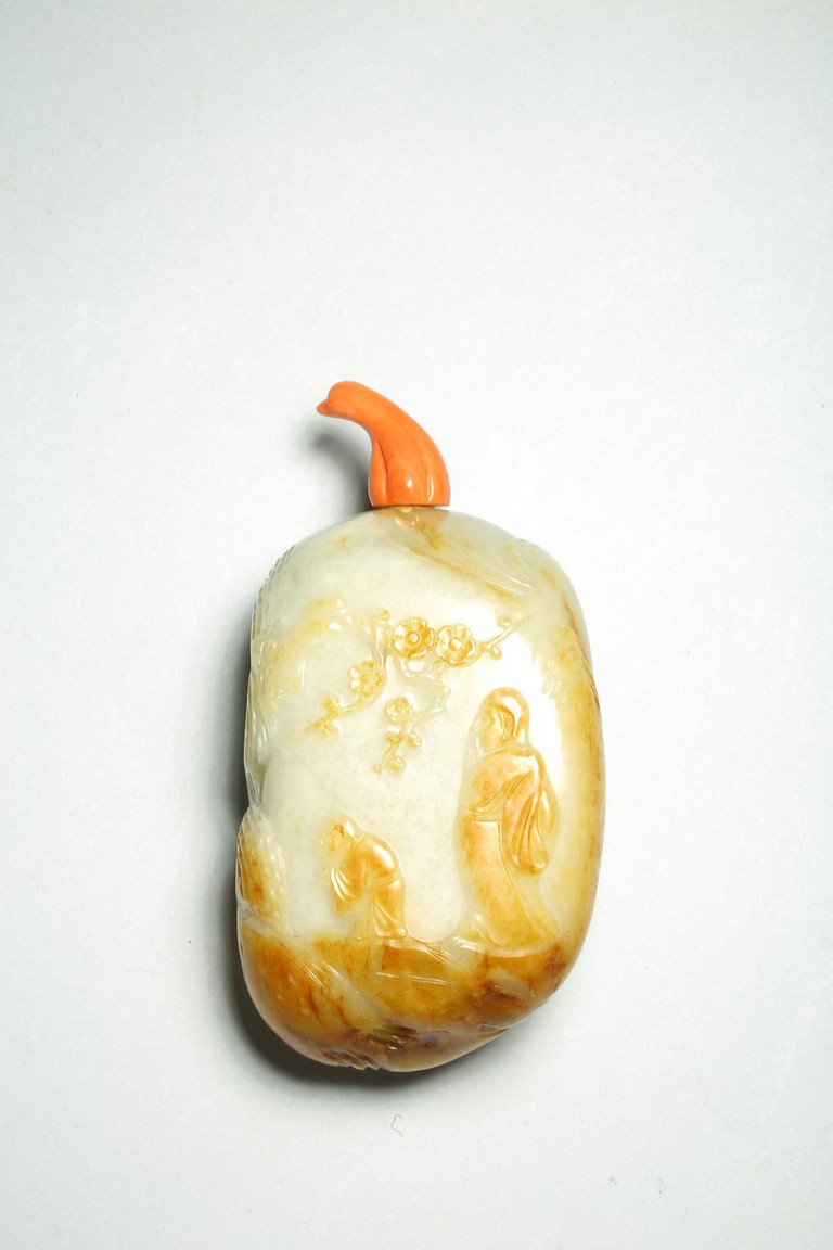 Qing Dynasty period. One side is carved through the russet skin with an official figure appreciating the plum blossoms with his attendant, with a coral carved stopper.