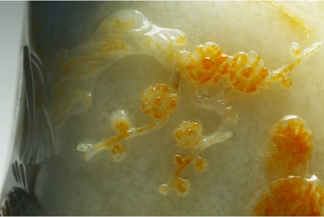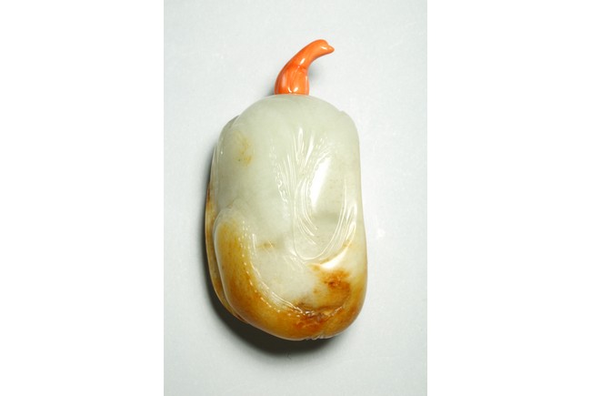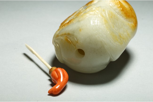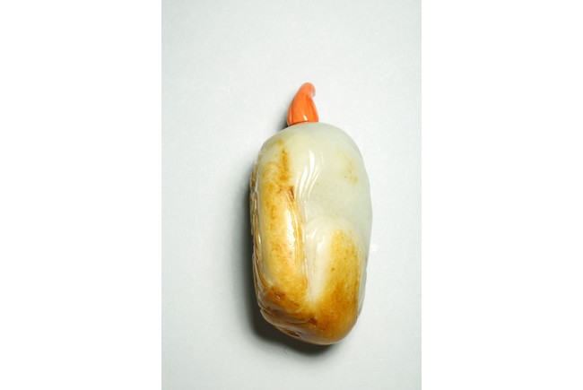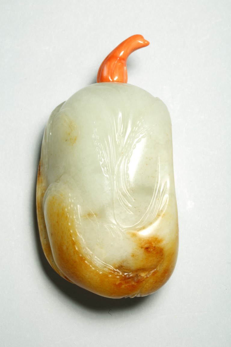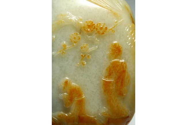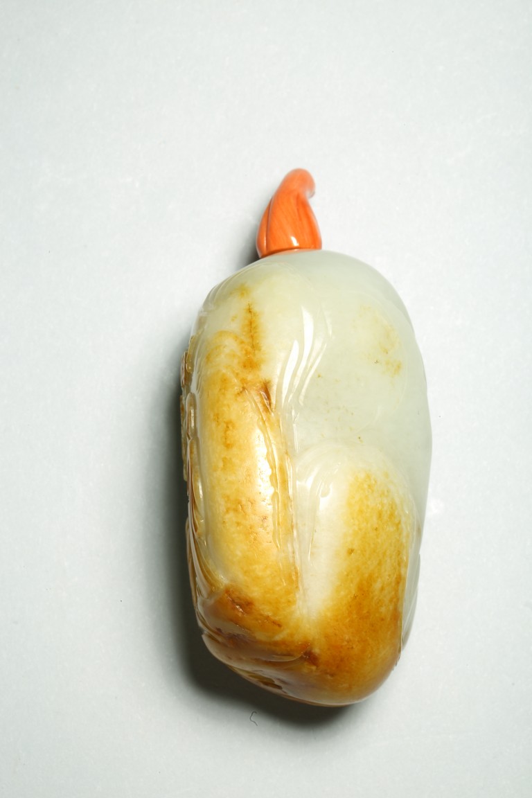 Qing Dynasty period. One side is carved through the russet skin with an official figure appreciating the plum blossoms with his attendant, with a coral carved stopper.