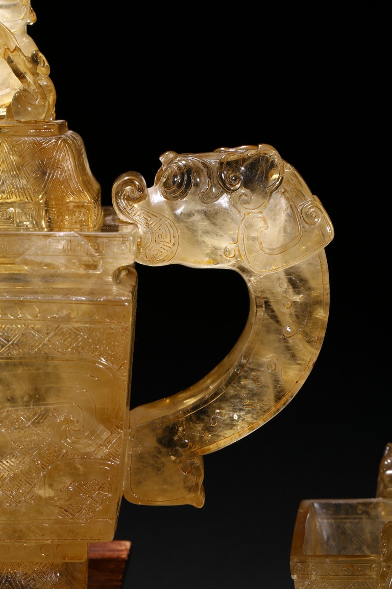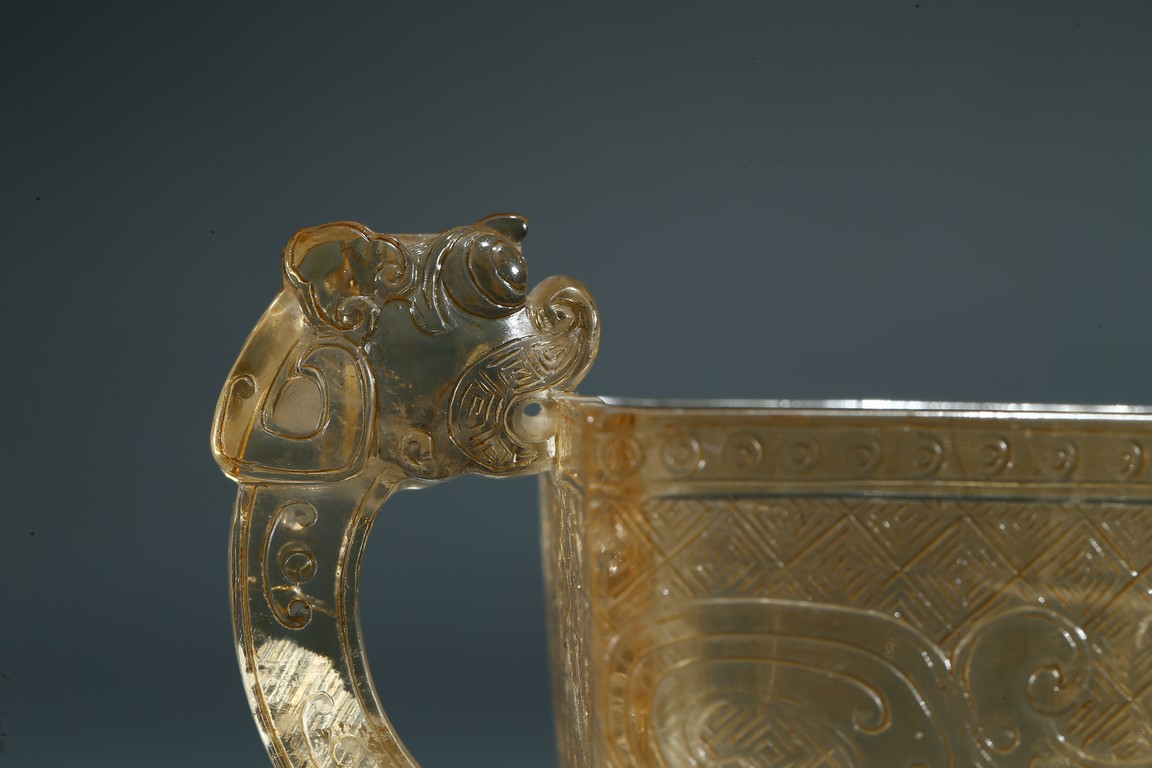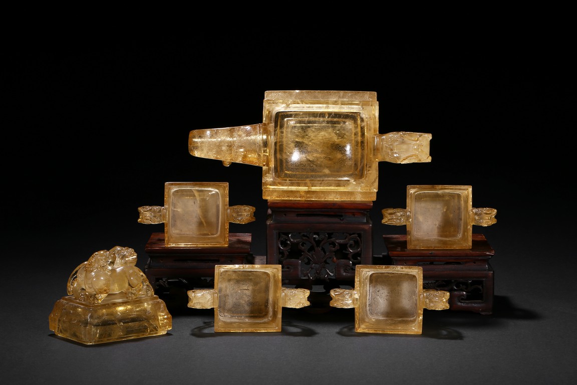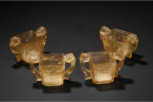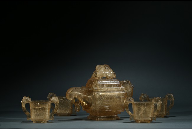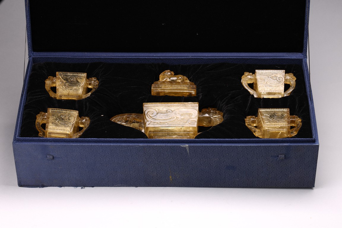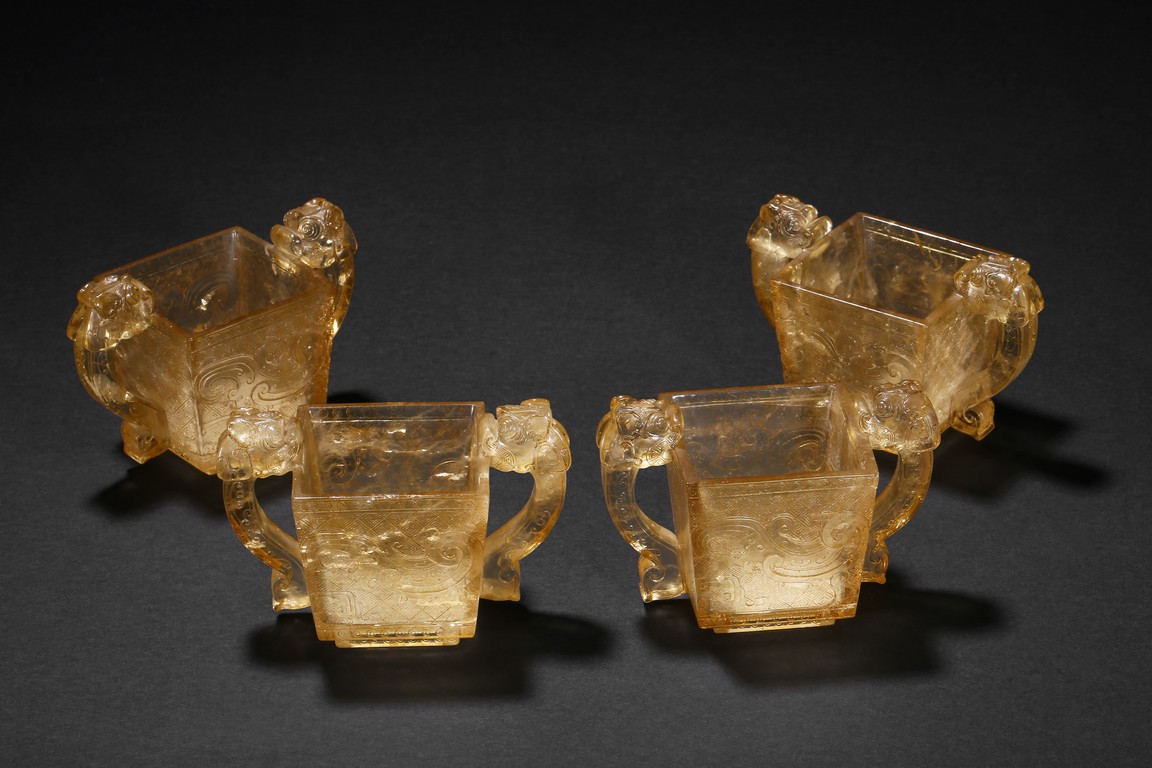 Late Qing/Early Republic period. Consisting of four wine cups, each of square section, the body carved with archaistic mythical beast decoration in shallow relief reserved on key-fret ground, flanked by two mythical beast handles; and a square section teapot, the body with similar design.