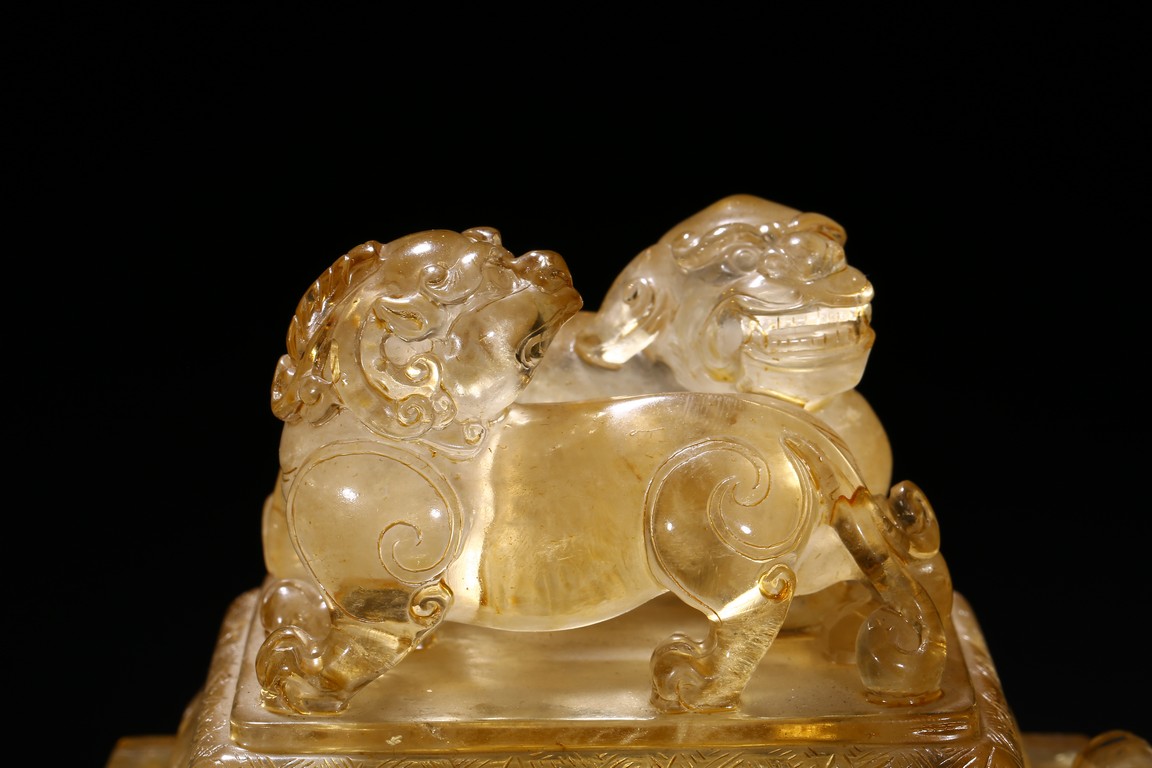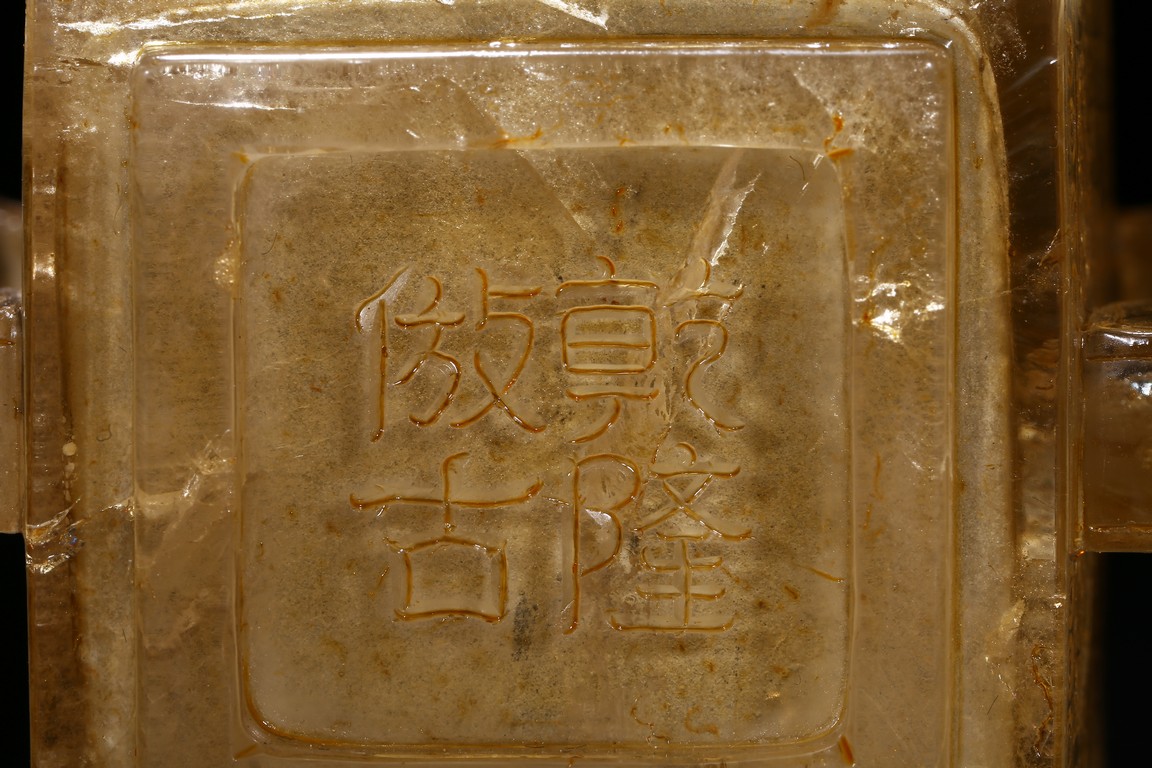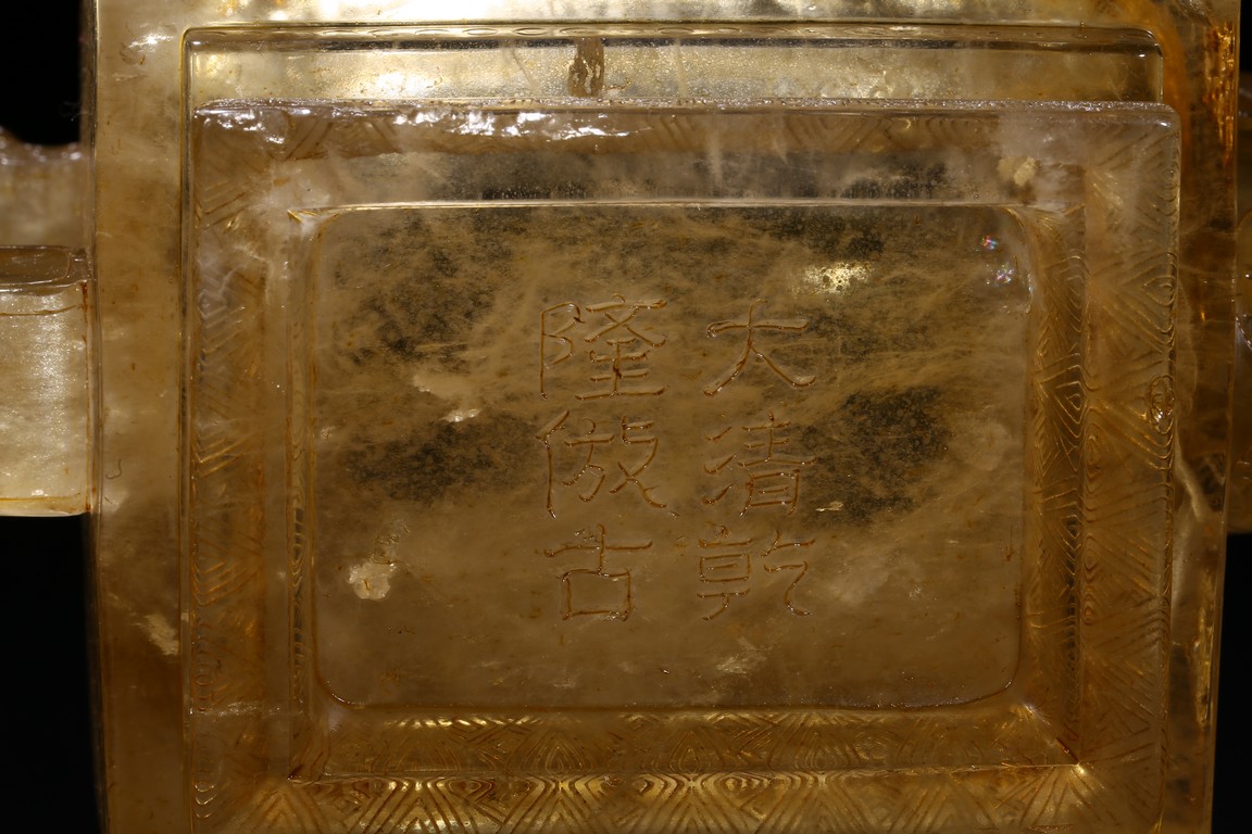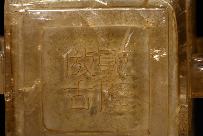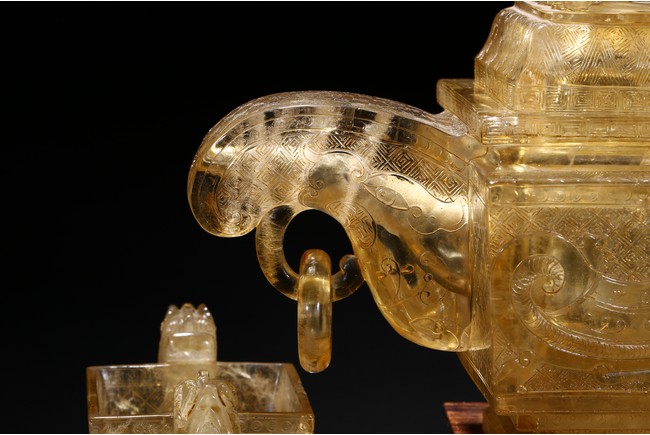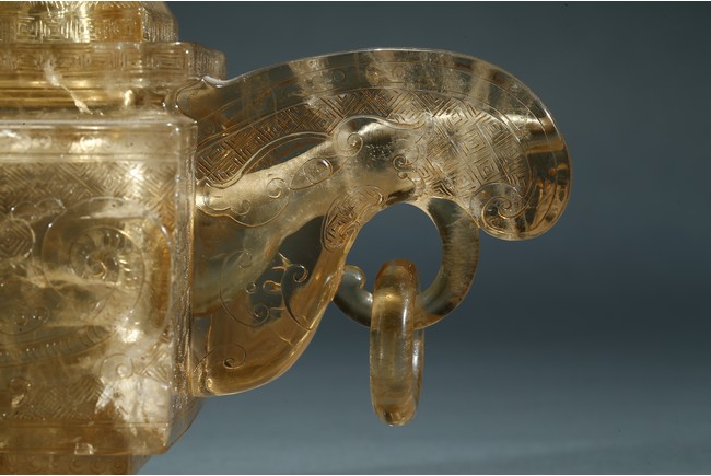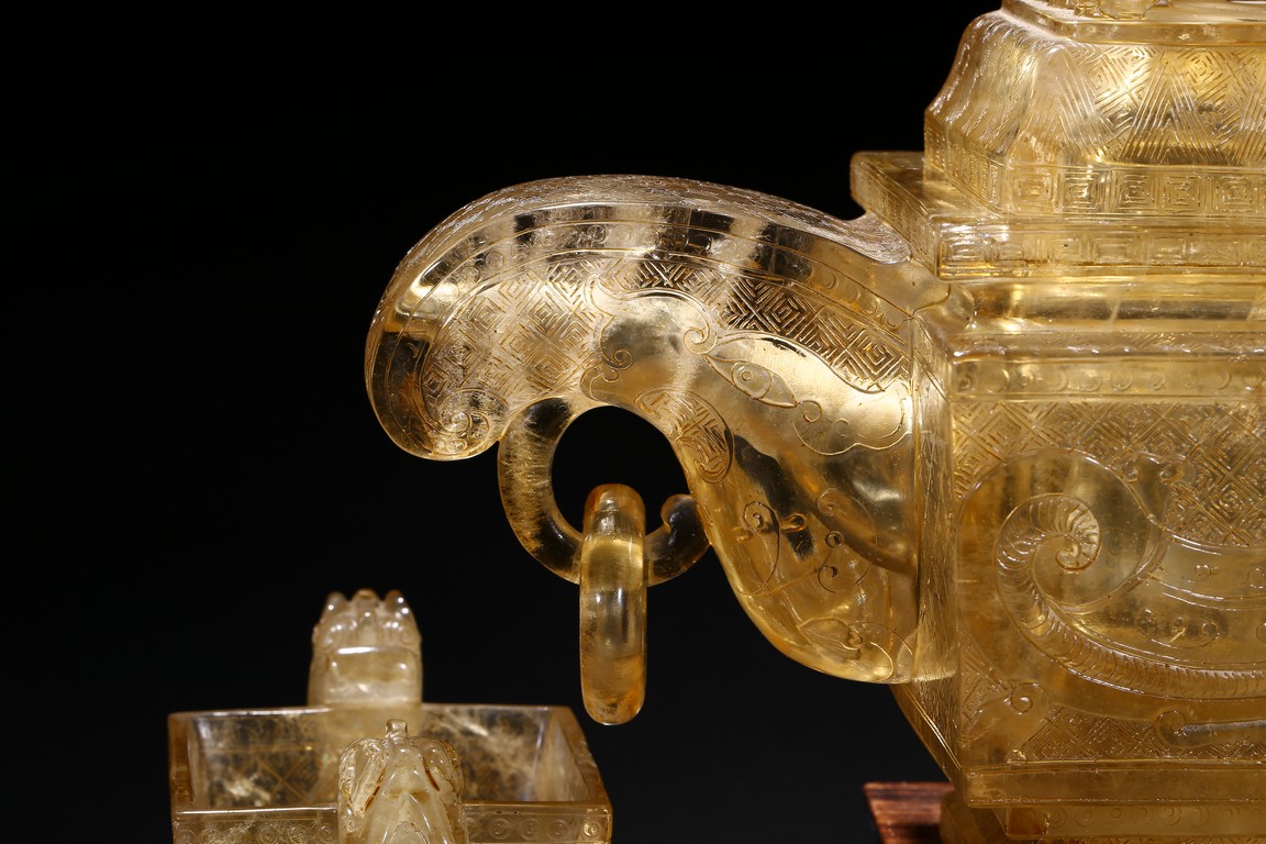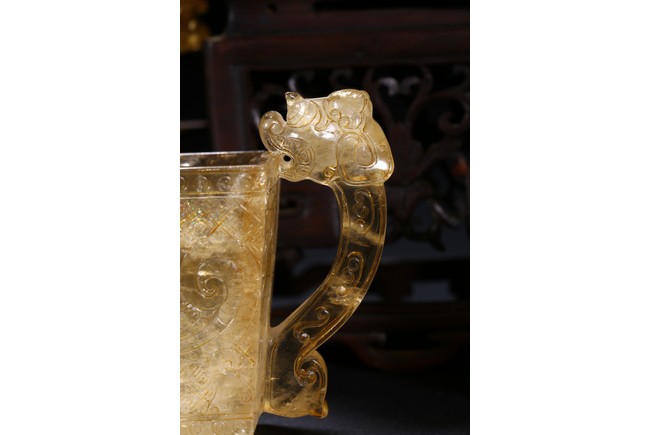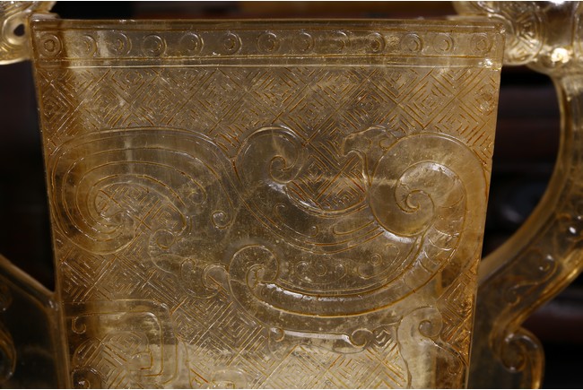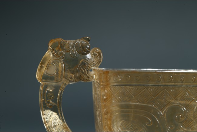 Late Qing/Early Republic period. Consisting of four wine cups, each of square section, the body carved with archaistic mythical beast decoration in shallow relief reserved on key-fret ground, flanked by two mythical beast handles; and a square section teapot, the body with similar design.