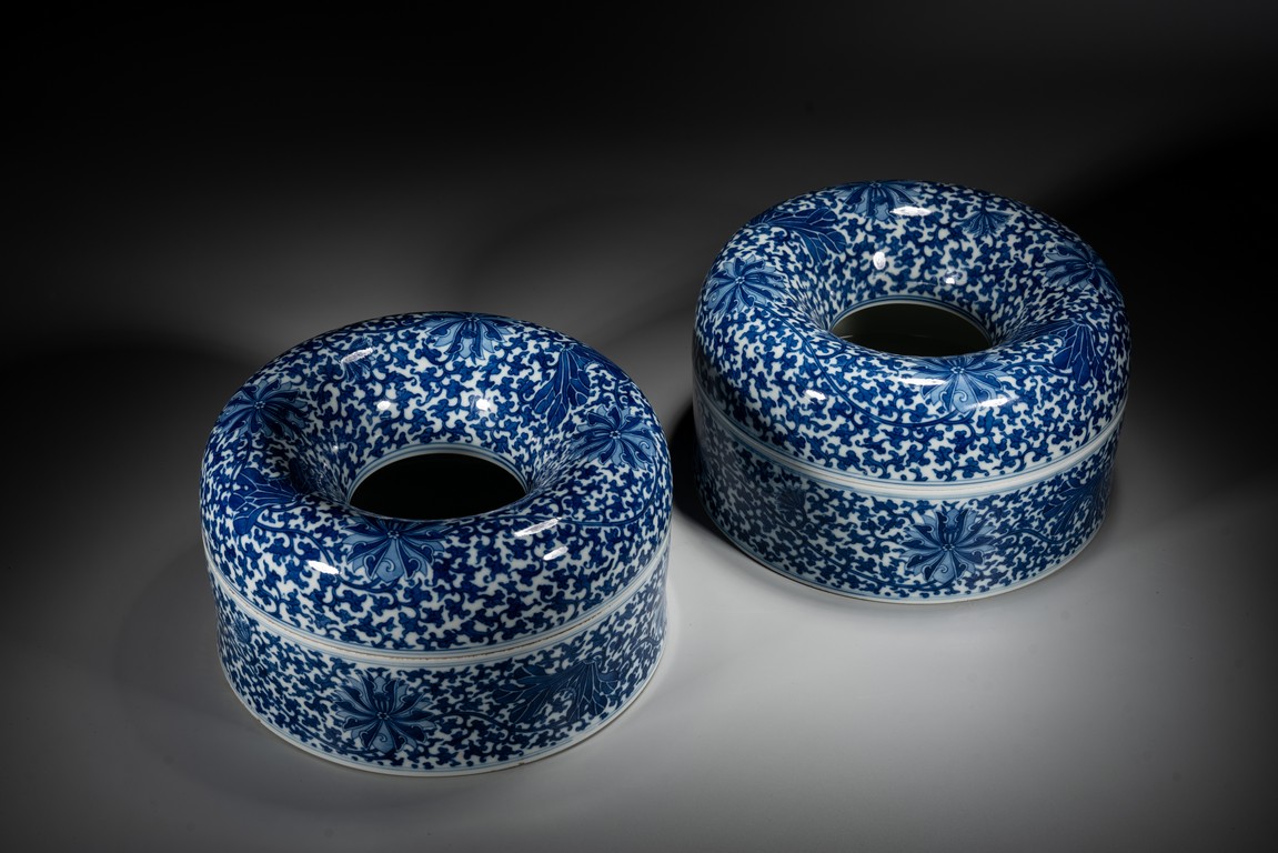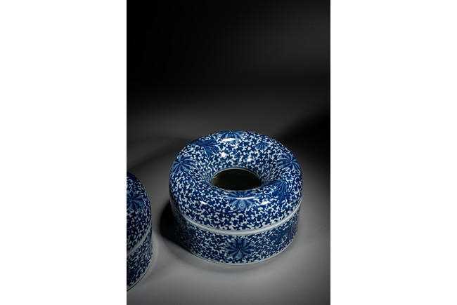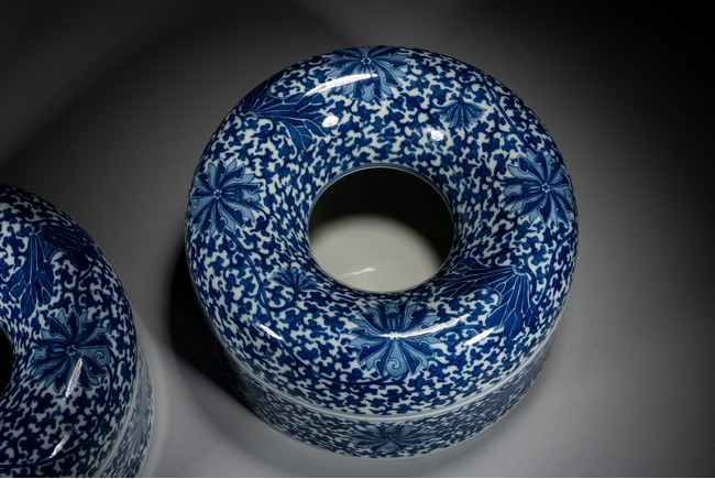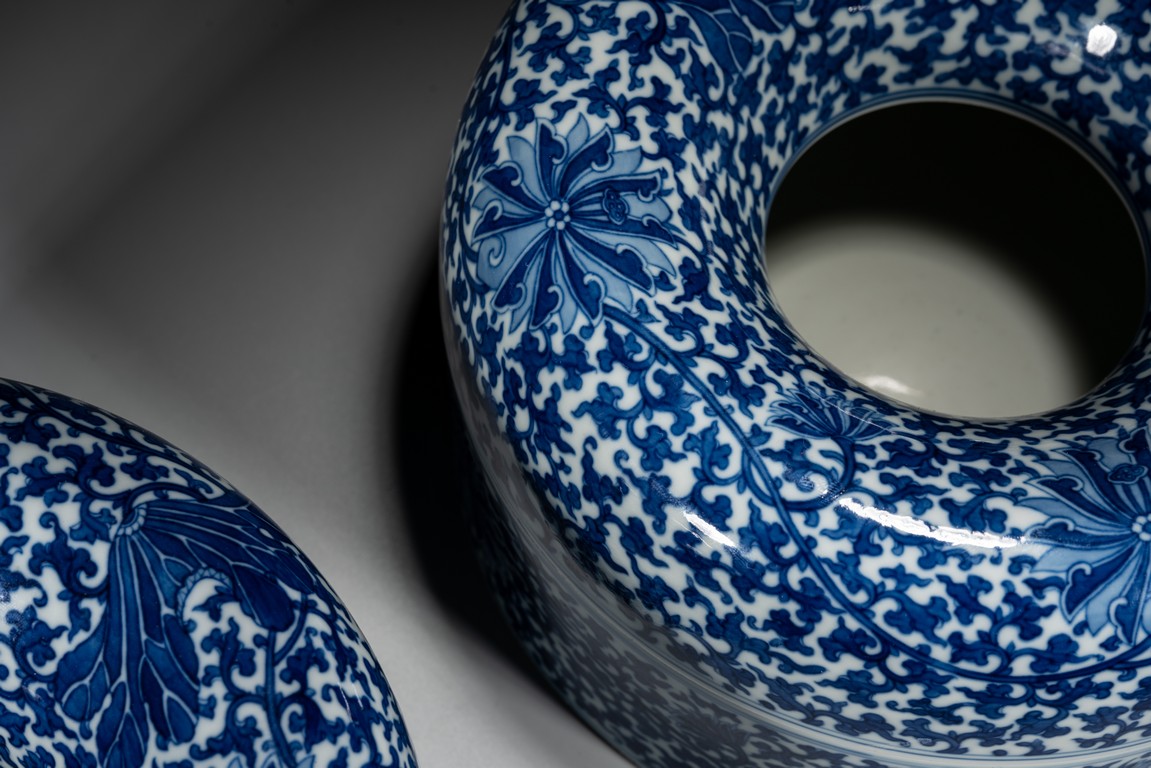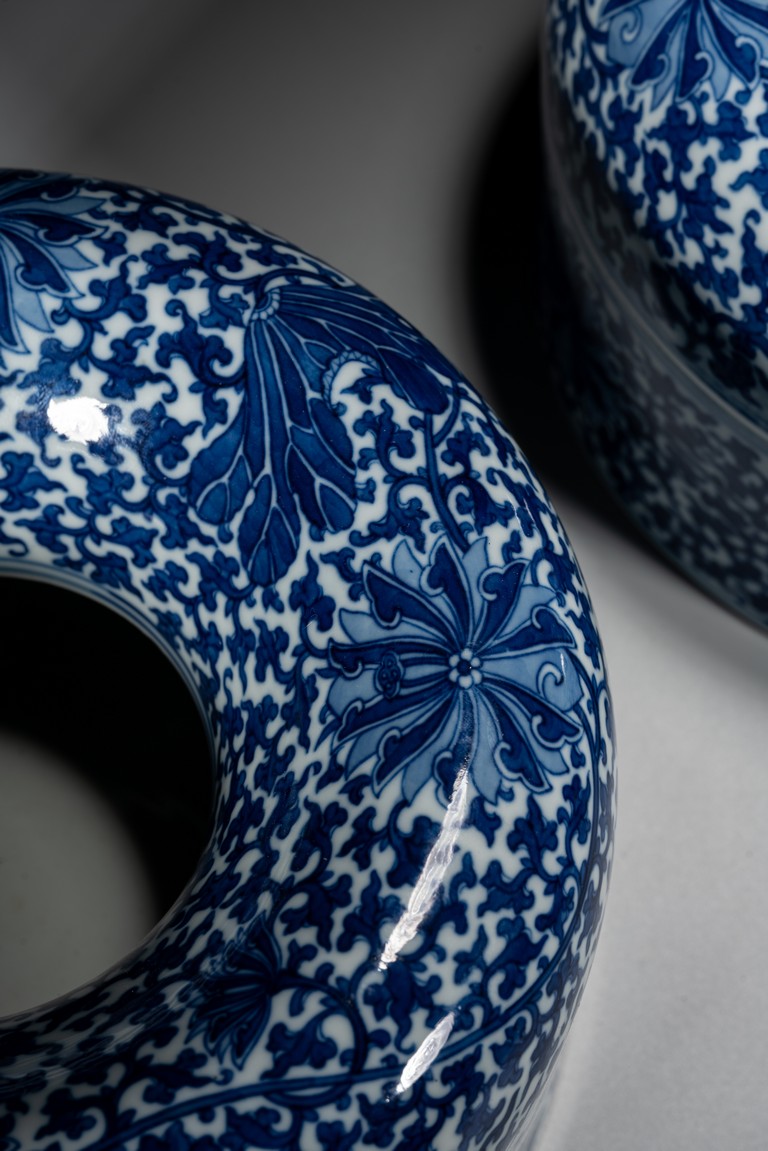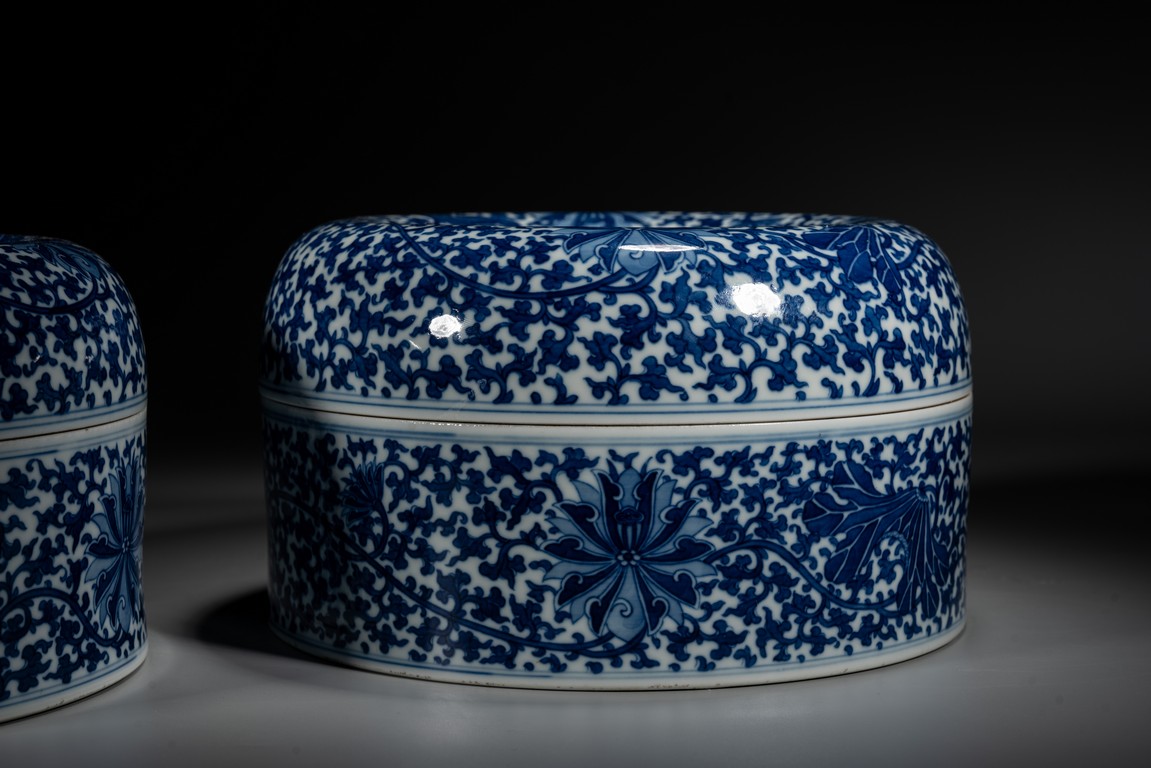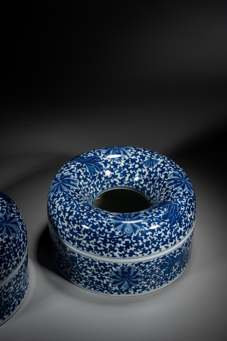 朝珠盒是清代官員專門存放朝珠的用具。子母口,圈足,盒蓋呈環形。通體施白釉,盒身以青花滿繪西蕃蓮紋,盒蓋亦繪青花西蕃蓮紋,紋飾精美,構圖繁縟,青料发色明翠。此類朝珠盒多繪制青花西蕃蓮,寓意“清廉”。此盒形制碩大,器型飽滿,胎質細膩堅實,釉面潔凈,紋飾古樸,成對保存,不可多得。來源: 加州聖地亞哥私人藏家收藏 Provenance: Private collection, San Diego, California