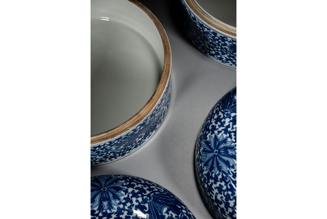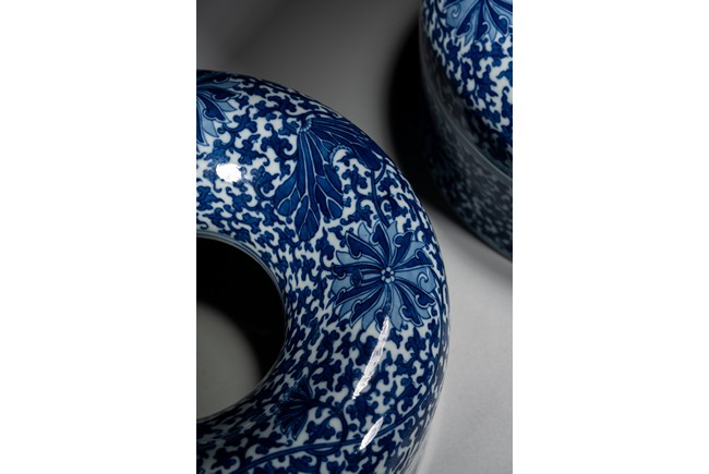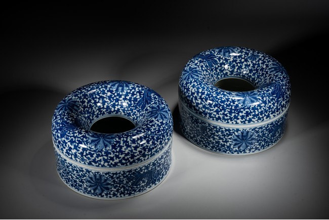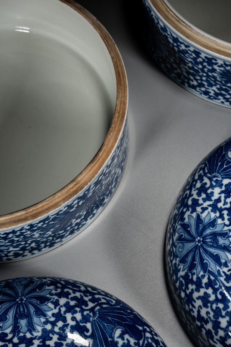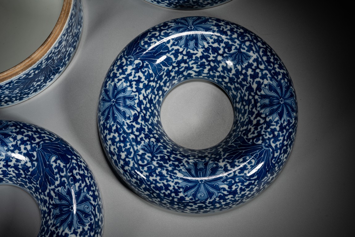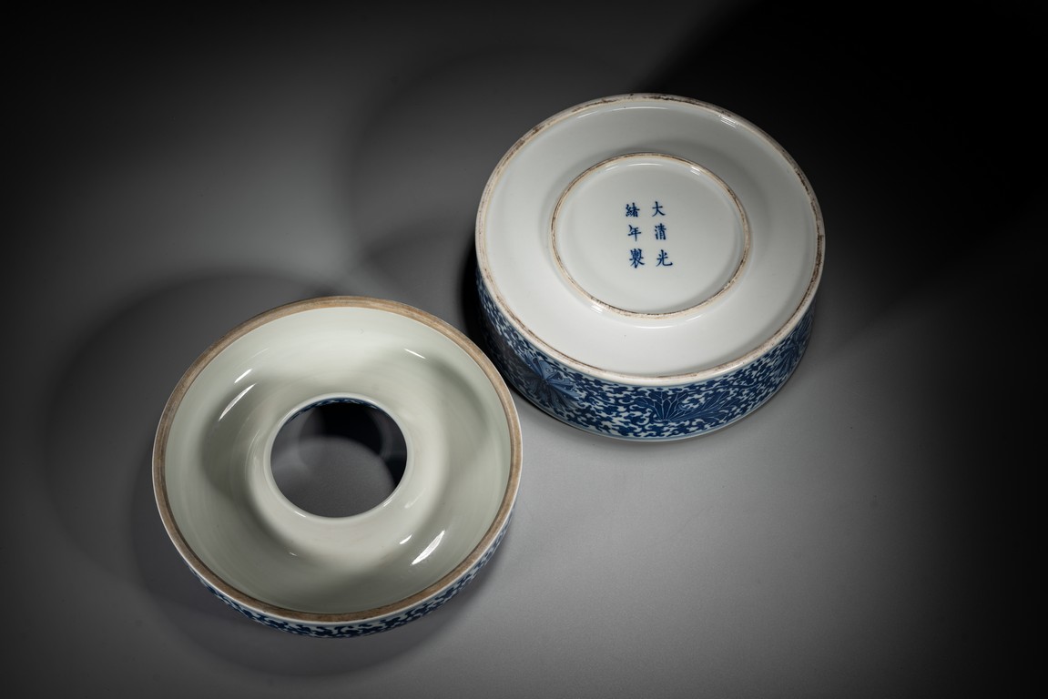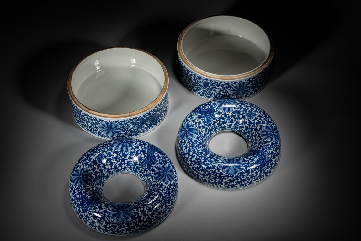 朝珠盒是清代官員專門存放朝珠的用具。子母口,圈足,盒蓋呈環形。通體施白釉,盒身以青花滿繪西蕃蓮紋,盒蓋亦繪青花西蕃蓮紋,紋飾精美,構圖繁縟,青料发色明翠。此類朝珠盒多繪制青花西蕃蓮,寓意“清廉”。此盒形制碩大,器型飽滿,胎質細膩堅實,釉面潔凈,紋飾古樸,成對保存,不可多得。來源: 加州聖地亞哥私人藏家收藏 Provenance: Private collection, San Diego, California