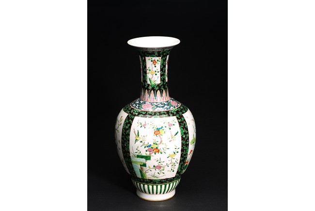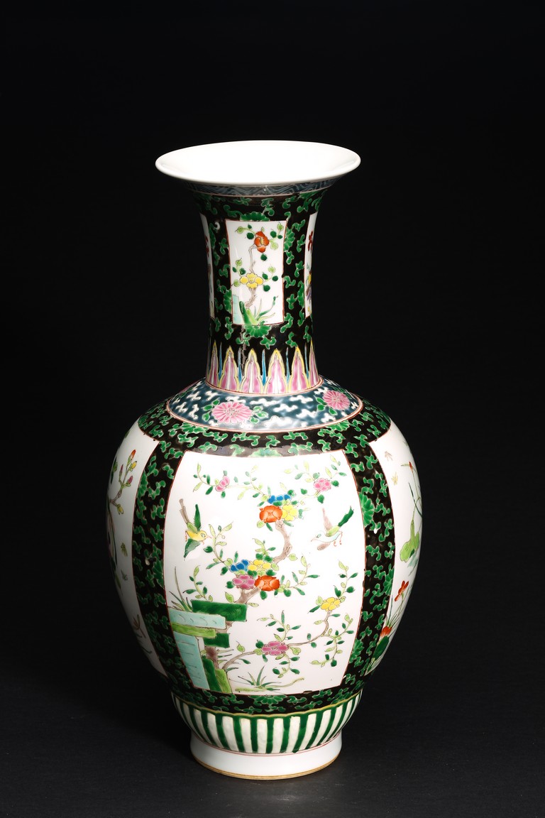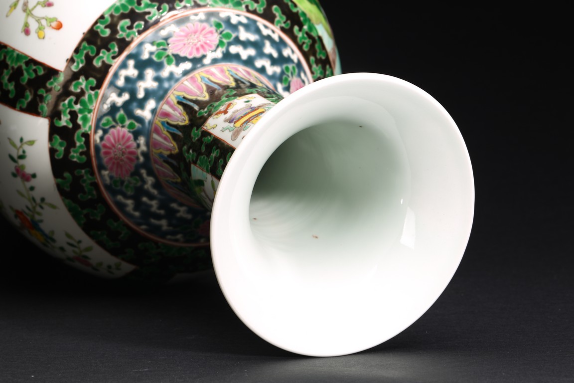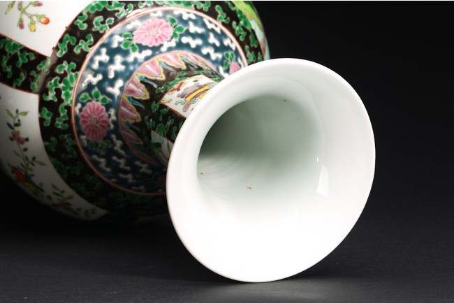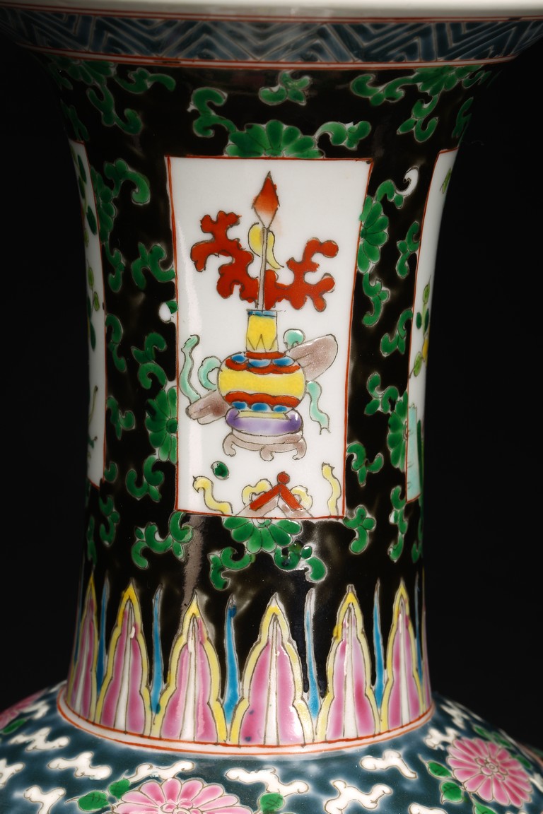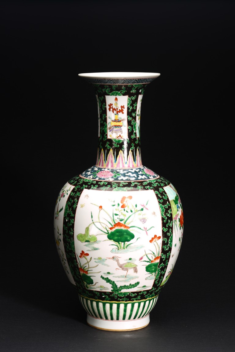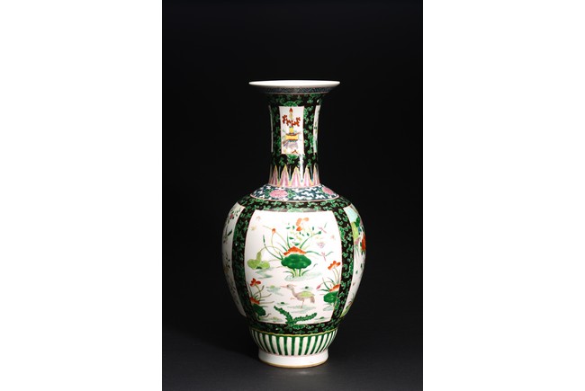 The vase body decorated with lotus pond scenes, neck further decorated with antiques, base inscribed with reign mark.