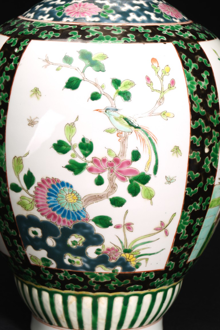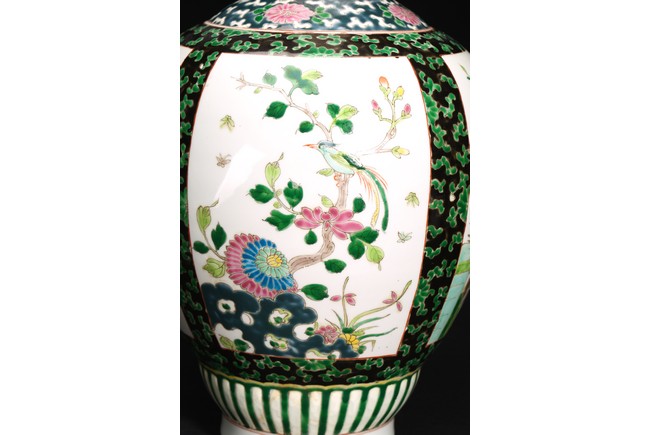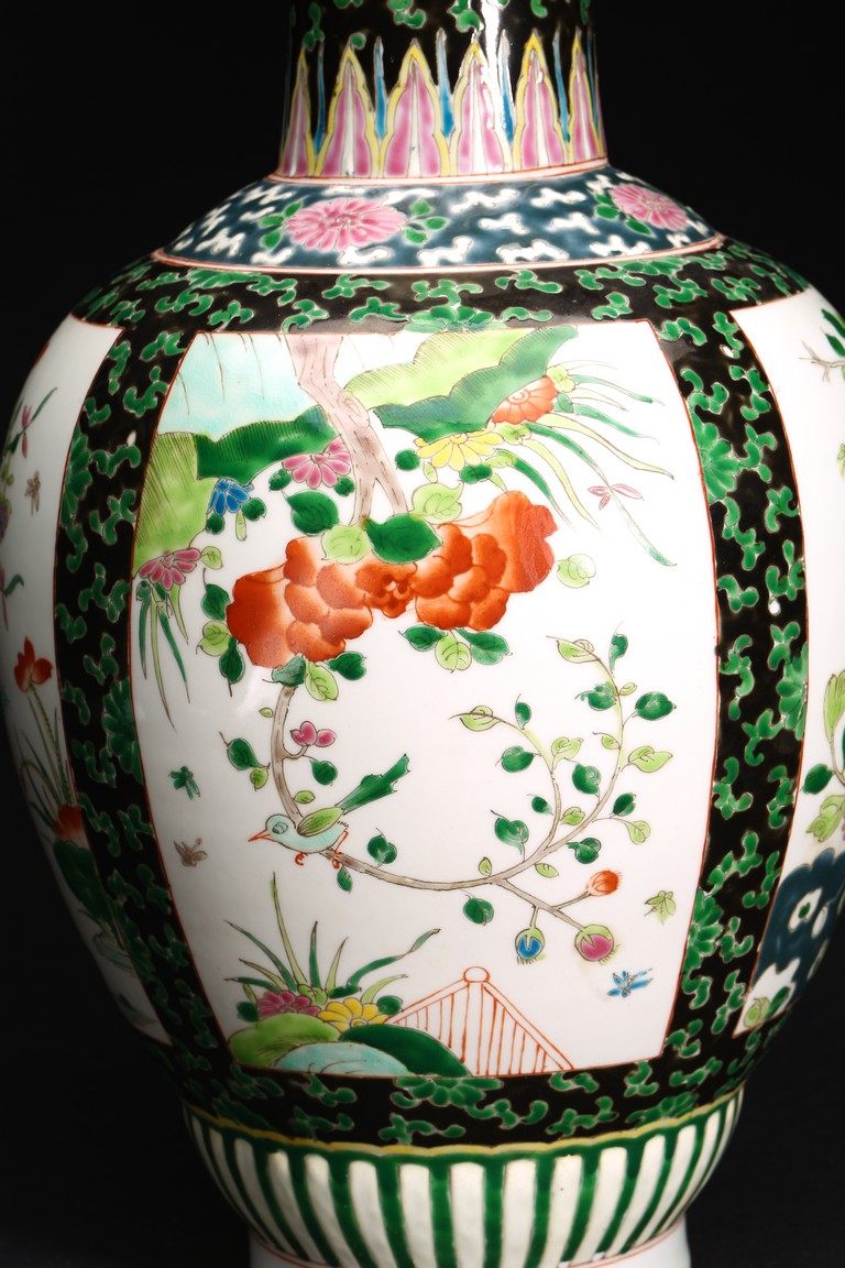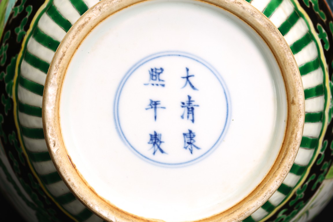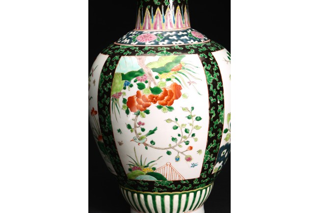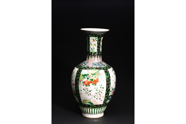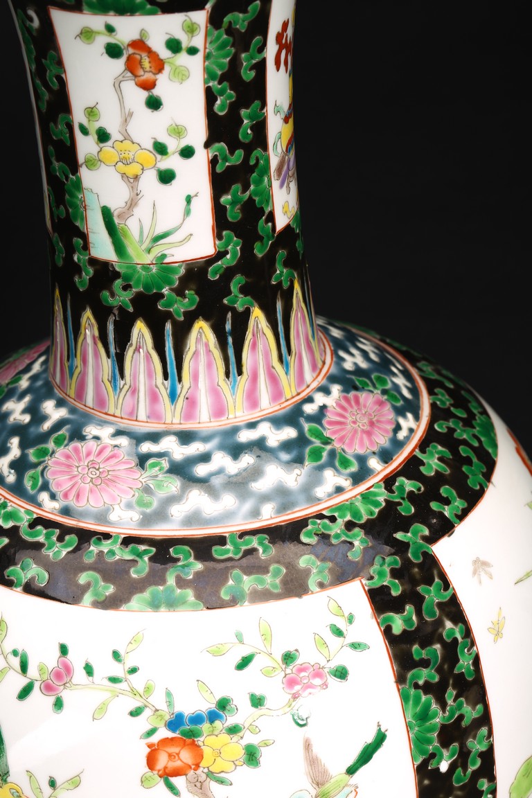 The vase body decorated with lotus pond scenes, neck further decorated with antiques, base inscribed with reign mark.