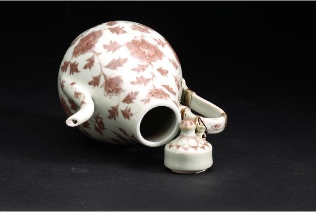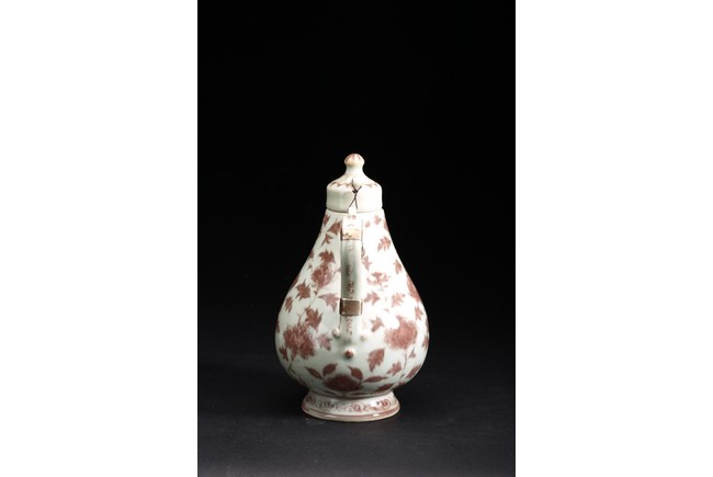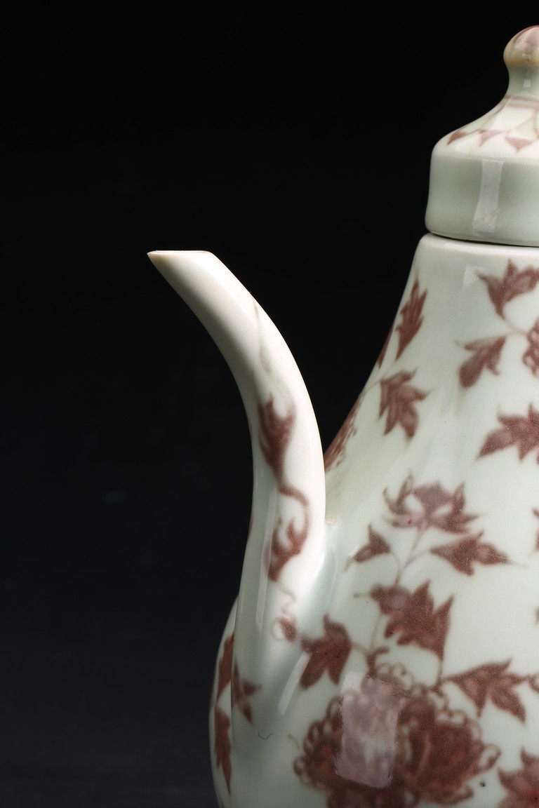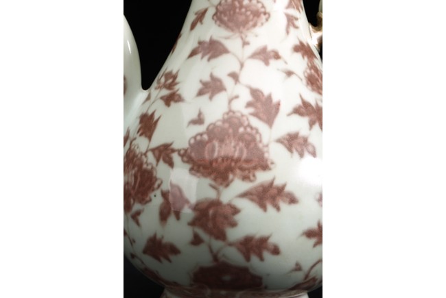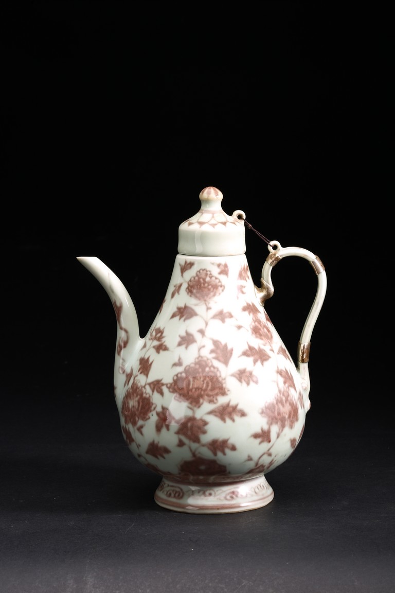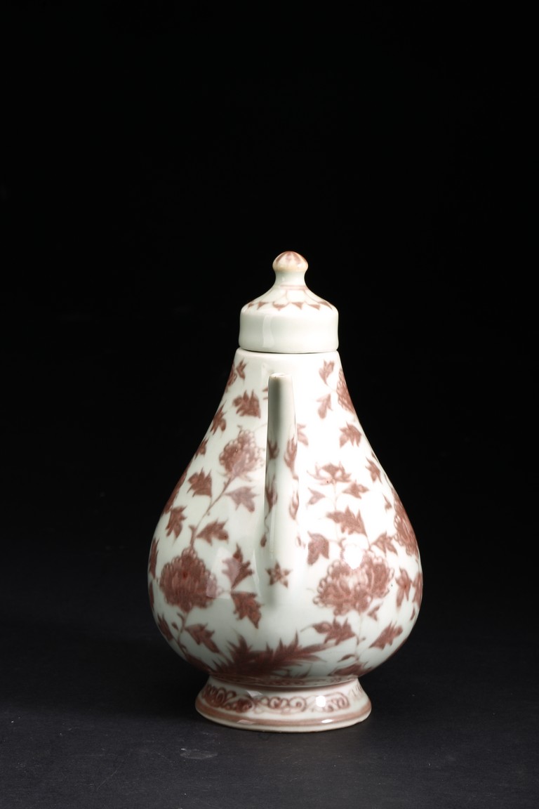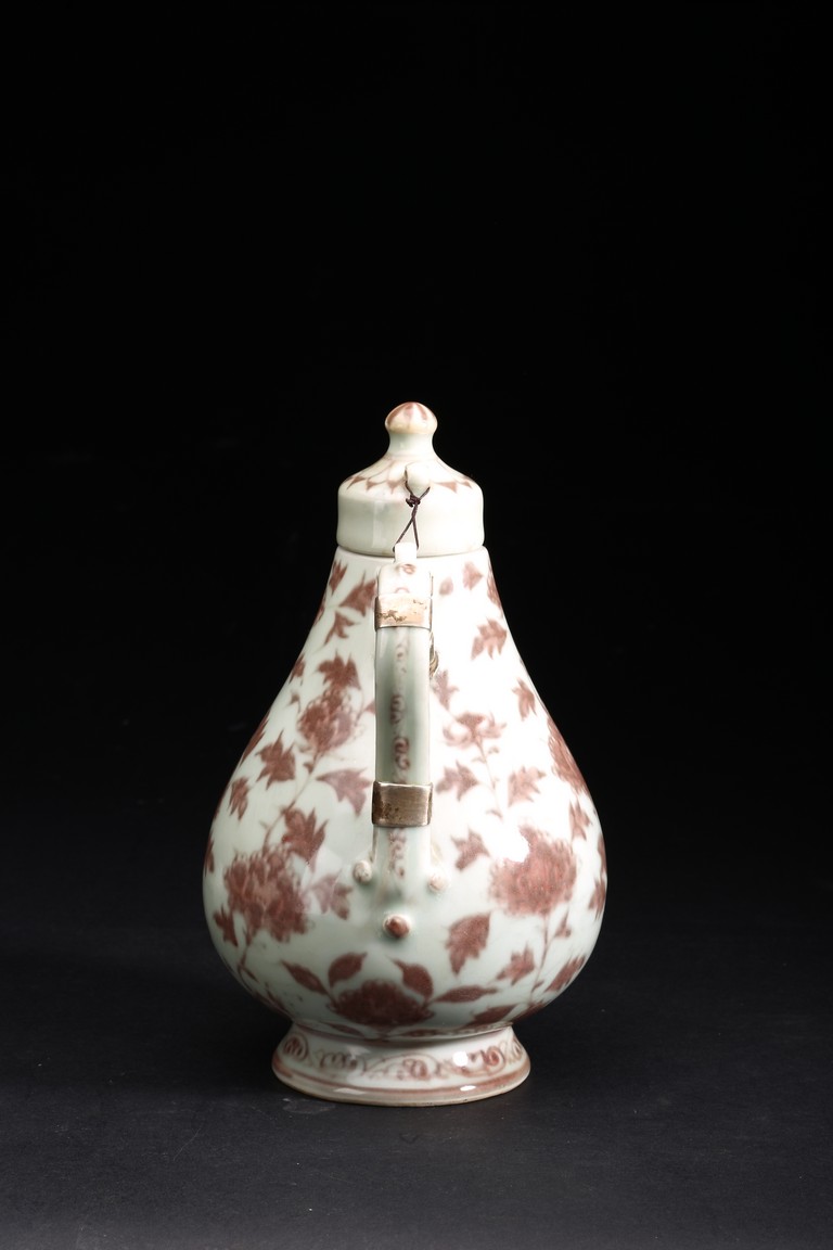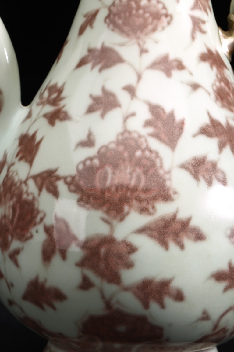 AN UNDERGLAZED 'FLOWERS' RED TEAPOT 明 釉裡紅纏枝花卉紋執壺 (壺把包銀)
