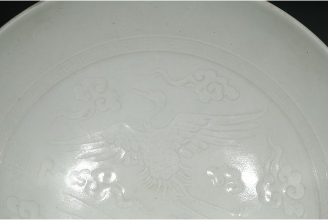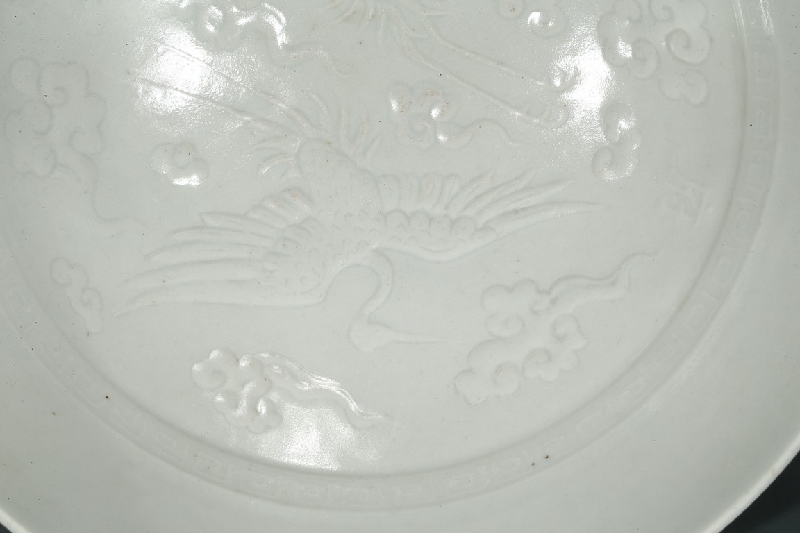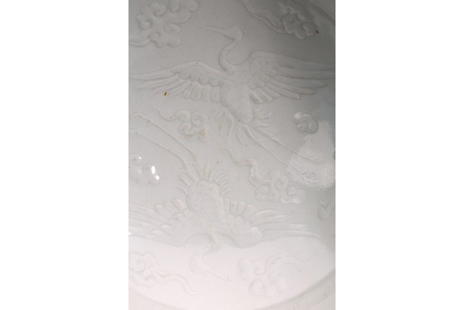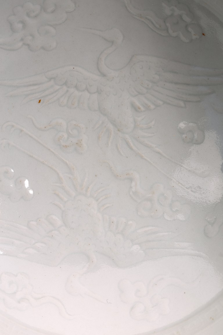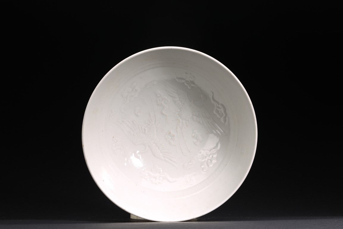 The deep rounded sides rising from a short foot ring, the interior moulded with a pair of phoenix in flight amidst auspicious clouds, overall applied with white glaze, the base unglazed.