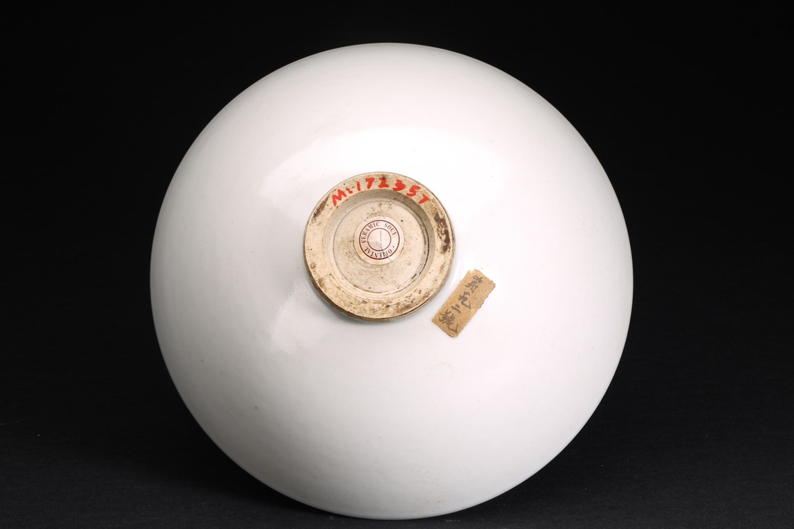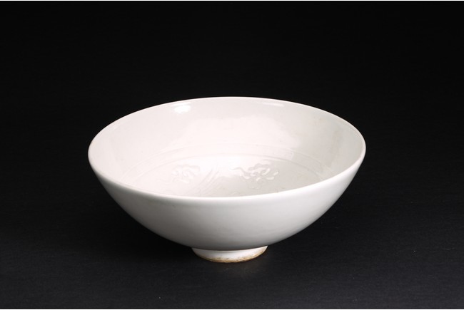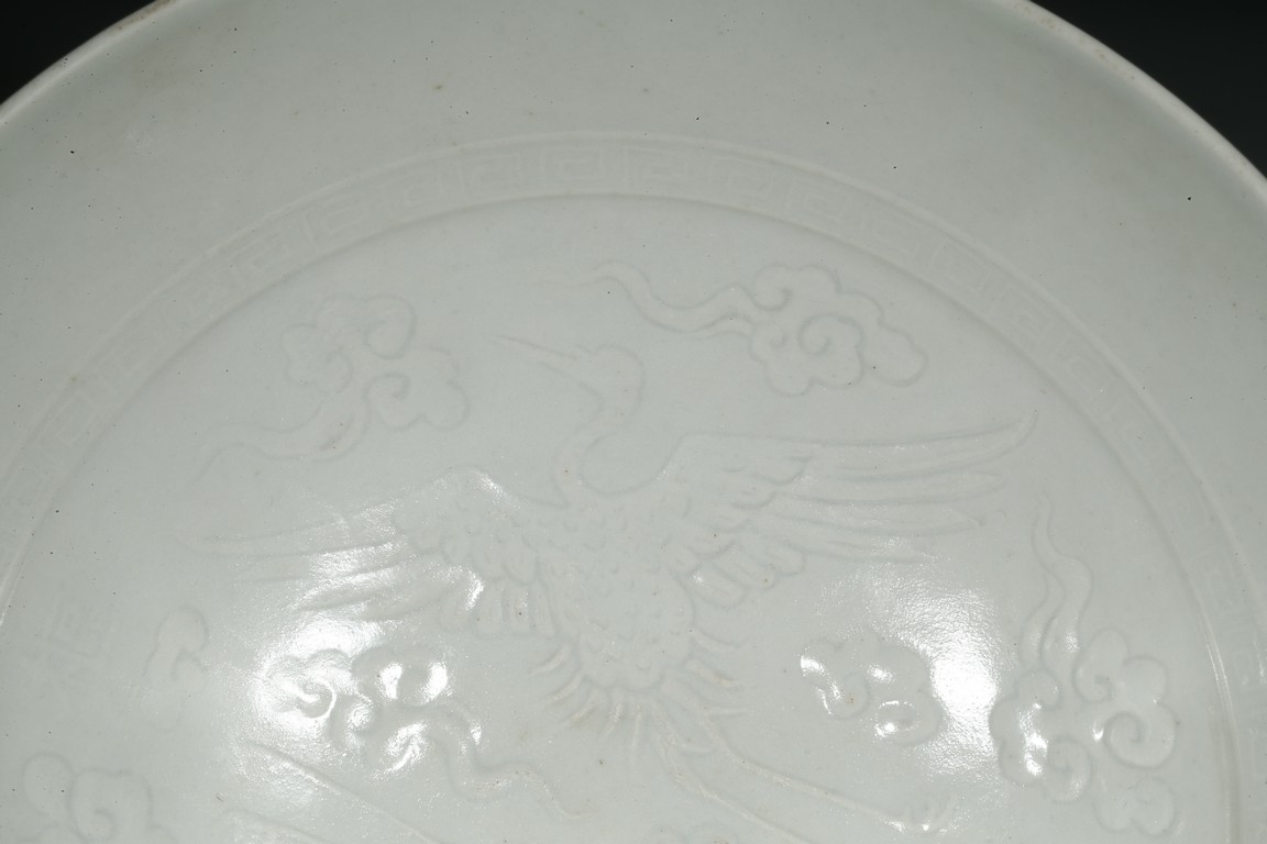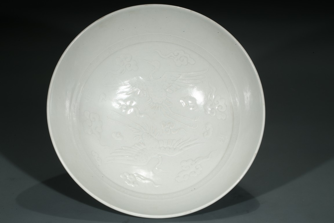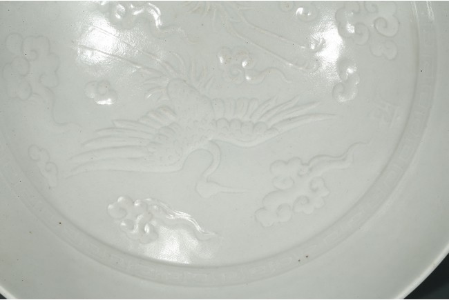 The deep rounded sides rising from a short foot ring, the interior moulded with a pair of phoenix in flight amidst auspicious clouds, overall applied with white glaze, the base unglazed.
