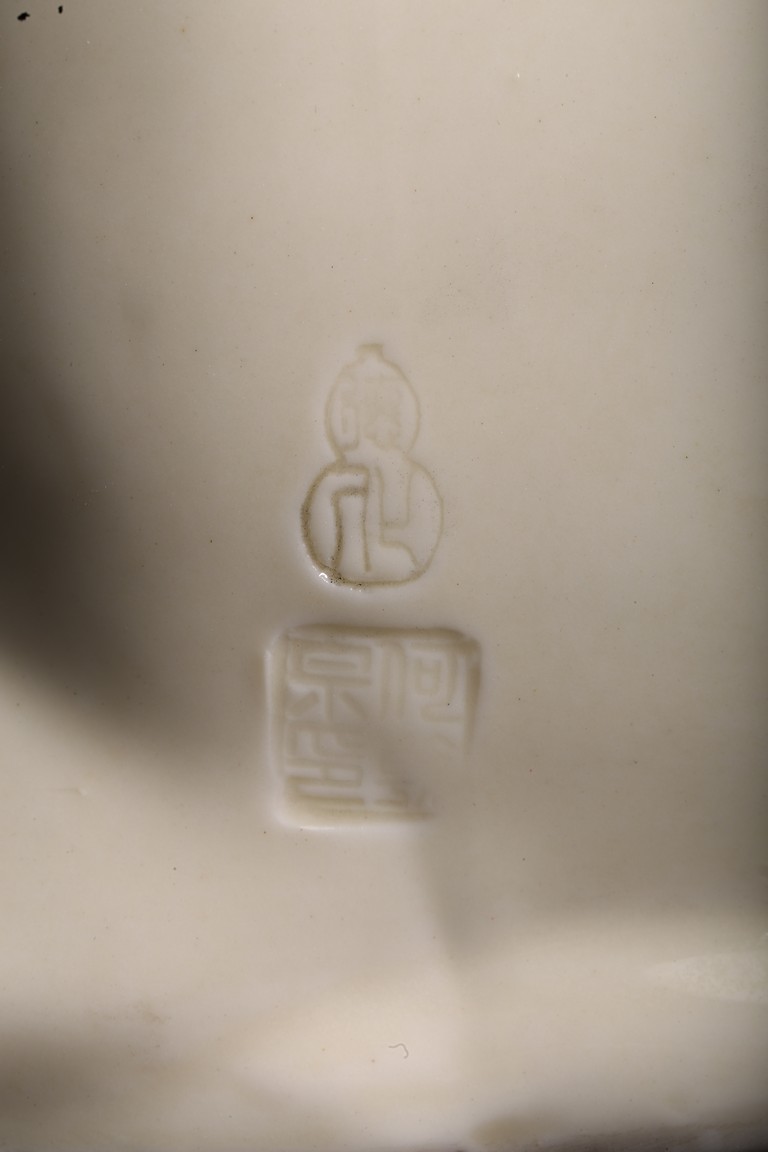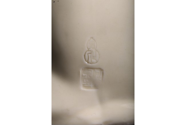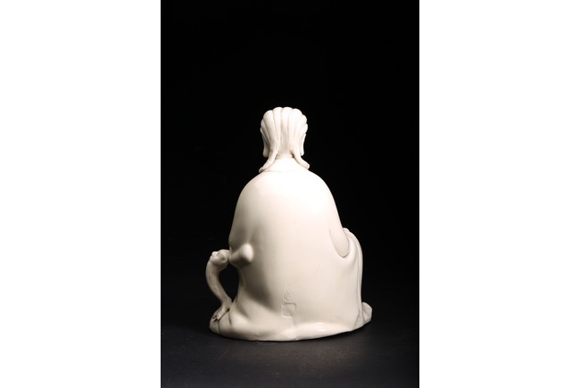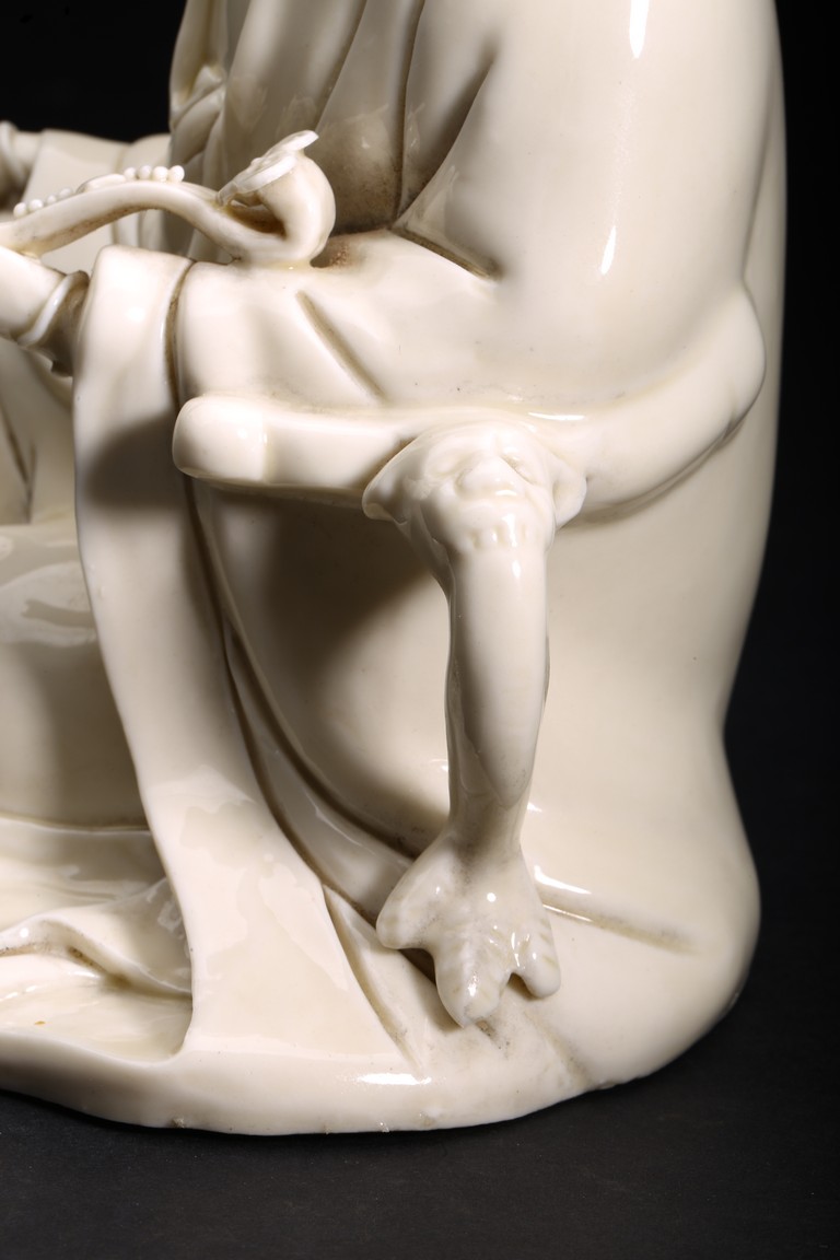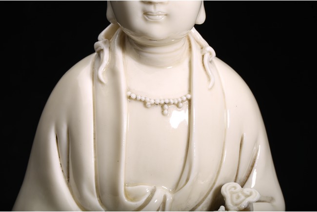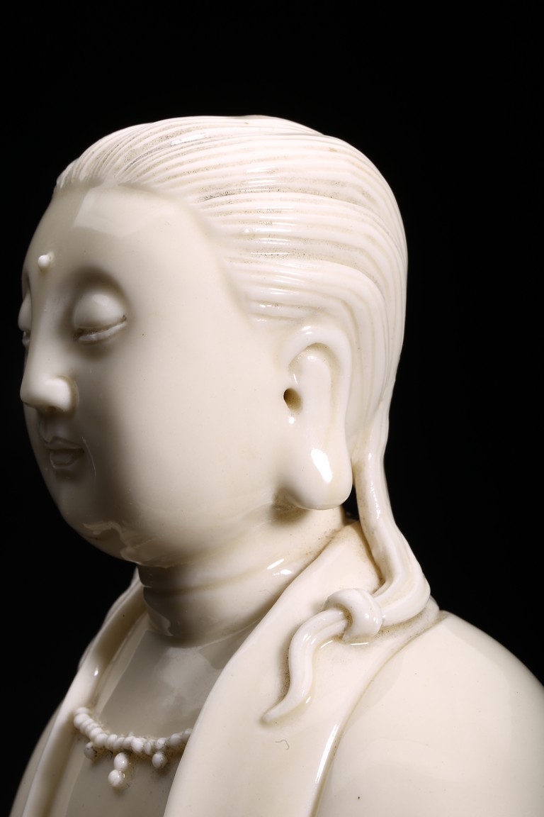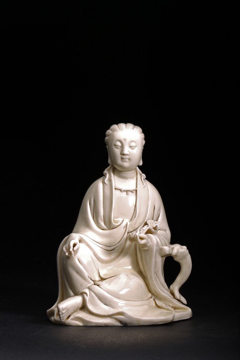The deity seated in lalitasana, draped in long flowing robes falling in folds around her feet, her shawl loosely tied at the front revealing beaded necklace on her bare chest, her right hand resting on her raised knee, the left holding a ruyi scepter, the face shown with lidded eyes and serene expression, her hair combed back into knotted plaits falling down over her shoulders, the back impressed Dehua in a double gourd above a square seal mark. Qing Dynasty period.