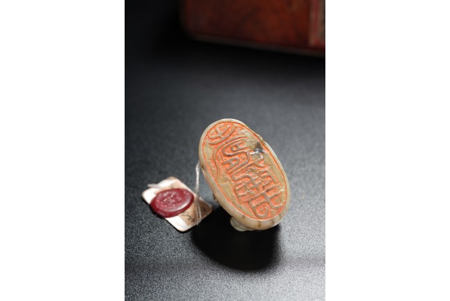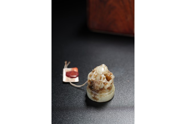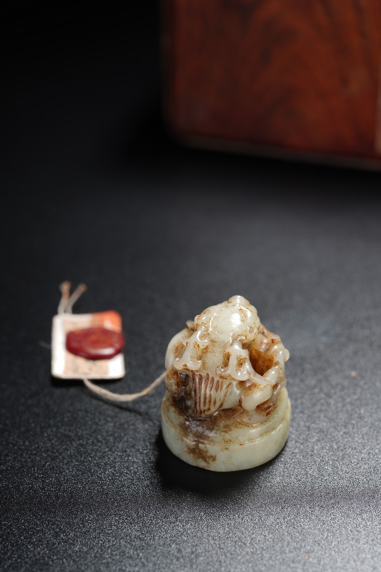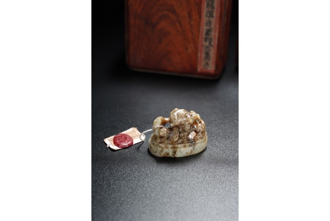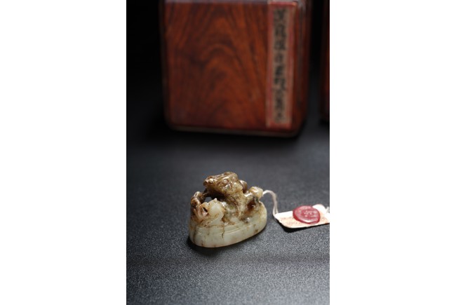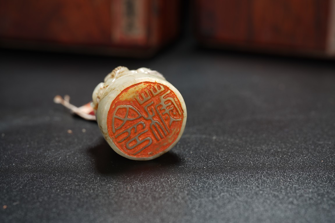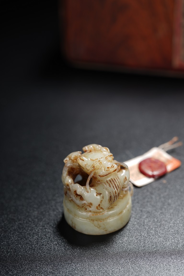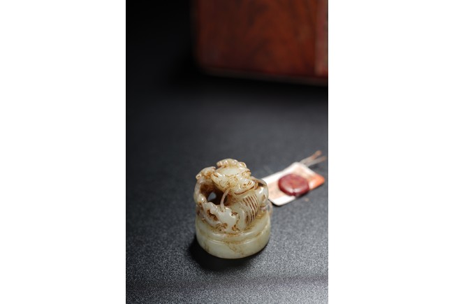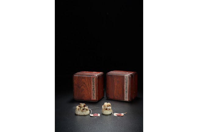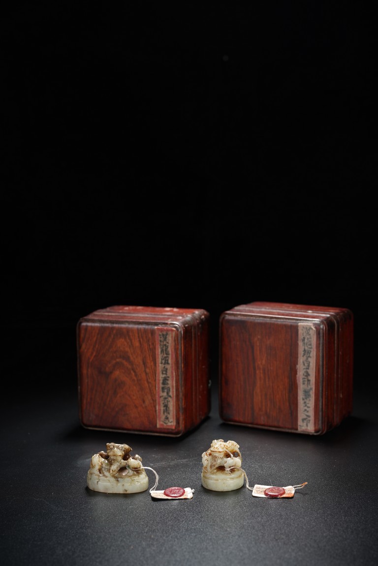 印章為白玉質,質地溫潤無暇,膩如脂膏,印鈕為一異獸,獸呈臥狀,四肢粗壯,彰顯出強大力量。獸首高昂,雙目圓睜凝視,樸茂威嚴,是不可多得之精品,成對保存完整,且原配黃花梨盒猶在,非常難得。