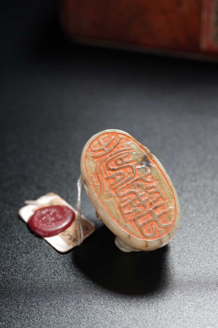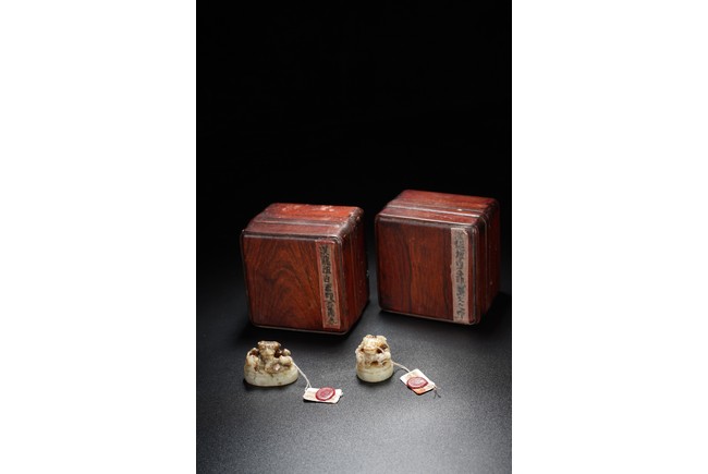 Han Dynasty or later. Comprising of two white jade seals in oval and circular section, each surmounted with a seated mythical dragon as finial, one with seal face carved with four characters, the other with two characters, accompanied with fitted Qing Dynasty period huanghuali box and cover.
