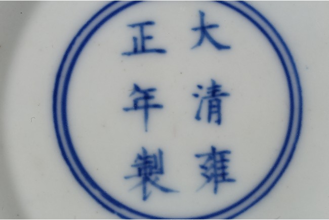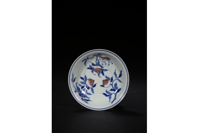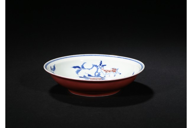Raised from circular foot base and raised to everted mouth rim, exterior suffused with red glaze, interior painted in blue and white and underglazed red with peach sprigs and deer. Qing Dynasty period.
