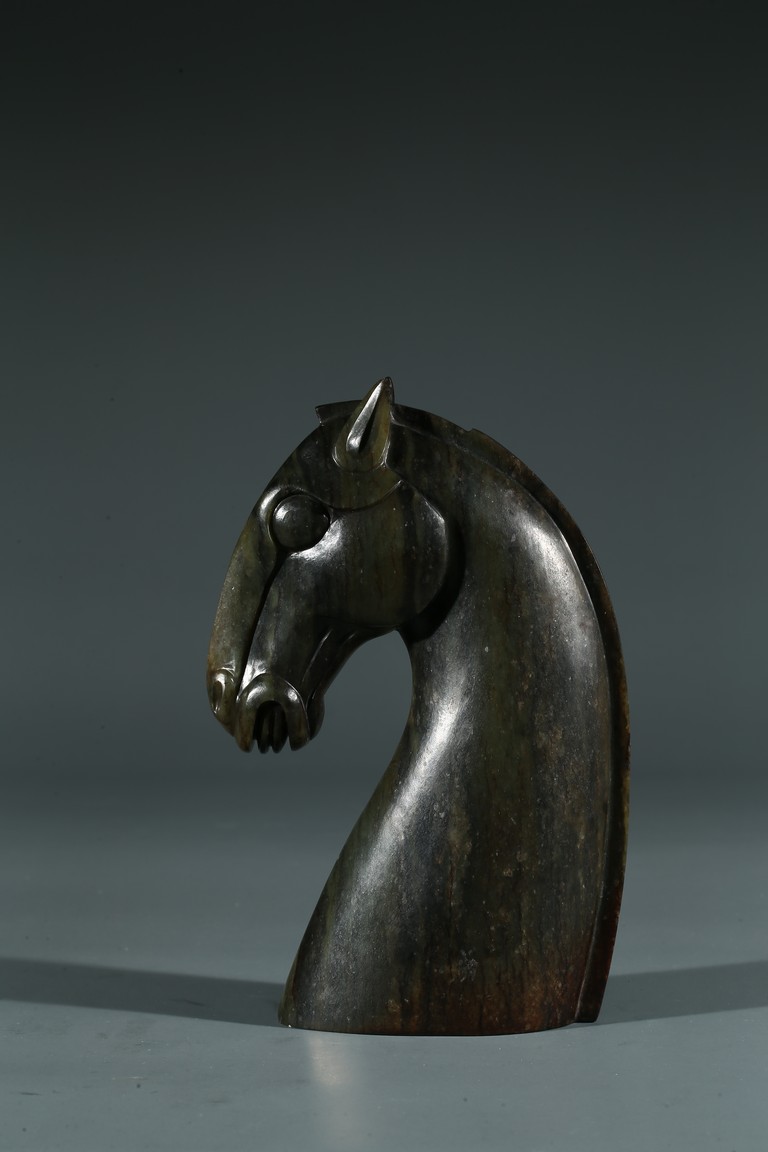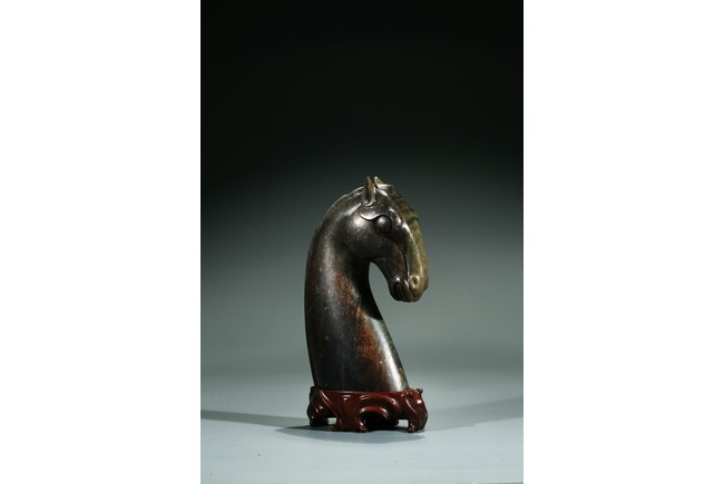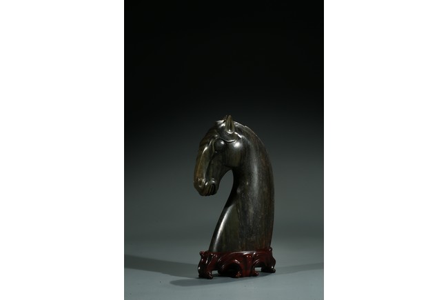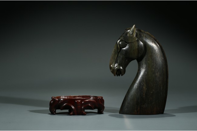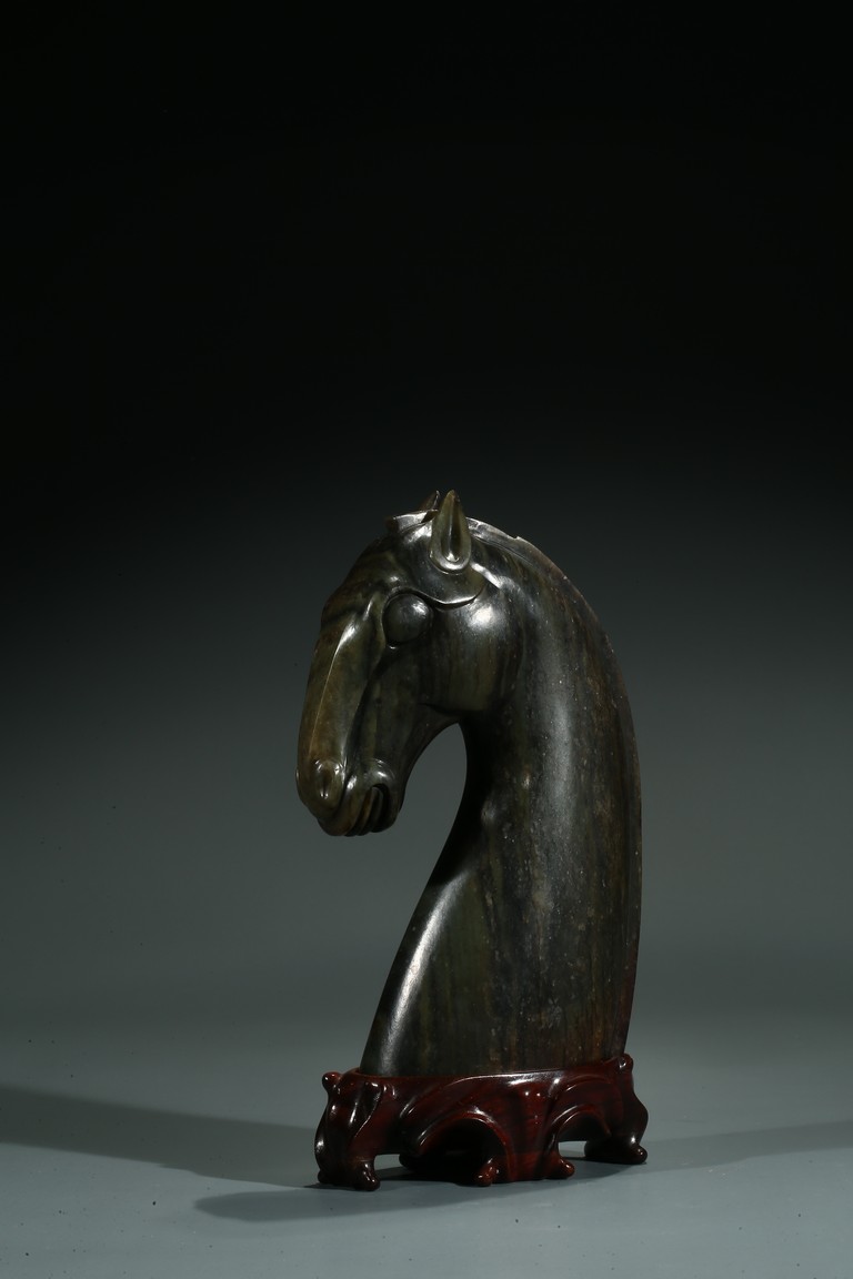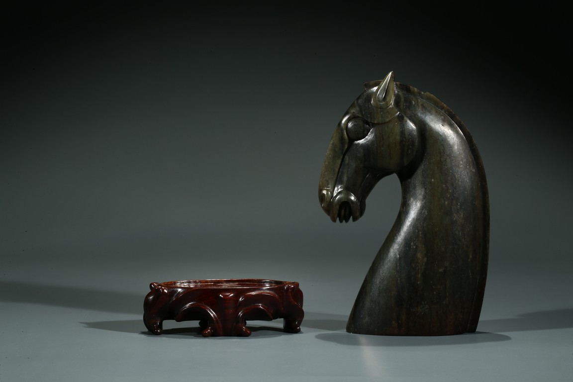 Carved realistically in the form of horse head, the back mane inscribed with four character mark Qianlong Fangu, fitted on wood stand.