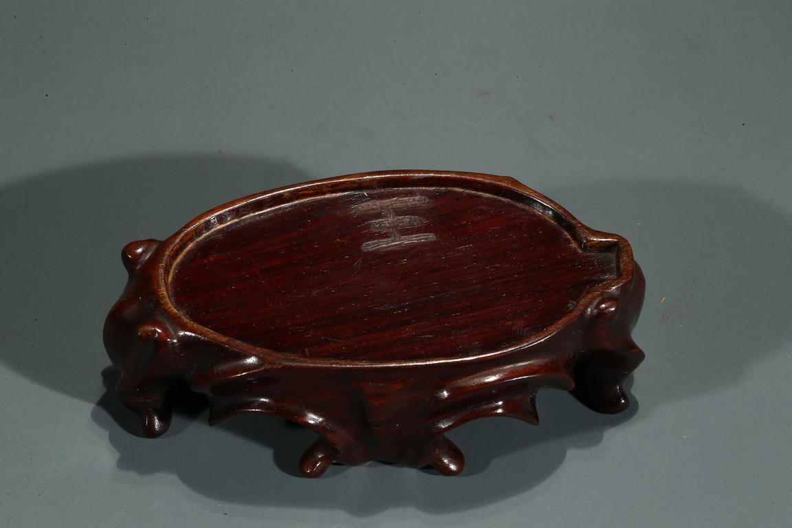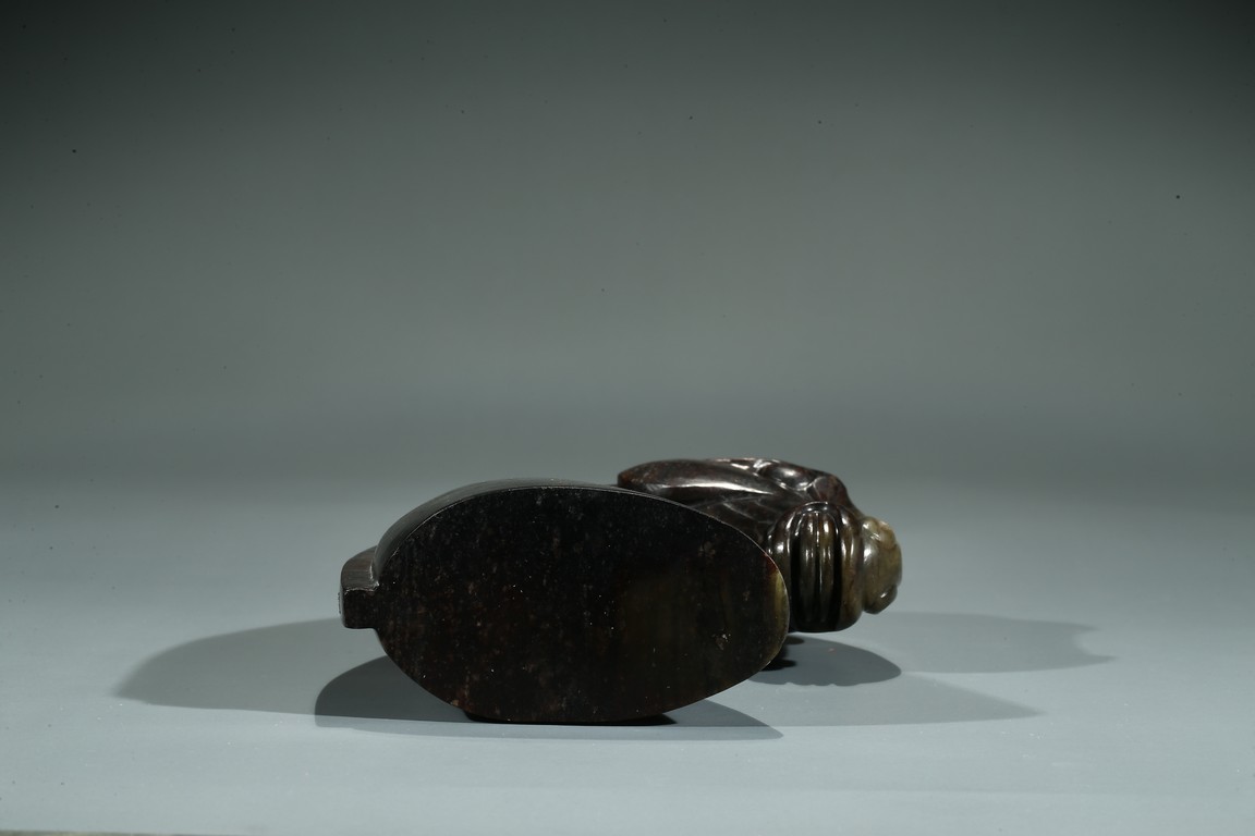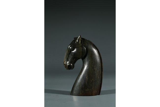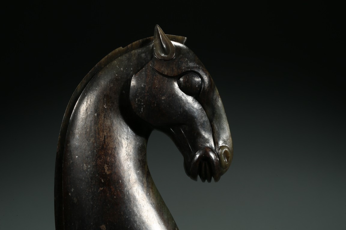Carved realistically in the form of horse head, the back mane inscribed with four character mark Qianlong Fangu, fitted on wood stand.