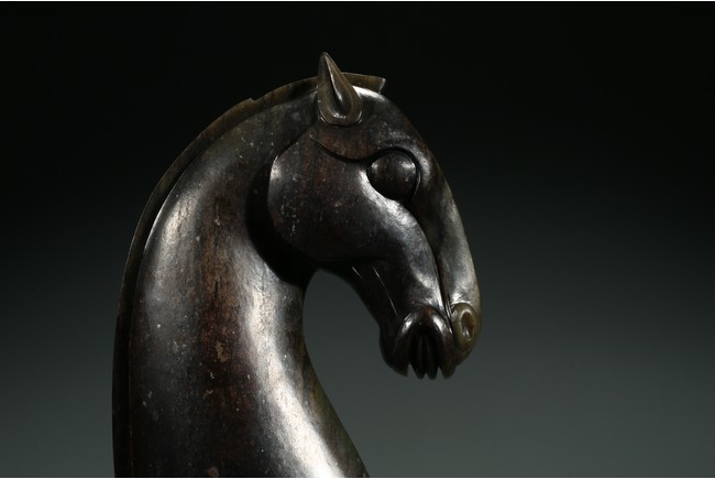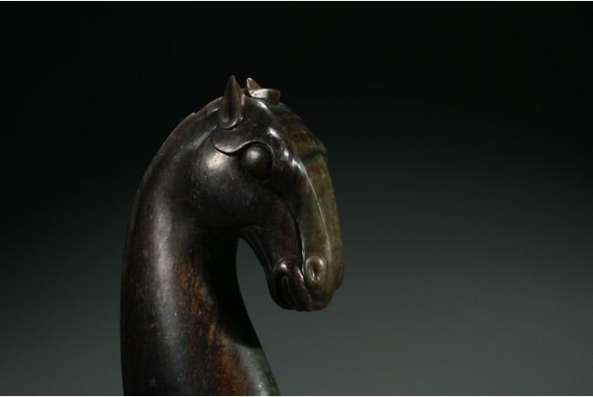 由於乾隆好古,尊古,因此於玉雕器物制作上,使仿古器物成為乾隆時期的 重要特色。從現今兩地故宮舊藏的玉器中我們可以發現,這壹時期宮廷所用玉料 以青玉和碧玉為多,比如交泰殿二十五璽中就有 15 件為青玉或碧玉制成,就連 當年乾隆帝為了紀念和闐玉得以通暢輸入內地所特制的刻禦制和闐玉詩文大盤 也為碧玉制成。可見乾隆皇帝對於這兩種玉料的偏愛。該器采用上好碧玉制成, 色澤溫潤,細膩蒼翠,帶有皮色,色澤深淺變化,錯落有致,優美至極。造型仿 漢代馬首,采用圓雕手法。馬匹對於國家的強弱盛衰起著重要作用,自古以來備 受重視。漢代出於對匈奴作戰的需要,十分重視改良馬種,專門從西域引進汗血 寶馬。 本品面部肌肉十分逼真,及其寫實。昂首豎耳,翹唇露齒,鼻孔圓張,作 嘶鳴噴氣狀;頸項粗壯,整體惟妙惟肖,穩重與莊穆。陰刻“乾隆仿古”款識,字裏填金。馬在十二地支中屬午,正是樹木旺盛,萬物欣欣向榮,充滿生機的時 刻。寓意滿懷激昂澎湃的鬥誌,邁著穩健的步伐走向成功.
