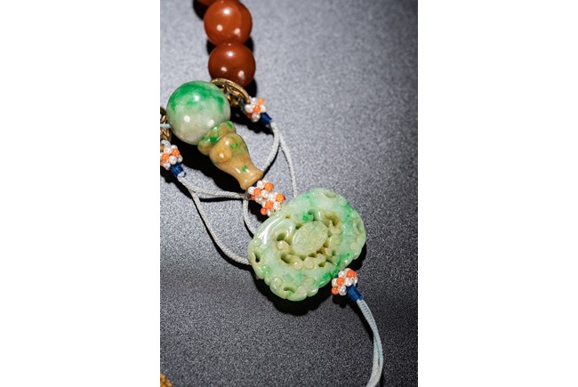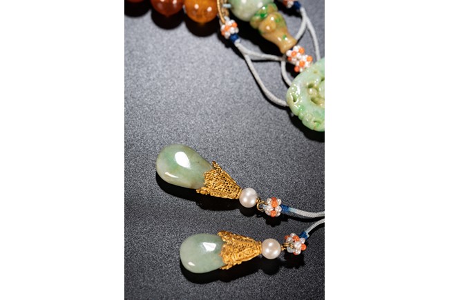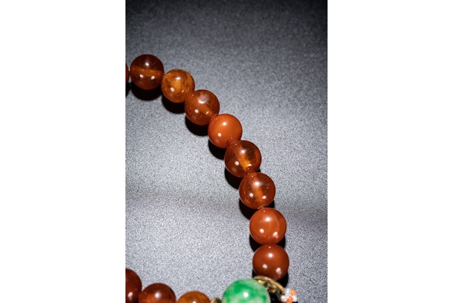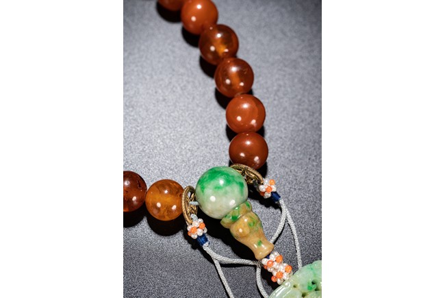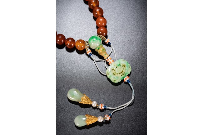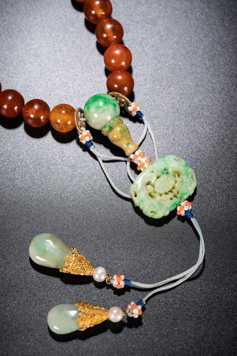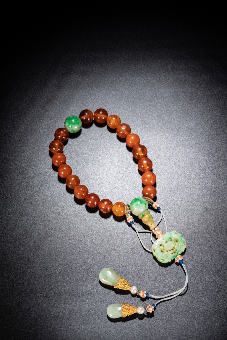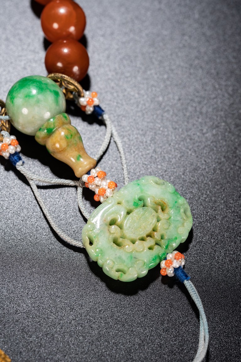本品以蜜蠟為材,色澤紅潤古雅,打磨光滑。其由十八顆大小均一的蜜蠟串珠穿成,其間對稱兩顆略大的翡翠質佛頭,其中一顆下穿同樣質地的翡翠佛塔,再下絳帶系一扁圓形翡翠背雲,鏤雕雲蝠紋飾,上下飾白色米珠結,淺藍色絳帶下分兩股,各接一翡翠墜角。按其雕工用料,為清宮廷之物,品相極佳,包漿溫潤。可參考一類似清代琥珀手串, 售于香港佳士得,2015年6月,Lot 3159,成交價300,000港幣 來源:內華達州亨德森市私人藏家收藏 Provenance: Private collection, Henderson, Nevada