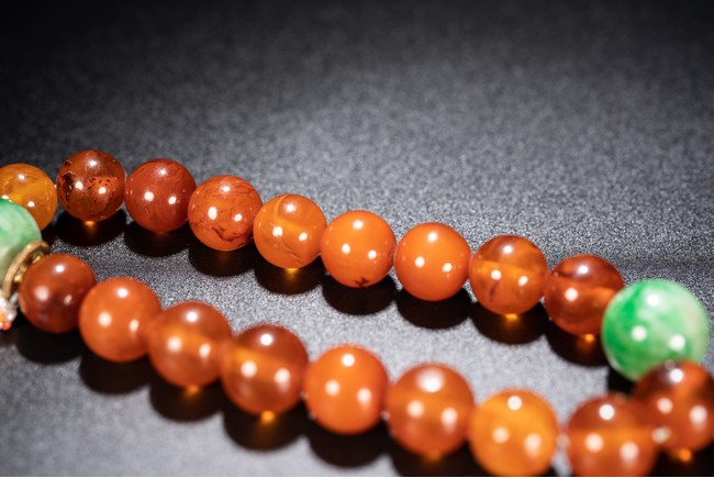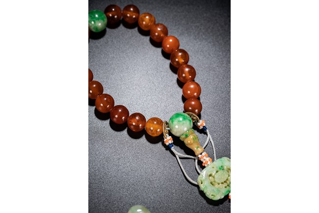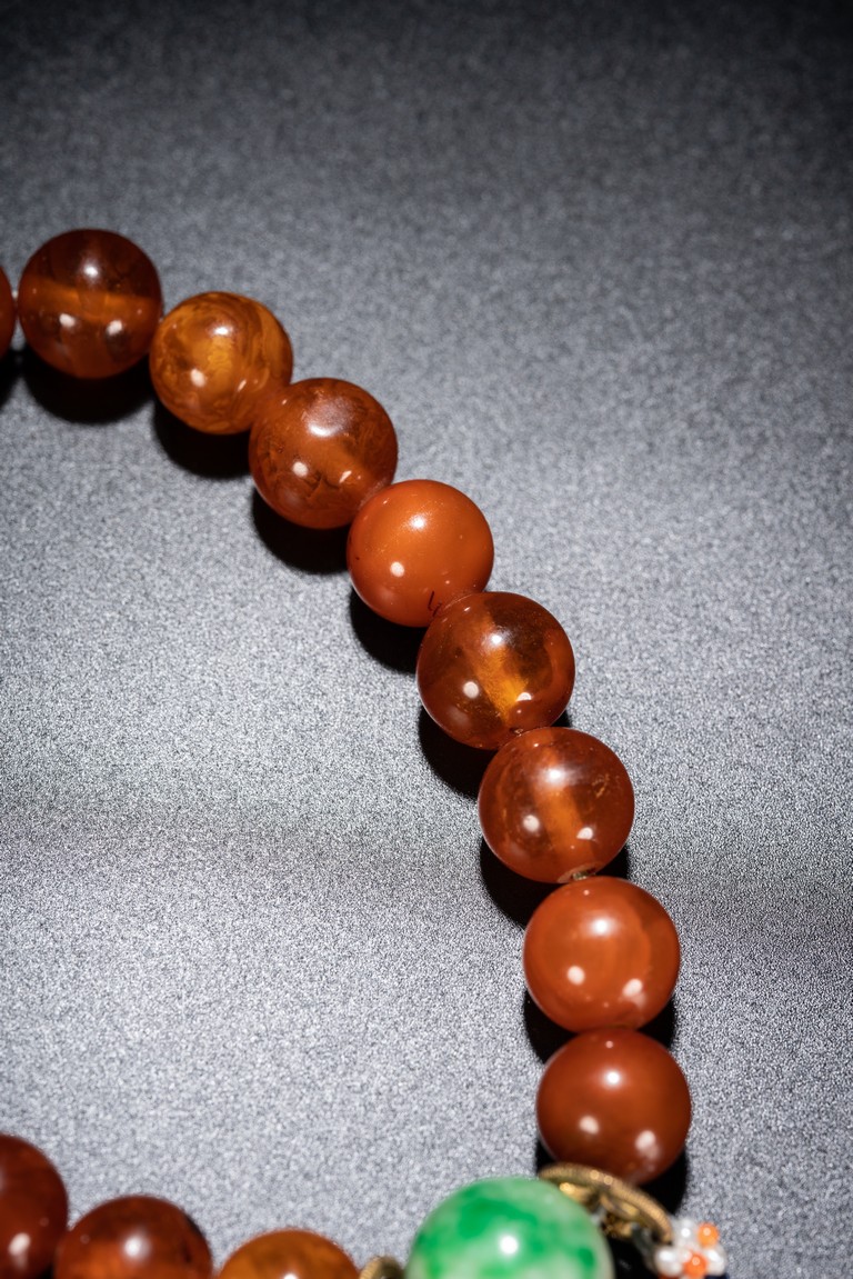 Qing Dynasty period. Composed of eighteen orange colored translucent amber beads, in between two jadeite beads with one forming a central double gourd from which suspended with two jadeite beads. Compare a similar amber rosary bracelet, sold in Christie's Hong Kong, Lot 3159, June 2015, for 300,000 HKD