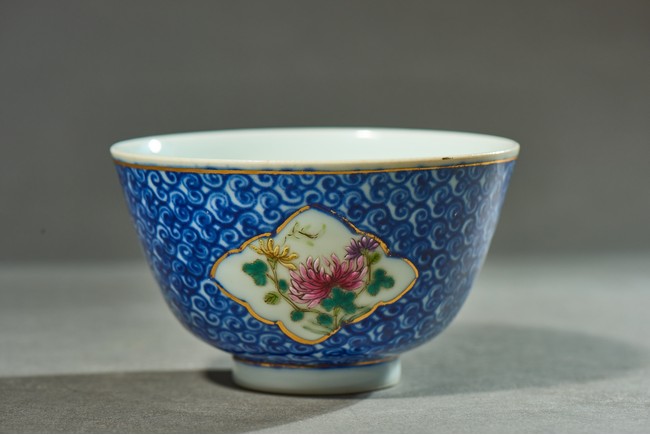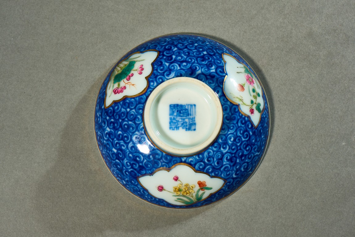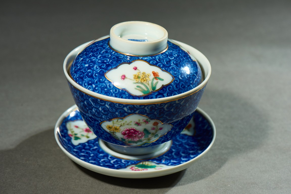 The cup body decorated with shaped cartouches enclosing flowers surrounded by dense cloud pattern, the cover and stand decorated with similar pattern, the base and cover top inscribed with marks. Qing Dynasty period.