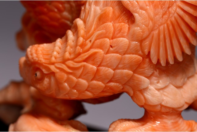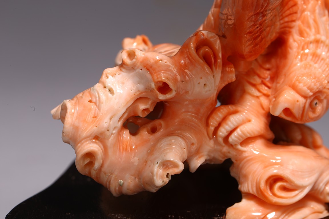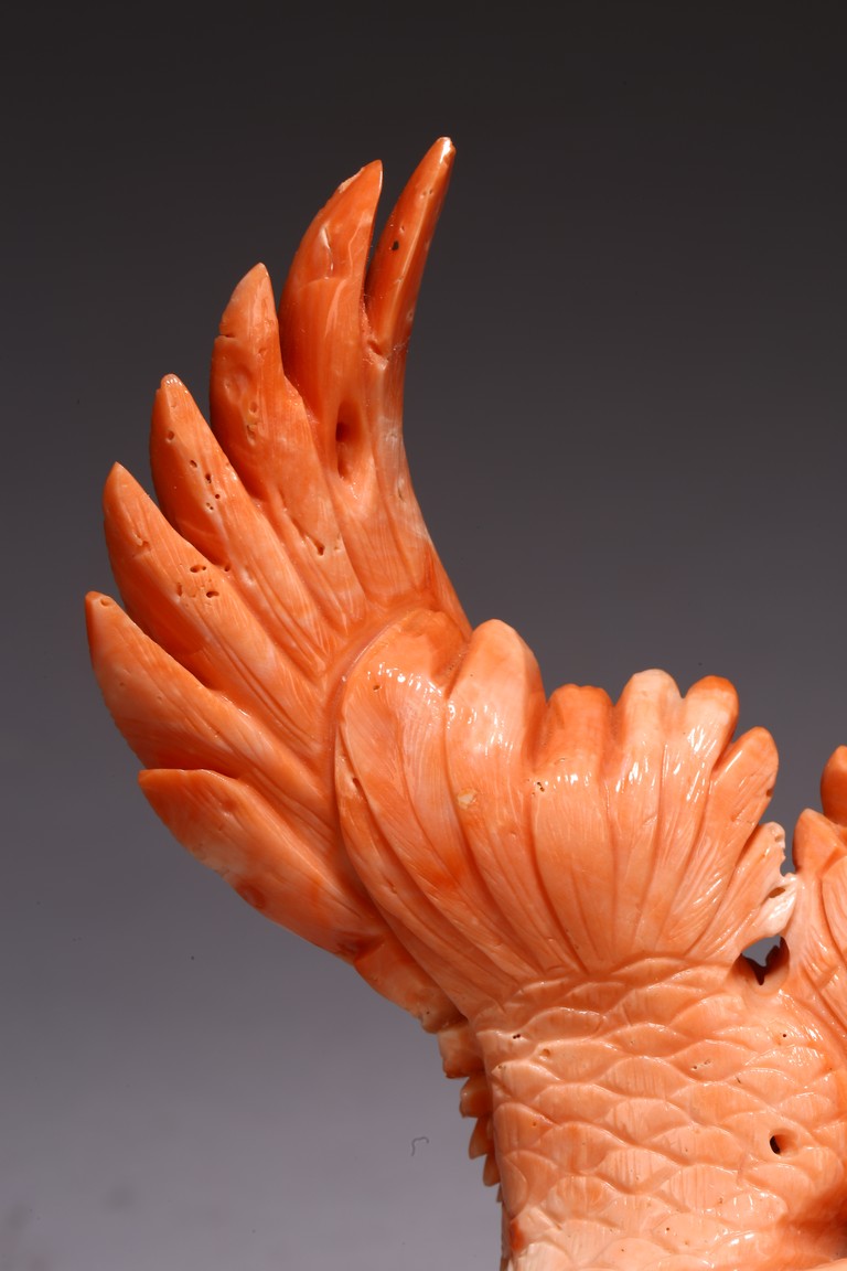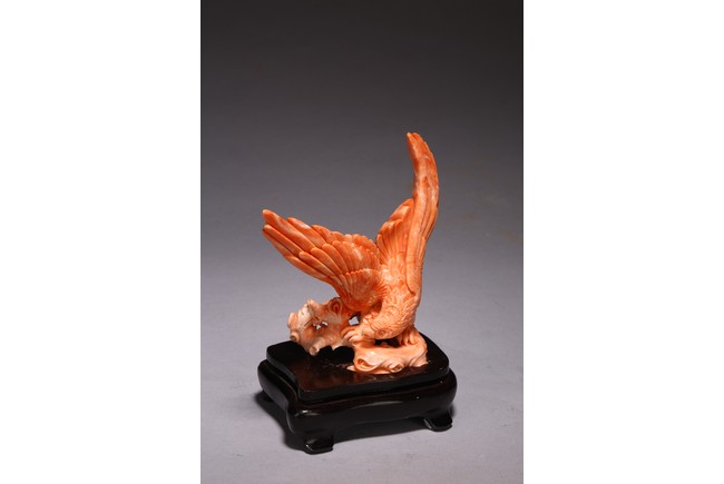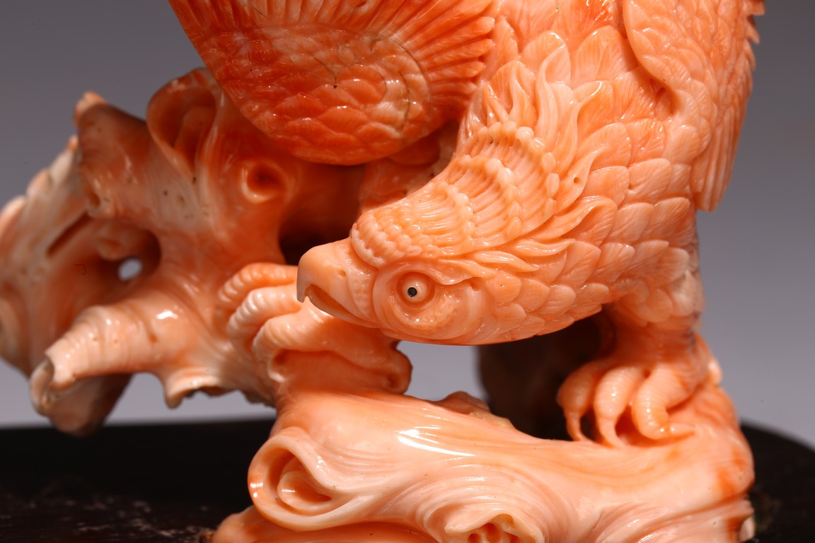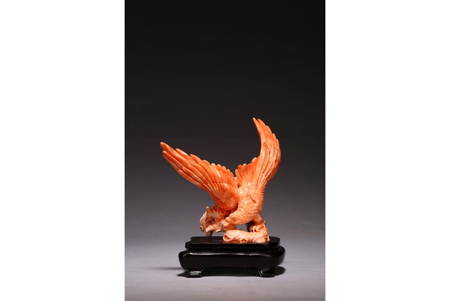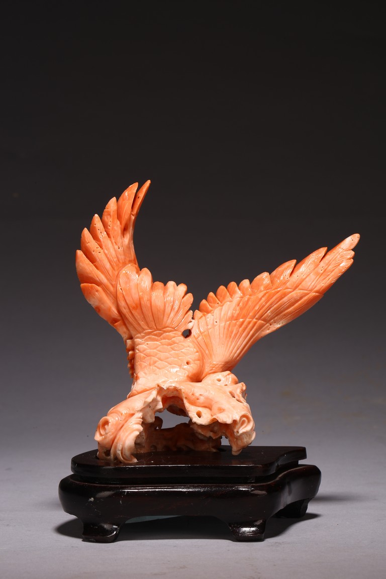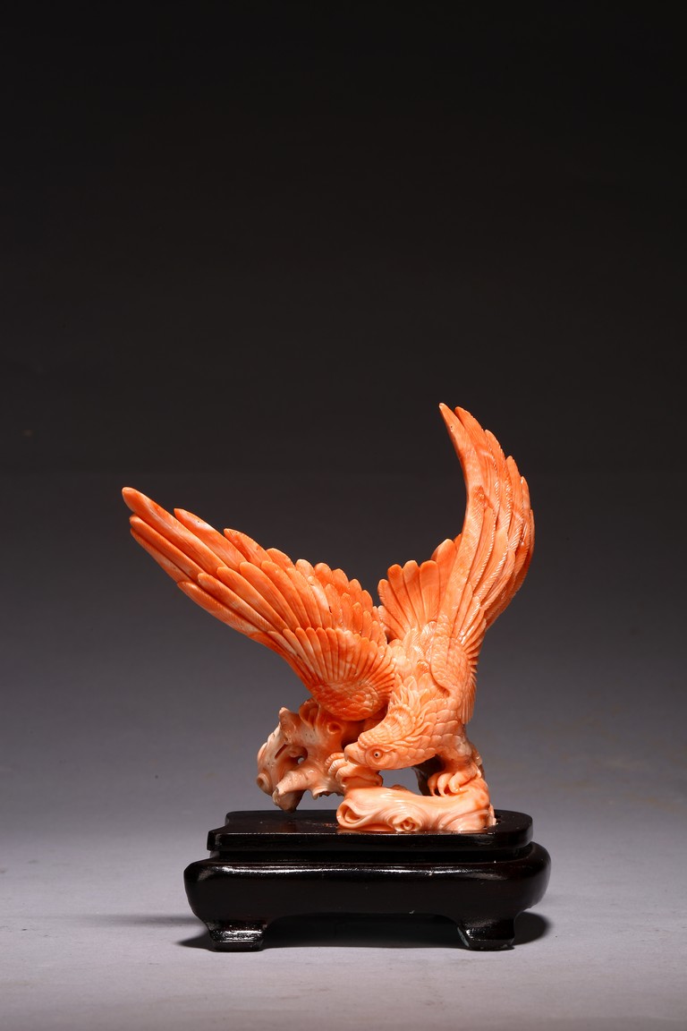 此珊瑚鵬程萬里雕件,所用珊瑚料色澤鮮艷,自然,雄鷹形態兇猛逼真,值得收藏。來源:洛杉磯教授藏家收藏 Provenance: Property from a professor's collection, Los Angeles