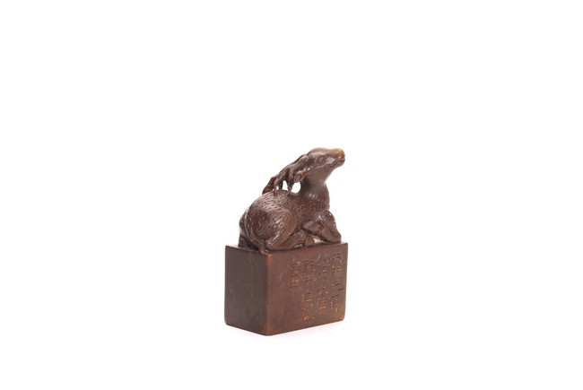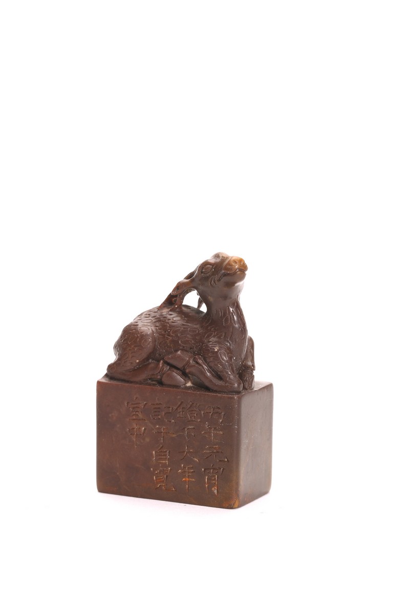 Of rectangular section, the seal inscribed and signed Danian dated to 1906, the seal top carved with a recumbent deer, the seal face carved with six characters.