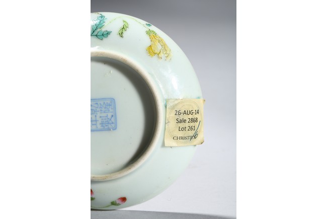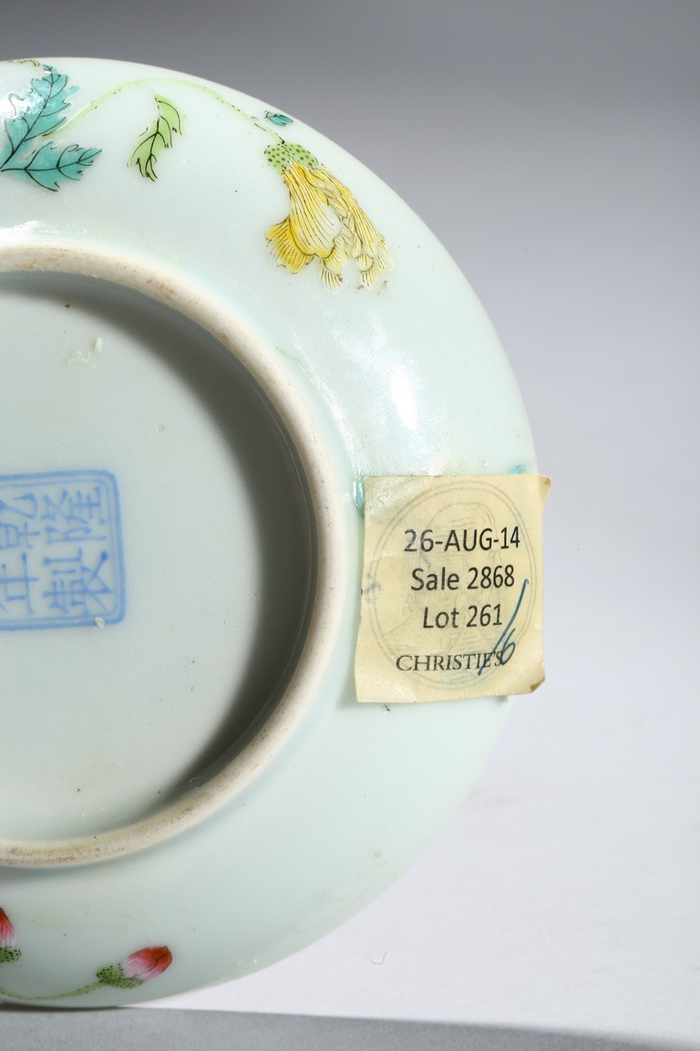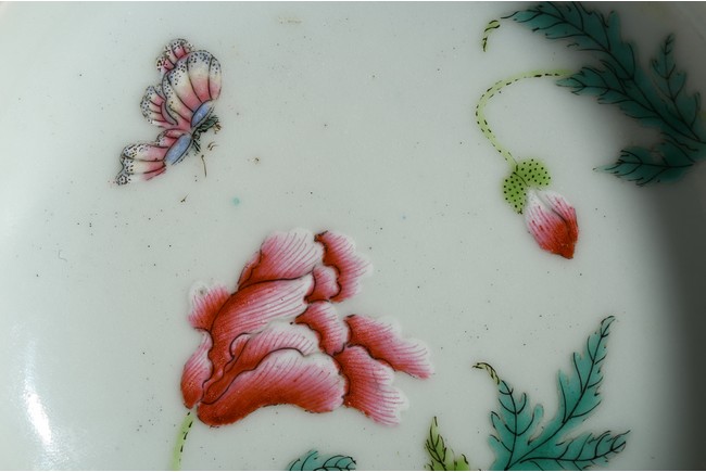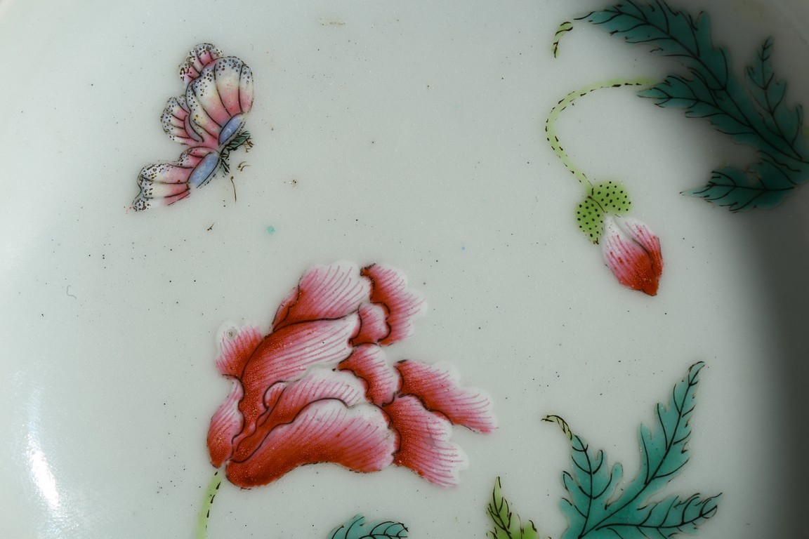 Finely enamelled with flowers and butterfly to the interior, the exterior with leafy flower blossoms,the base with apocryphal QIANLONG four character mark. Late Qing Dynasty period.