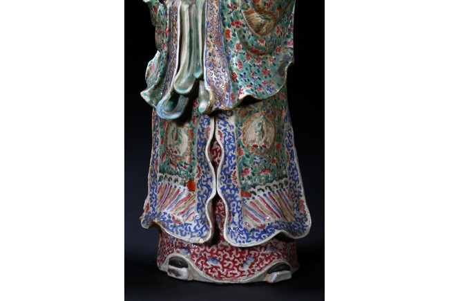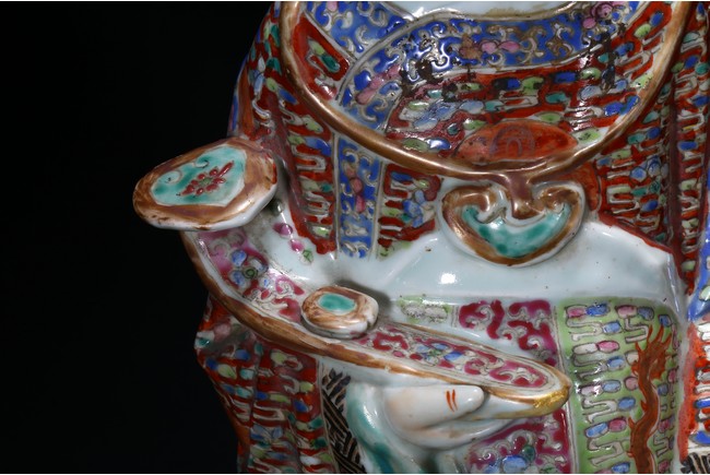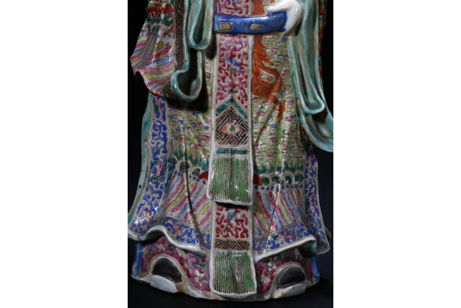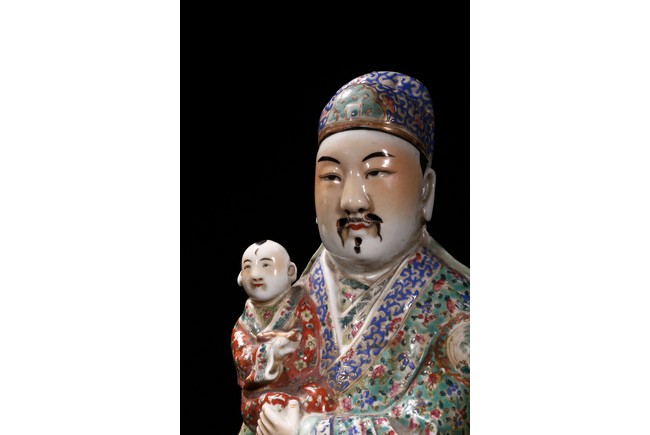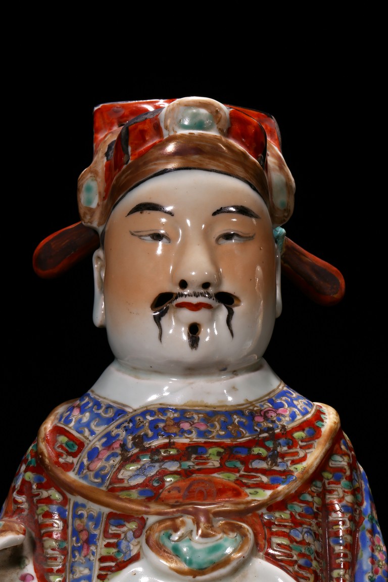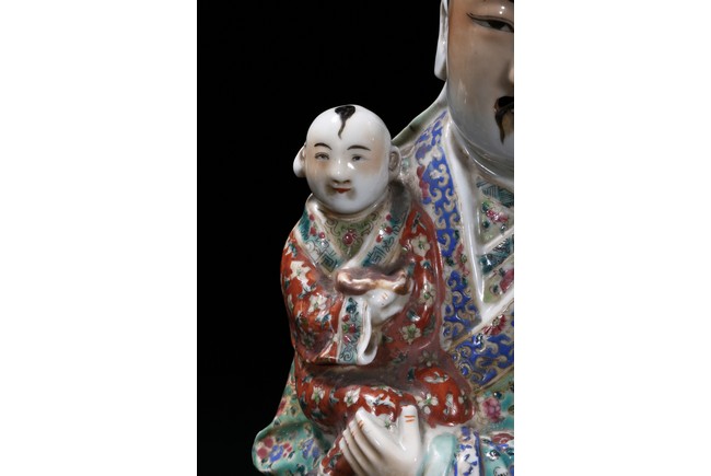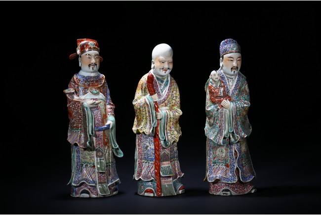 Late Qing Dynasty period. Depicting Shou (longevity) as a bald and white-bearded old man with the staff, Fu (wealth) lifting a baby who grasps a gold ingot and Lu (official status) holding a scepter in his left hand and grasping his official's belt with his right hand (Lu's bonnet lacking crossbar).