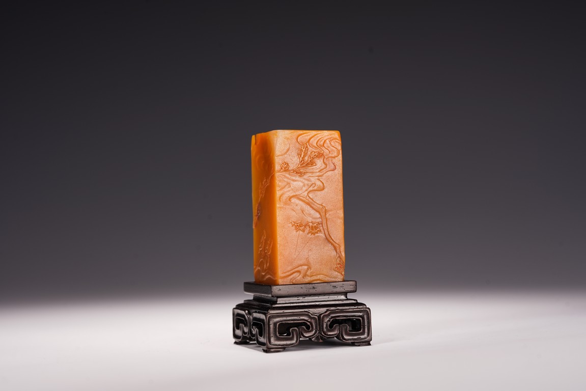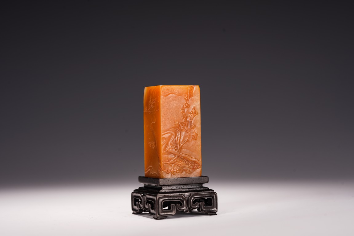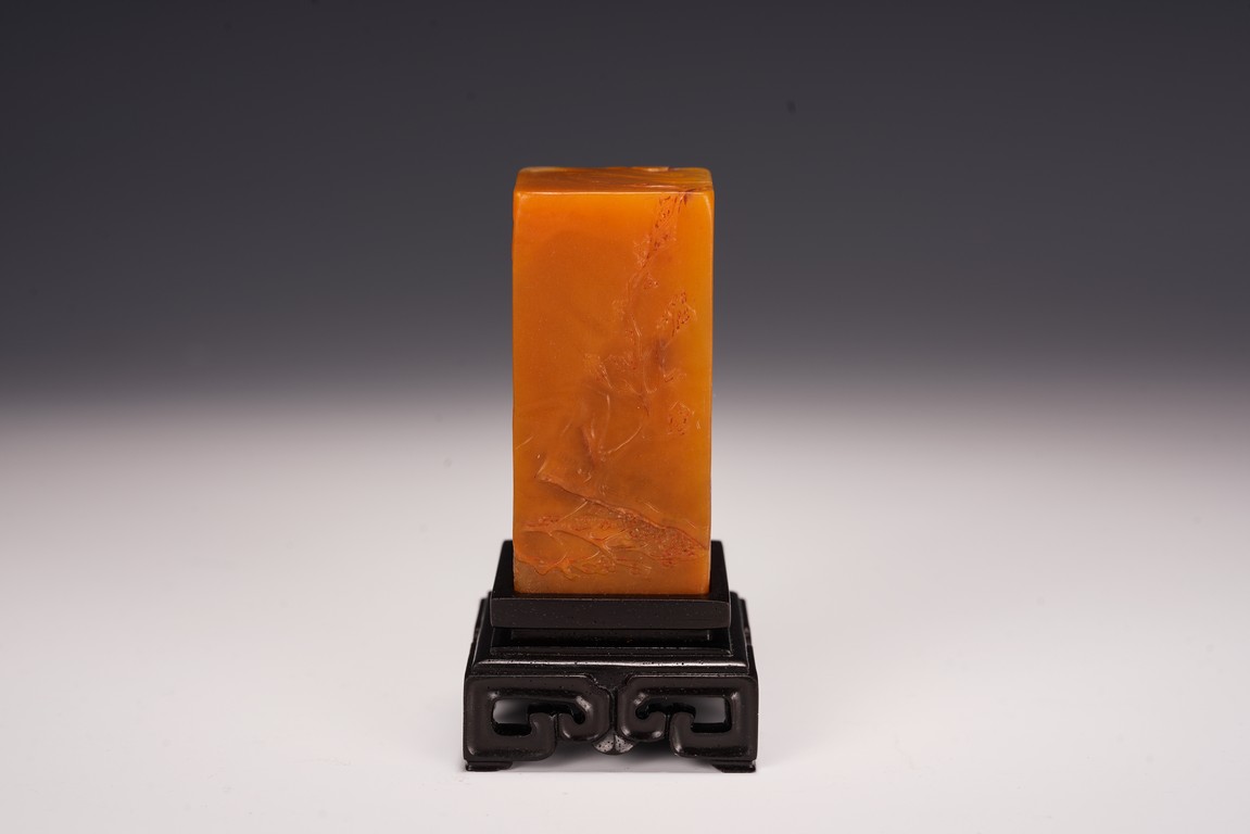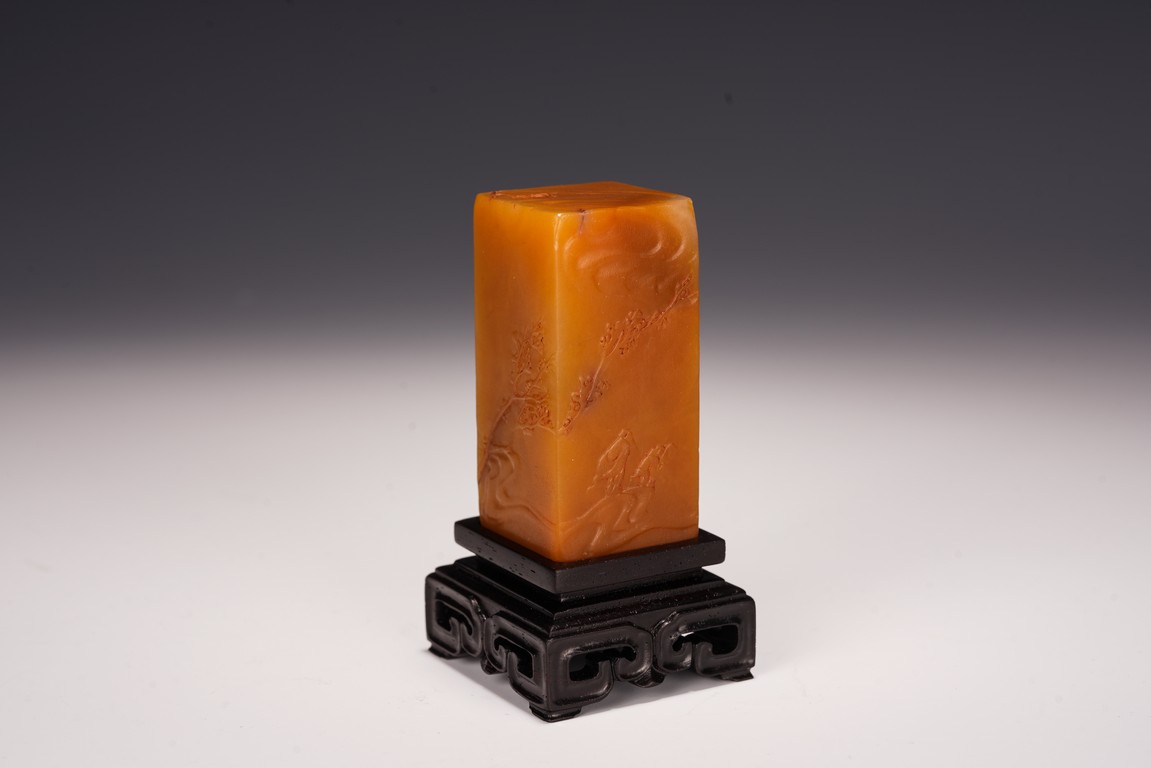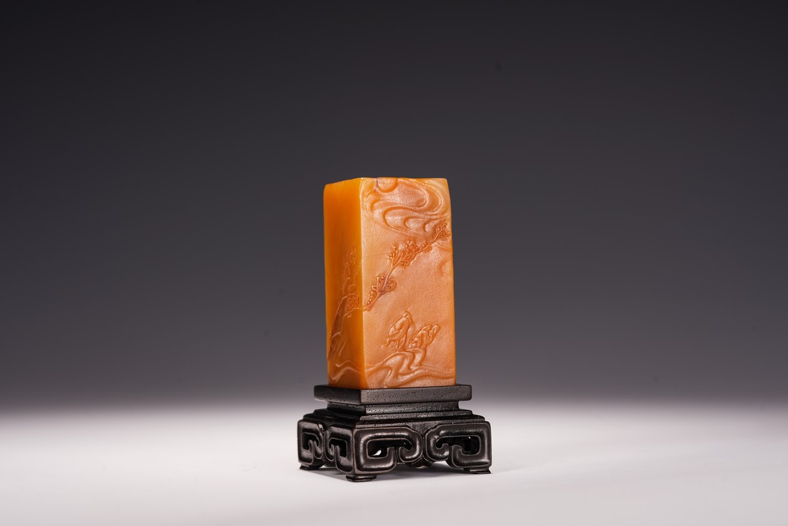 此件田黃方章,通體色呈深熟栗,包漿瑩潤,古光可照。質地凝結,蘿卜絲紋縷縷散布於印身,偶見紅筋。雕工精準,遠山近景,高士山林中攜琴訪友,比例清雅,意境高遠,原配紫檀方座