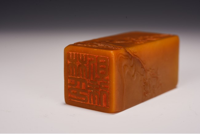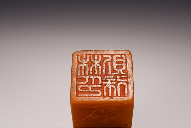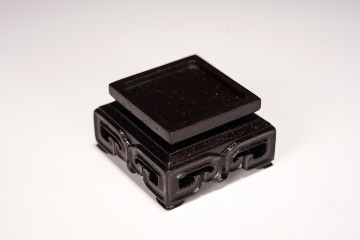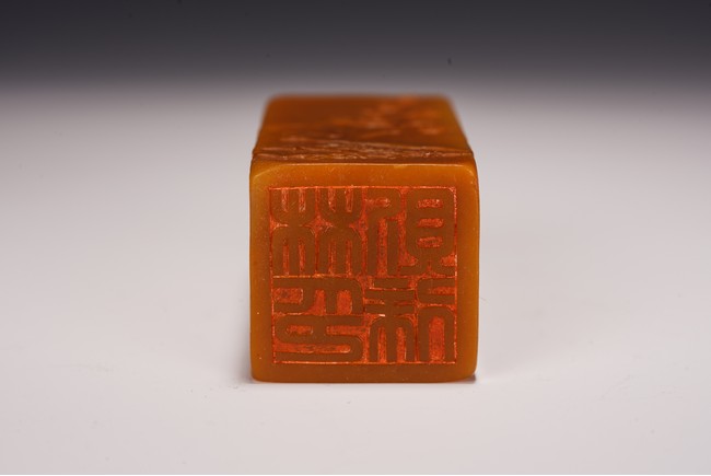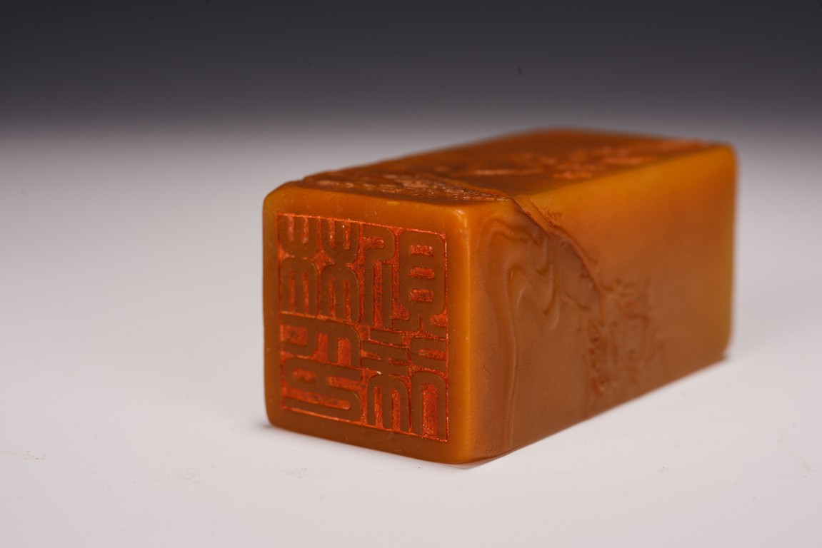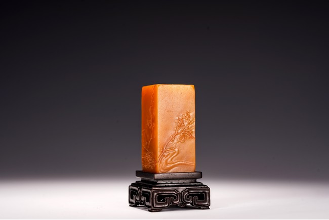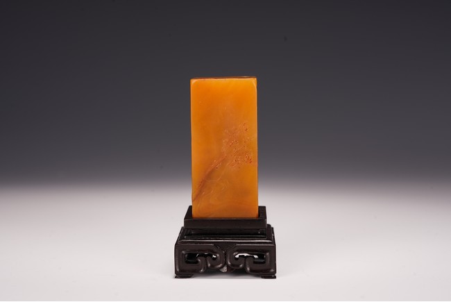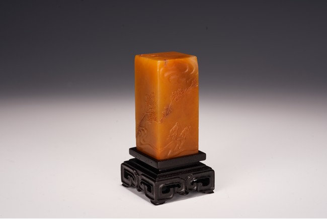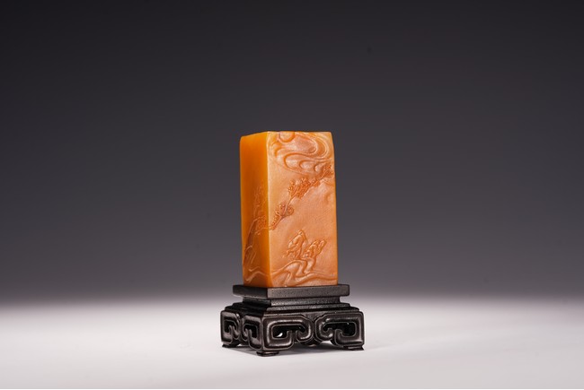 此件田黃方章,通體色呈深熟栗,包漿瑩潤,古光可照。質地凝結,蘿卜絲紋縷縷散布於印身,偶見紅筋。雕工精準,遠山近景,高士山林中攜琴訪友,比例清雅,意境高遠,原配紫檀方座