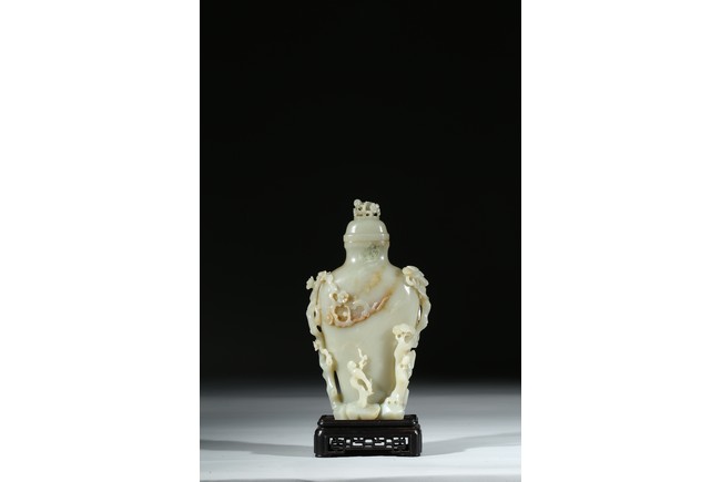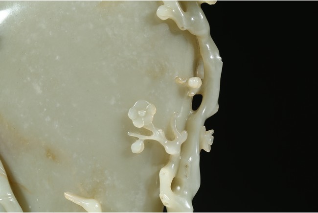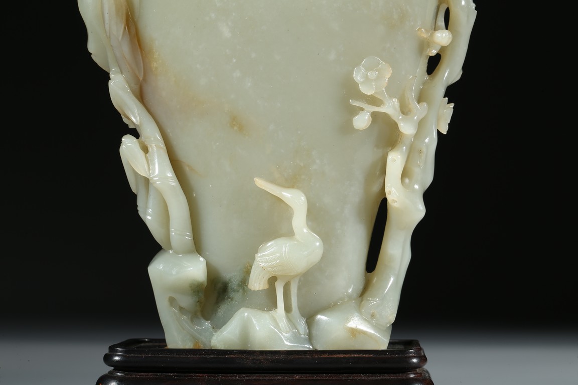 此瓶青白玉為胎,質地溫潤細膩,光澤如膏似脂。圓雕寶瓶,器形規整,仙鶴、梅花圍繞周圍,一側樹下石上,仙鶴迴首挺立,氣度不凡。寓意美好,仙鶴有“延年益壽”“福壽綿綿”之意。此瓶選料精,製作美,構思巧,堪稱三絶。