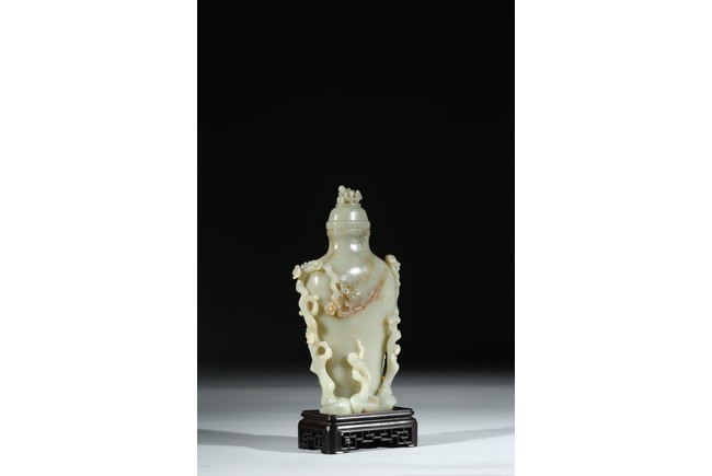 Carved as a flattened baluster vase raised on a rocky base from which grows a prunus and pine tree carved in high relief on both sides, with magpie and crane standing upon the rock bases, the top finial carved in openwork to depict a sitting quail.