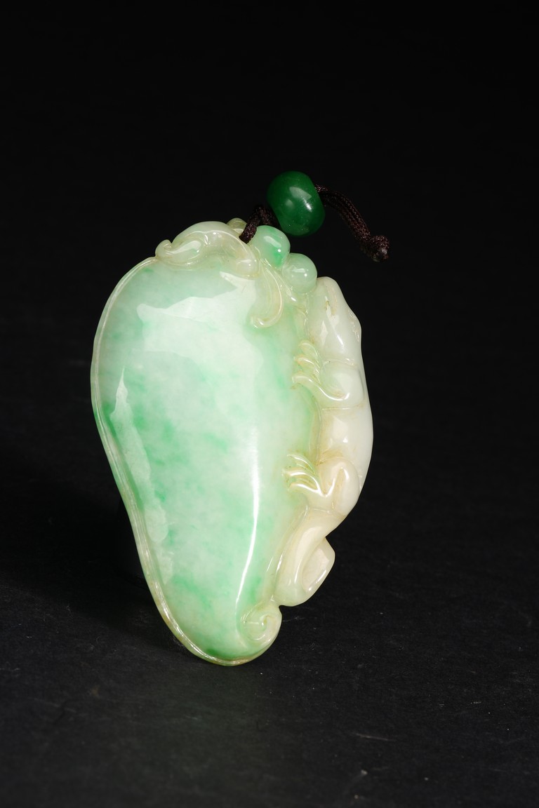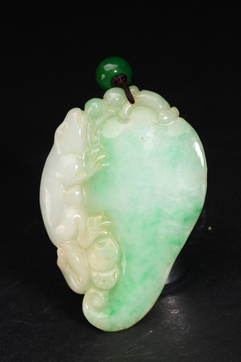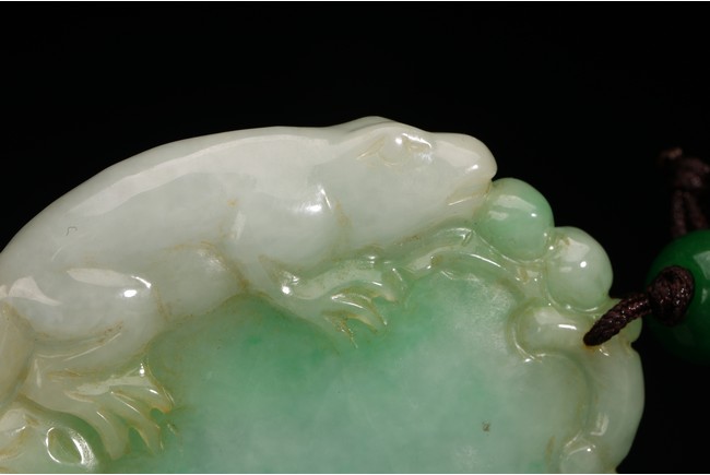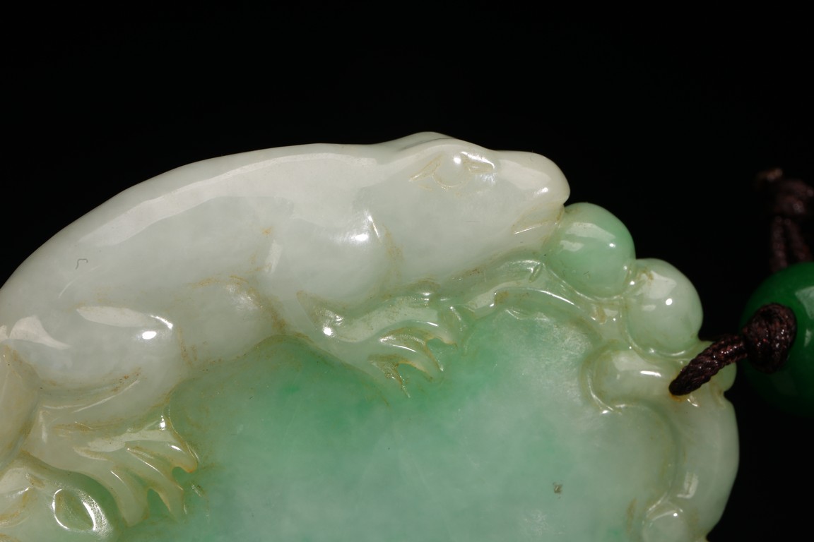此吊墜形似佛手,浮雕一小獸匍匐在其左側,口吐寶珠,輪廓清晰,活靈活現。翠色極佳,翠質細膩。