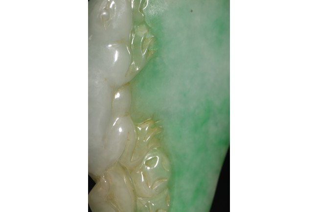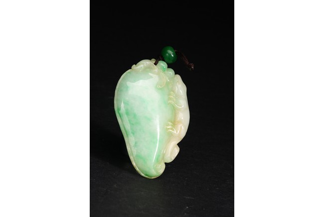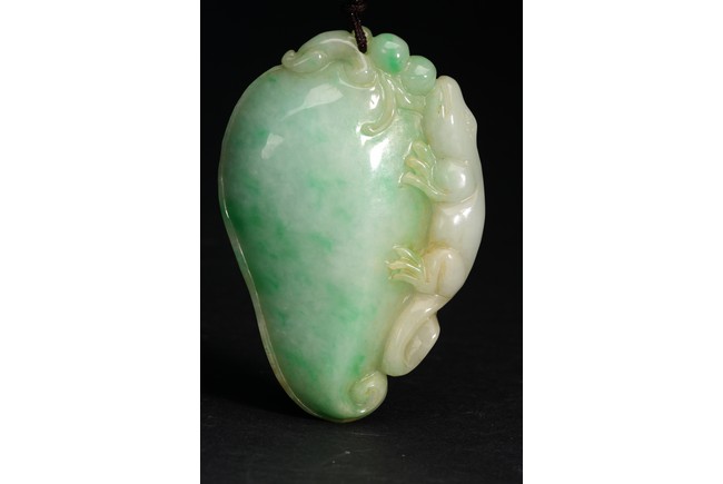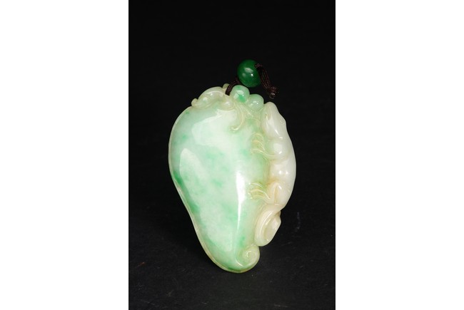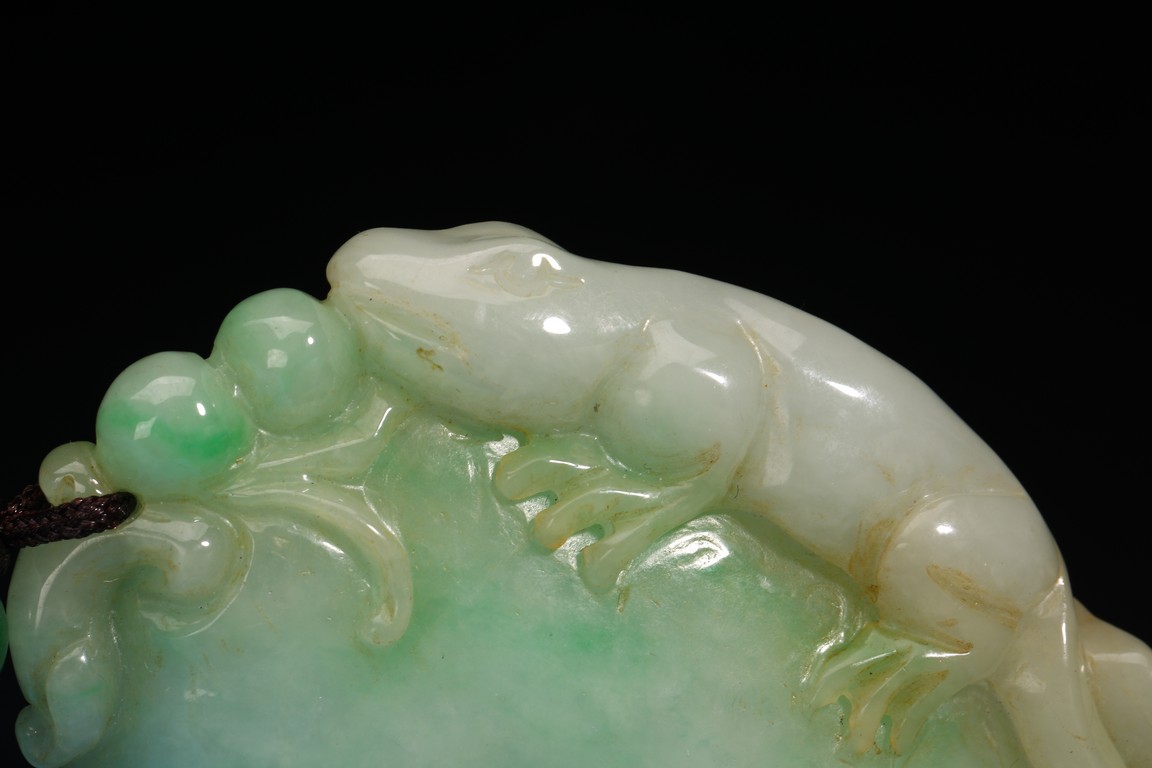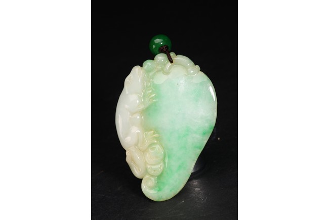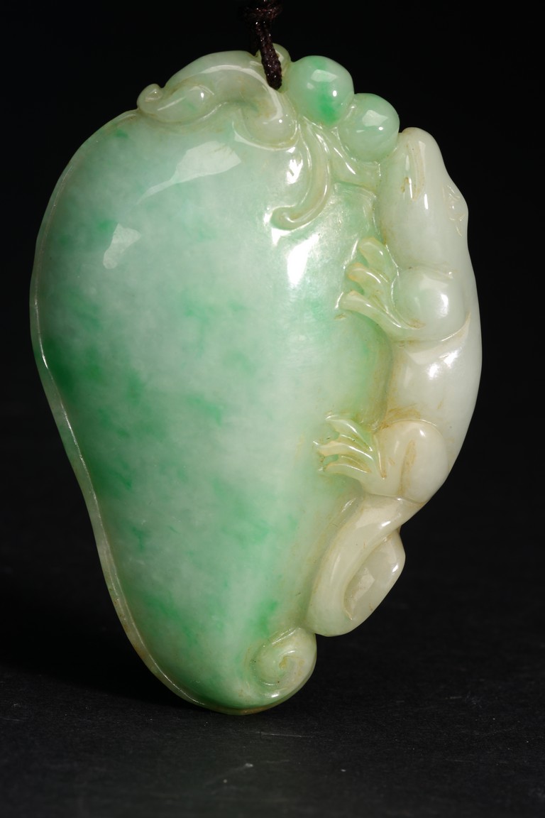 此吊墜形似佛手,浮雕一小獸匍匐在其左側,口吐寶珠,輪廓清晰,活靈活現。翠色極佳,翠質細膩。
