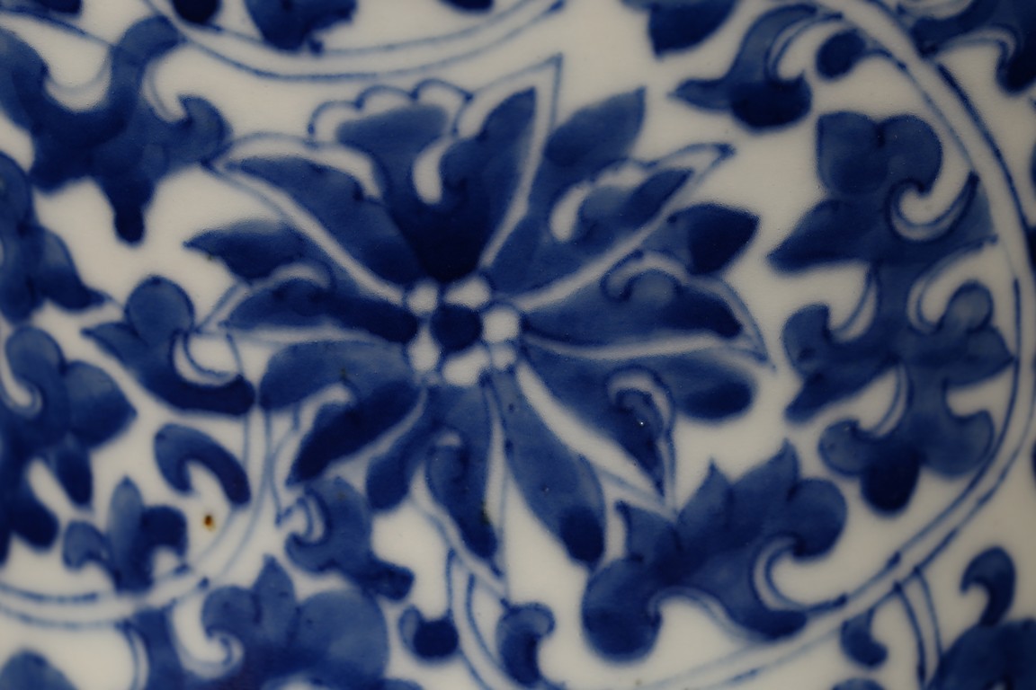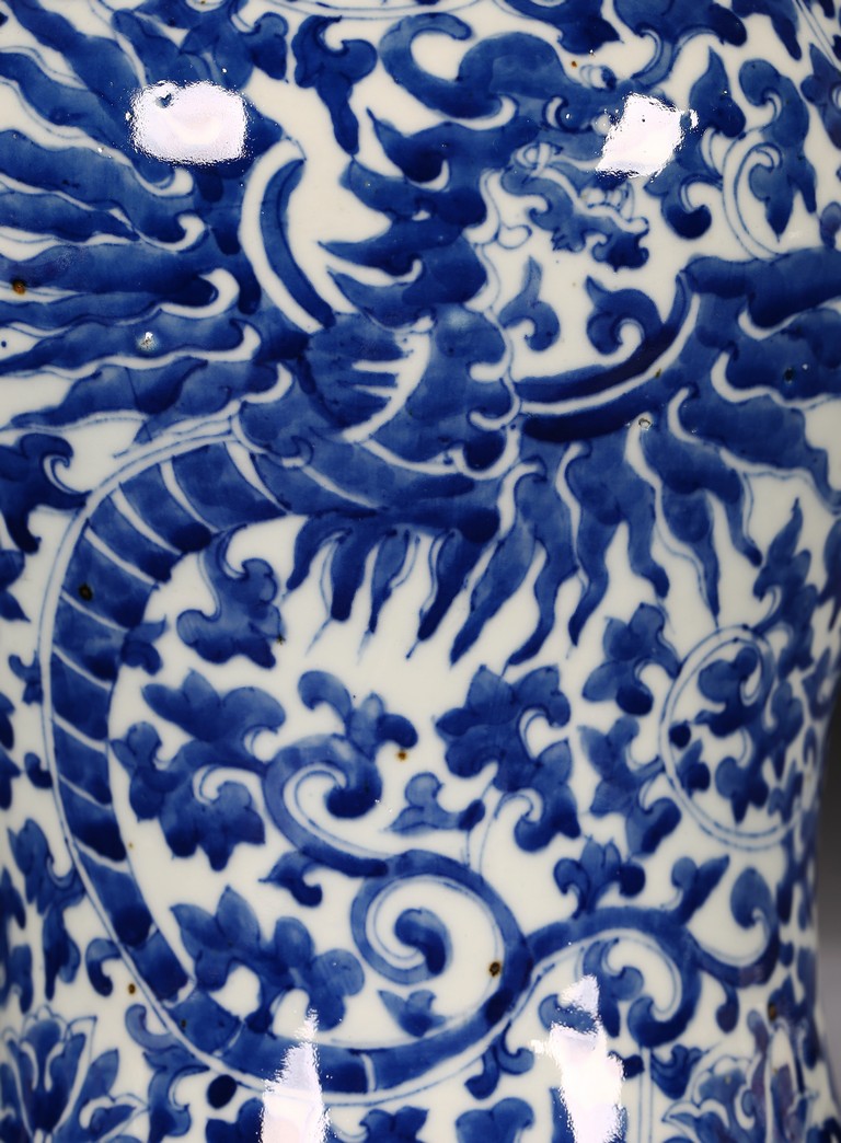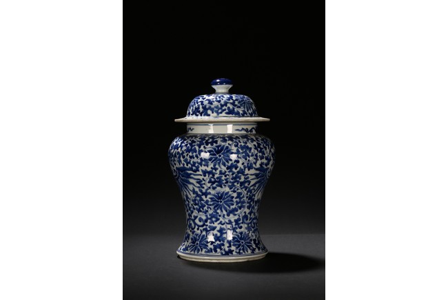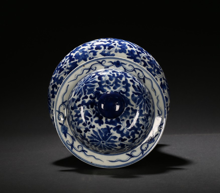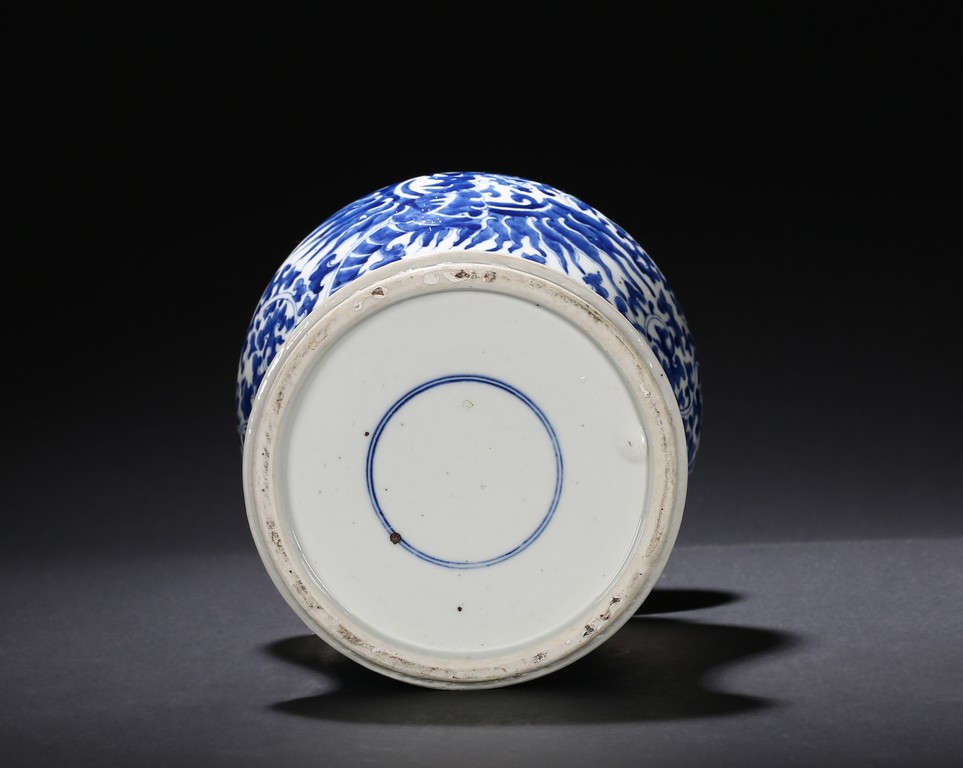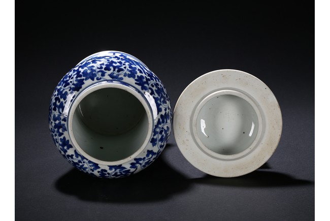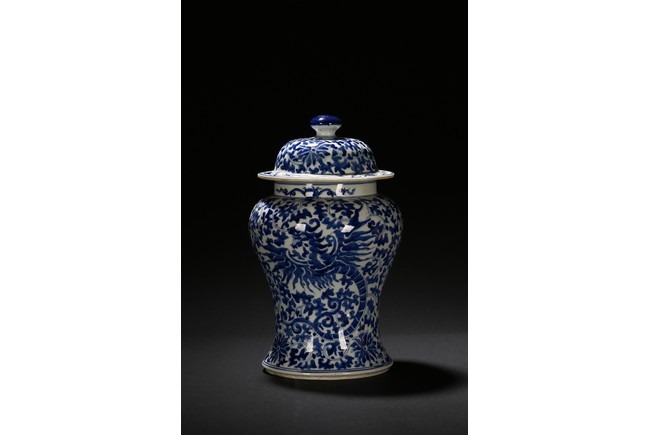 Qing Dynasty period. Of baluster form, brightly painted around the exterior with two mythical beast with dragon head and phoenix body, reserved on a dense leafy lotus scroll ground, the domed cover similarly decorated and surmounted by a circular finial.