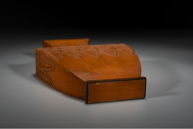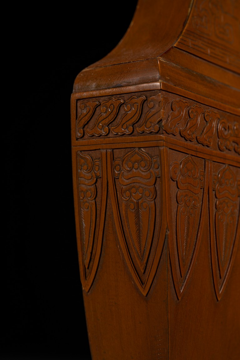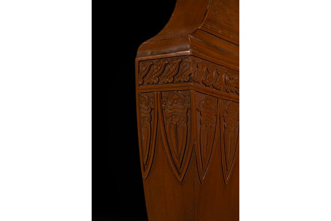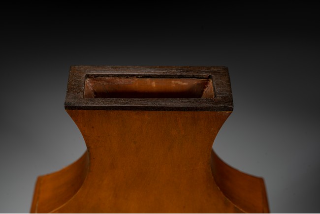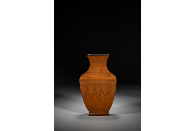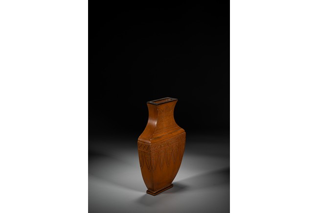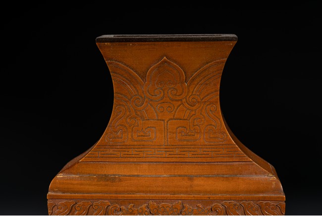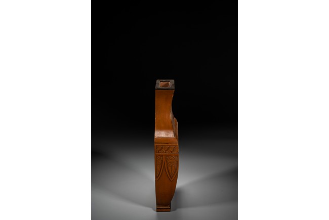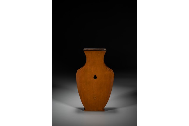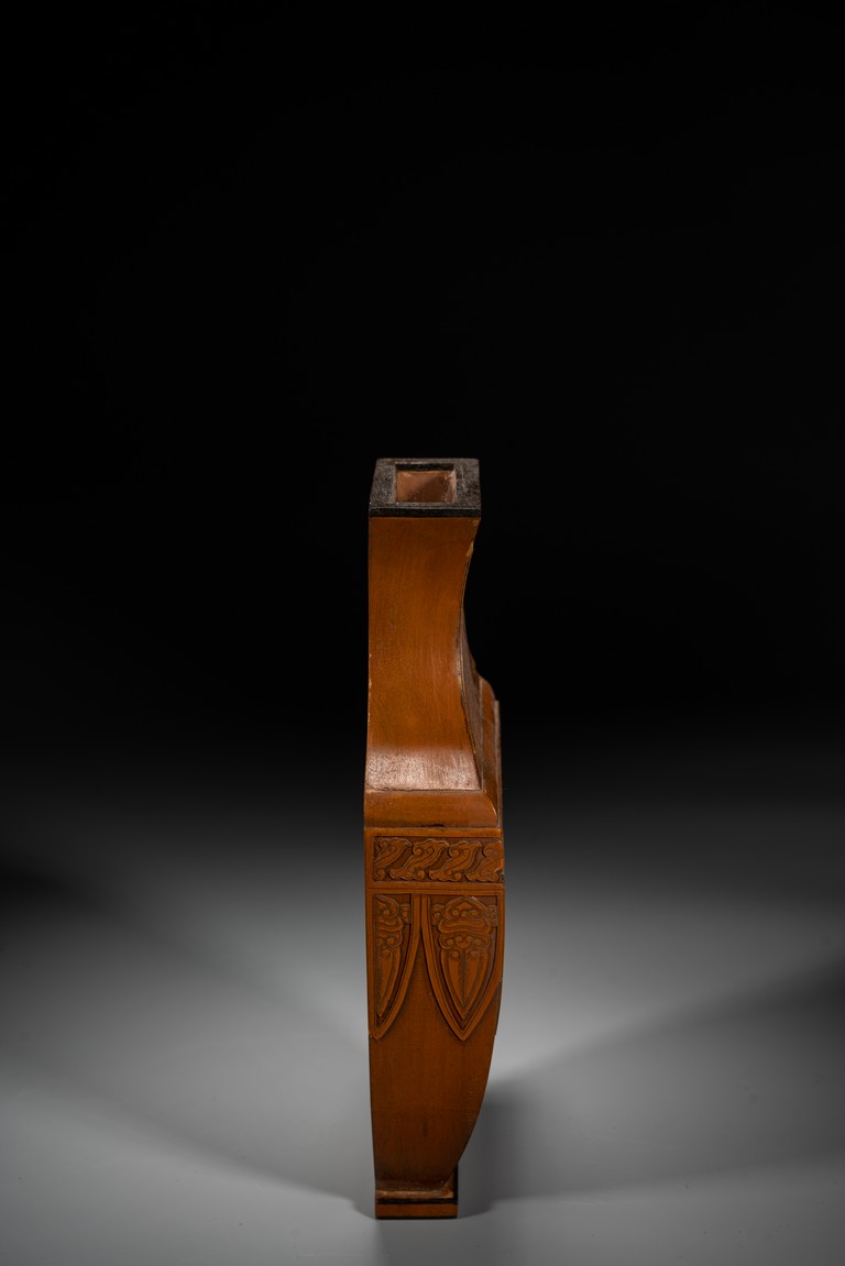 壁瓶,為諸多瓶式的一種,以掛於壁面而名,又稱“轎瓶”、掛瓶。器型為常見花瓶、尊等豎部的一半,靠壁一面平坦有孔,以利於懸掛於墻壁上,做陳設之用,自古壁瓶多見瓷器、銅器,此件竹貼黃壁瓶甚是少見,且工藝精湛細膩,實屬難得。